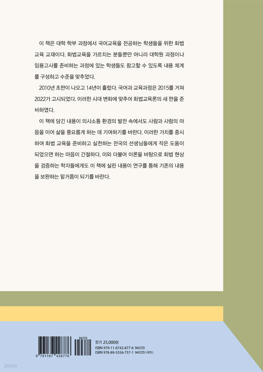 1_화법의 특성 2_화법의 성격 3_화법의 유형 4_화법의 요소 제2장 수용과 생산 과정으로서의 화법 1_의미 수용 과정으로서의 듣기 2_의미 생산 과정으로서의 말하기 3_비언어적 의사소통 제3장 사회적 상호 작용 1_참여자 인식 2_대인 관계의 형성과 발전 제4장 의사소통 점검과 조정 1_의사소통 점검의 필요성 2_담화 구조와 전개 과정 점검 제5장 화법의 정의적 요인과 의사소통 윤리 1_정의적 요인과 듣기·말하기 태도 2_말하기 효능감 3_말하기 불안 4_대화 성찰 태도 5_다문화 시대의 의사소통 윤리 제6장 화법 교수·학습과 평가 1_교수·학습 방법 2_평가 제7장 대화 교육 1_대화의 특성 2_대화의 원리 제8장 면접 교육 1_면접의 개념과 중요성 2_면접에 대한 관점 3_면접 질문의 유형과 특성 4_효과적인 면접 답변 전략 제9장 토의 교육 1_토의의 성격과 토의 교육의 목표 2_토의의 유형과 절차 3_토의 사회자와 참여자의 역할 제10장 토론 교육 1_토론의 성격 2_토론의 논제와 쟁점 3_토론의 단계별 전략 제11장 협상 교육 1_협상의 개념과 성격 2_협상의 유형과 특징 3_협상 단계와 협상 전략 제12장 발표 교육 1_발표의 내용 구성 2_표현과 전달 방법 3_매체 자료 활용 4_청중과 상호작용 제13장 연설 교육 1_연설의 특성 2_연설 준비 과정과 절차 3_연설의 실행 과정 4_연설의 표현 및 전달 방법 제14장 스토리텔링 교육 1_스토리텔링의 개념과 힘 2_효과적으로 이야기하는 방법 3_뛰어난 이야기꾼(스토리텔러)의 조건 4_학교에서 이야기하기 교육 5_실제 이야기꾼 되어보기 |