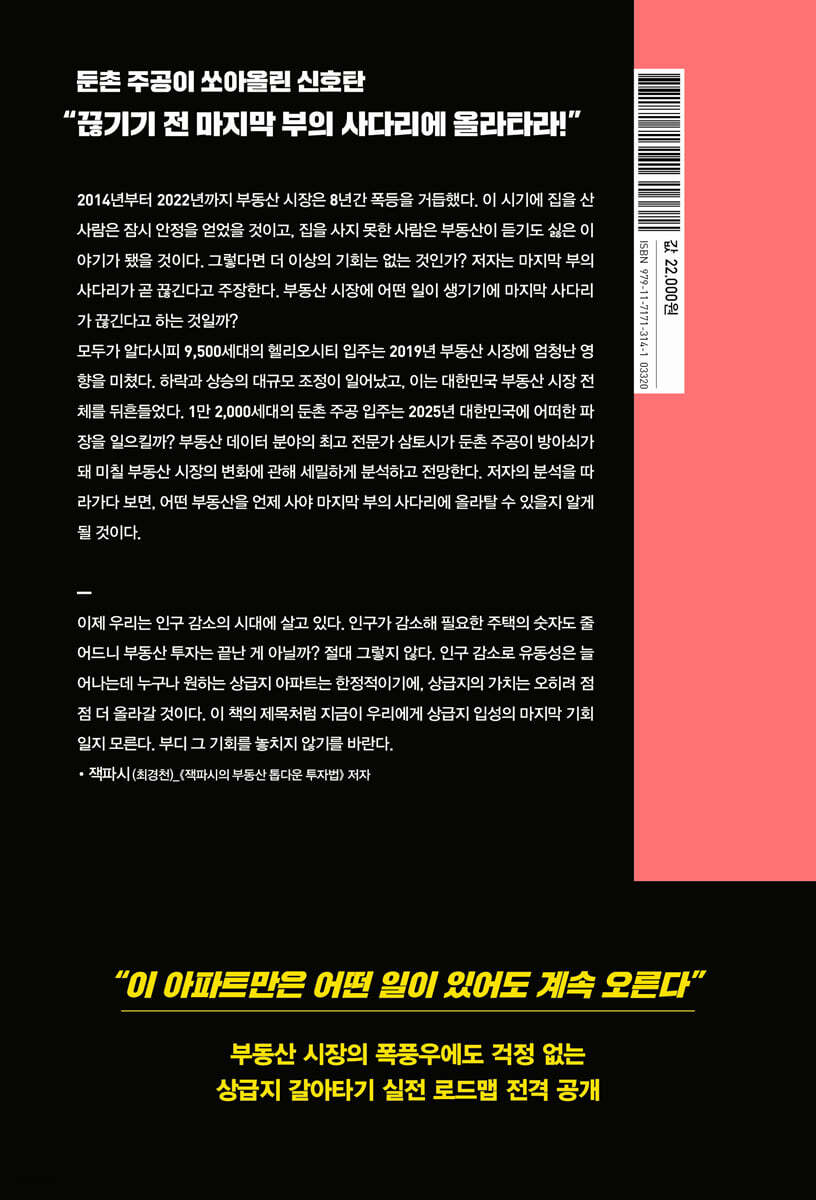 1부 빅데이터로 짚어보는 부동산 투자 타이밍 1장 상승과 하락에 영향을 주는 요인 2008년과 2022년에 부동산이 하락한 이유 | 급락 이후 부양책이 미치는 효과 | 2010년 이후와 2024년 이후는 다르다! | [다른 각도로 들여다보기] 규제의 아이러니 2장 둔촌 올림픽파크포레온 입주는 다가올 위기이자 기회 서울 아파트, 첫 번째 기회 | 서울 아파트, 앞으로의 기회 | 헬리오시티와 둔촌 올림픽파크포레온의 데자뷔 | [다른 각도로 들여다보기] 강남 3구 입주 물량의 의미 3장 대한민국 부동산의 정해진 미래 다섯 가지 1. 공급 부족 | 2. 오버슈팅 | 3. 공급 부족과 금리 인하가 만날 때 | 4. 3기 신도시 입주 | 5. 초양극화 시대 | [다른 각도로 들여다보기] 전세가율에서 얻는 인사이트 4장 서울에만 집착하지 마라 서울 인구 감소의 뒷배경 | 서울 핵심지는 어나더 레벨의 길로 | 서울 비핵심지보다는 경기 핵심지 | [다른 각도로 들여다보기] GTX 개통과 빨대 효과 그리고 서울 집중 현상 5장 지방에서 새로운 기회를 잡아라 부산, 상급지 위주로 접근하라 | 대구, 향후 공급 감소를 활용하라 | 인천, 일자리가 늘어나는 곳을 중심으로 접근하라 | 대전, 2022년 인허가 물량이 착공으로 이어질지 관찰하자 | 광주, 조정 이후 공급 부족 장기화의 힘이 발휘될 것 | 울산, 부산처럼 상급지 위주로 접근하라 | 그래서 사야 할 곳은? | [다른 각도로 들여다보기] 2018년 주택임대사업자 등록 물량들은 2026년 만기 이후 매물로 나올까? 6장 아파트 추천 기준 다섯 가지 직주근접 | 학군 | 주변 인프라 | 신축 대단지 2부 어디를 사야 할까? 7장 입지 개선으로 많이 오를 곳 GTX-A | GTX-C | 9호선 연장 | 신안산선 | 월곶판교선 8장 서울 추천 단지 직주근접 | 직주근접 개선 | 학군 | 대형 백화점 | 대형 병원 | 신축 대단지 9장 경기도 추천 단지 직주근접 | 직주근접 개선 | 학군 | 대형 백화점 | 대형 병원 | 신축 대단지 10장 대구 추천 단지 직주근접 | 학군 | 대형 백화점 | 대형 병원 | 신축 대단지 11장 인천 추천 단지 직주근접 | 학군 | 대형 백화점 | 대형 병원 | 신축 대단지 12장 부산 · 대전 · 광주 · 울산 추천 단지 부산 | 대전 | 광주 | 울산 에필로그_다가오는 티핑포인트 |