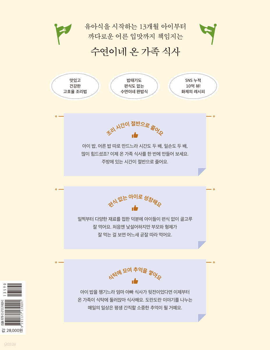 그래제본소 단행본 펀딩 15,980% 최고액을 달성한 화제의 요리책! 인스타그램 70만 팔로워! SNS에서 수많은 엄마들의 찬사를 받았던 13개월 아이부터 어른 입맛까지 사로잡는 수연이네 온 가족 식사 레시피 103가지를 담았다.