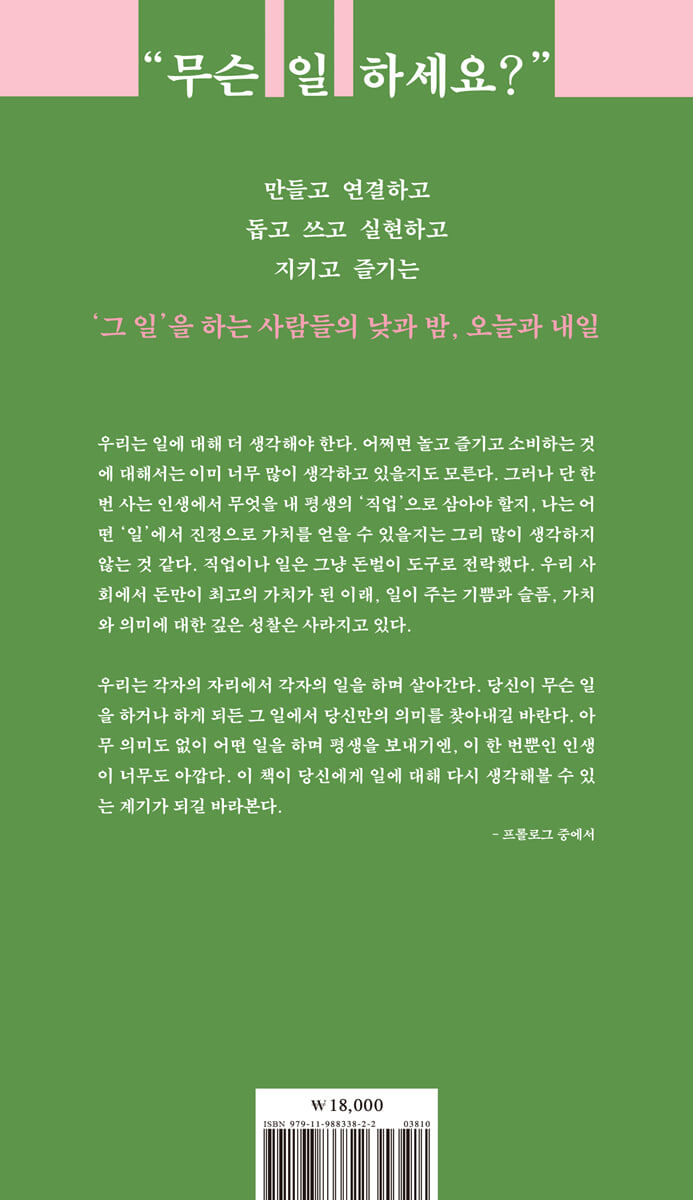 평범하지만 특별한 ‘그 일’을 하는 사람들의 진심 어린 성찰과 대답 많은 사람들은 지금 하고 있는 일 중심으로 스스로를 소개하고 규정한다. 그만큼 우리 삶의 중심은 ‘일’ 또는 ‘업(業)’에 있다. 학교 공부와 청년 시절은 앞으로 하게 될 일과 직업을 준비하는 데 대부분 할애되고 있다고 해도 과언이 아닐 것이다. 이렇게 중요한 일 그리고 직업에 대해 우리는 얼마나 진지하게 생각하고 임하고 있을까. 에세이 모음집 《그 일을 하고 있습니다》는 일하는 사람으로서의 자신을 존중하고 사회적인 관계에서 바라보는 마음을 담은 책이다. 국회의원 보좌관, 변호사, 사회복지사, 보건교사, 책방지기, 말 수의사, 보드게임 개발자, 비디오게임 개발자, 메디컬라이터, 인공지능 리서치 엔지니어, 유튜브 크리에이터, 미술대학 입시 컨설턴트, 전시 기획자, 투자 상담가, 인사 담당자 등 이 책에 참여한 열다섯 명의 직업인들 면면은 다채로우며 경력도, 일하는 현장이나 일의 성격도 모두 다르다. 다만 그 일이 무엇이든 자신의 자리에서 묵묵히 그리고 최선을 다해 하루하루를 살아가며 나름대로의 가치를 찾고 있다는 점만은 같다. 수입이나 사회적인 지위 같은 기준이 아닌, 그 일을 하고 있는 사람만이 느끼고 알 수 있는 기쁨과 슬픔, 평범하면서도 특별한 그 일의 의미를 진솔하게 펼쳐 보인 글들을 통해 우리의 하루 대부분을 차지하고 있는 일하는 시간과 마음에 대해서 다시 한 번 생각해볼 기회가 될 것이다. 우리는 일에 대해 더 생각해야 한다. 어쩌면 놀고 즐기고 소비하는 것에 대해서는 이미 너무 많이 생각하고 있을지도 모른다. 그러나 단 한 번 사는 인생에서 무엇을 내 평생의 ‘직업’으로 삼아야 할지, 나는 어떤 ‘일’에서 진정으로 가치를 얻을 수 있을지는 그리 많이 생각하지 않는 것 같다. 직업이나 일은 그냥 돈벌이 도구로 전락했다. 우리 사회에서 돈만이 최고의 가치가 된 이래, 일이 주는 기쁨과 슬픔, 가치와 의미에 대한 깊은 성찰은 사라지고 있다. - 프롤로그 중에서 열다섯 명의 작가들은 자신의 일과 직업에 대해 글을 쓰고 함께 살펴보고 합평한 후 수정하는 과정을 수개월 동안 거쳐 《그 일을 하고 있습니다》를 함께 만들었다. 그런 만큼 그 어디서도 들을 수 없는 일하는 사람의 속내와 직업의 이면까지 깊이 있고 정확하게 다룬 글들이다. 또 각각의 직업과 일을 낮, 밤, 새벽 등 세 부분으로 나누어 다루고 있는데, 우선 ‘낮’ 부분에서는 그 직업의 현실적인 면과 고충, 성격, 고민을 구체적으로 살펴본다. ‘밤’ 부분에서는 일의 가치와 보람, 꿈과 목표 등을 솔직하게 털어놓는다. ‘새벽’ 부분에서는 해당 직업인이 되기 위해서 어떤 자격과 과정이 필요한지, 어떤 사람에게 그 직업을 권하는지, 10년 후에도 그 일을 하고 있을지 또 앞으로의 어떤 변화가 있을지, 그 일을 잘하려면 어떤 능력과 노력이 필요한지 등 사람들이 궁금해야 할 지점들에 대해 자세하게 소개한다. 사회적인 관계와 돌봄, 공동체의 성장을 꿈꾸며 국회, 정당, 선거 캠프 등에서 20여 년간 일해온 정필 작가는 국회의원 보좌관의 일을 ‘세상을 움직일 수는 없지만 사람을 움직이는 일’이라고 말한다. 국회의원의 의정 활동을 지원하고 사회적인 이슈들을 살펴보기 위해 “수십 장의 질의서를 작성하고 수백 명의 기자들을 상대하며 온라인상에서 수천 명의 국민들을 모니터링”하며 변화를 꿈꾸지만 세상은 쉽게 움직이지 않고 오히려 좌절하는 일이 반복된다. 하지만 그러한 무력감을 이기는 것은 곧 보좌관이 국민을 위해 일하는 직업이라는 자부심과 책임감 때문일 것이다. 변호사로서의 자신의 일이 대체로 ‘미움받는 일’이라고 고백하는 정지우 작가는, 그럼에도 주관적인 감정이나 이익이 아닌 객관적인 정의에 따라 ‘사회적인 생명을 찾아내고 지키는 일’이라는 점을 강조한다. 누군가의 절망적인 상황을 함께 살펴봐주고 해결하는 데 도움이 되도록 동행하는 변호사라는 직업을 통해 정의와 삶과 인간에 대해 배워가는 것이 많다고 설명한다. 전세계를 강타한 코로나19 바이러스는 거의 대부분의 직업에 영향을 미치고 우리 삶의 방식도 크게 바꾸어놓았지만 무엇보다 지역사회와 공동체의 존재 이유와 사회적인 돌봄 서비스의 역할을 고민해볼 숙제도 던졌다. 사회복지사 김재용 작가는 이 시기 복지 사각지대와 공백을 찾아내고 변화에 발빠르게 대응하기 위해 고군분투했던 경험을 구체적으로 털어놓는다. 그저 ‘좋은 일’이 아니라 전문성과 책임의식을 강화하기 위해 노력하는 것은 곧 개인과 사회의 가치를 일치시키고 행복한 사회를 만드는 ‘행복한 사회복지사’를 꿈꾸기 때문이다. 돌봄과 관심이 가장 필요한 곳 중 하나가 학교이기에 보건교사 이명옥 작가는 몸과 마음이 아픈 아이들을 치유하고 보살피며 건강한 성장을 돕기 위한 다양한 노력과 시도를 해나가고 있다. 단지 학생들의 건강뿐만 아니라 학교 구성원, 학부모, 지역사회로까지 관심과 실천의 영역을 넓혀 건강과 행복을 관리하는 보건교사라는 정체성을 제시한다. 대학 입시와 관련된 사교육 중에서도 미술대학 