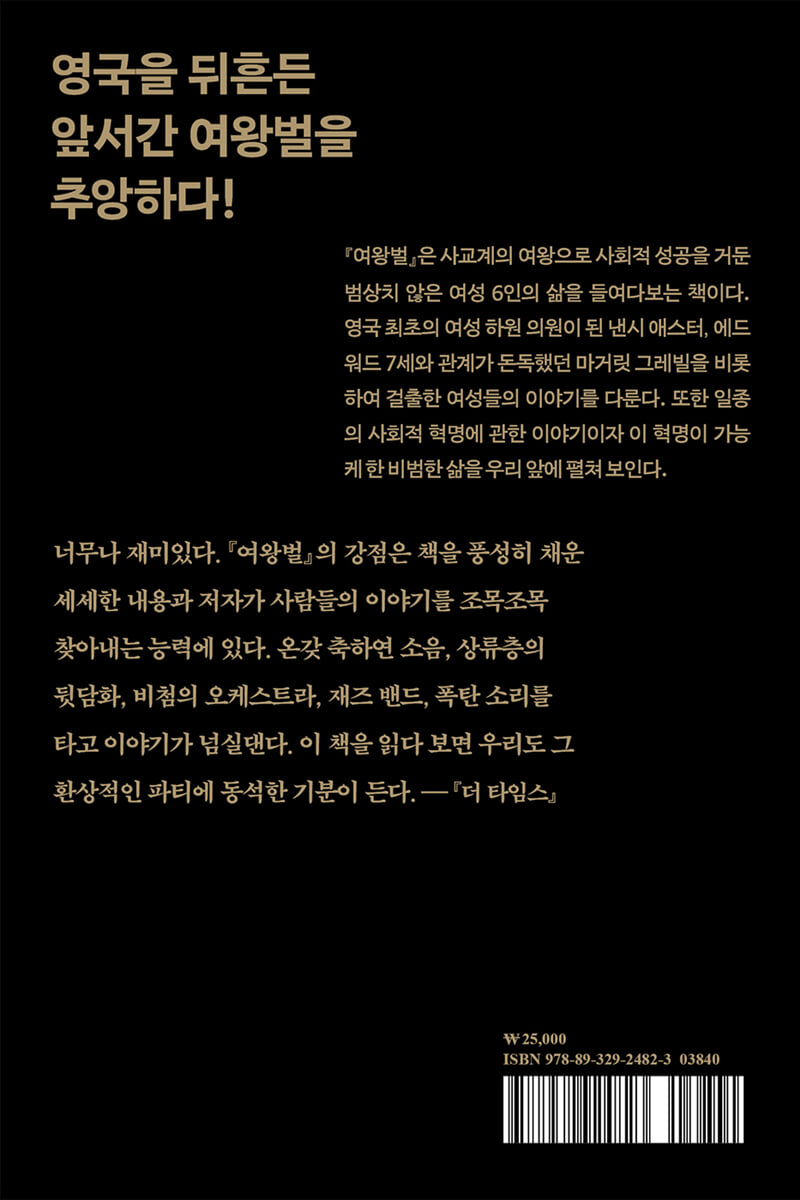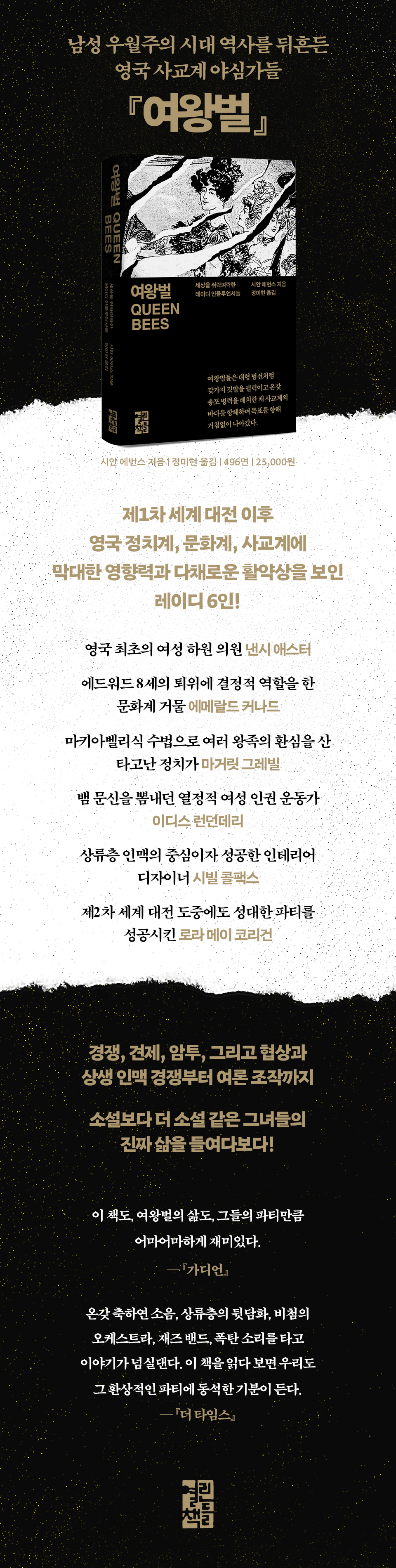 너무나 재미있다. 『여왕벌』의 강점은 책을 풍성히 채운 세세한 내용과 저자가 사람들의 이야기를 조목조목 찾아내는 능력에 있다. 온갖 축하연 소음, 상류층의 뒷담화, 비첨의 오케스트라, 재즈 밴드, 폭탄 소리를 타고 이야기가 넘실댄다. 이 책을 읽다 보면 우리도 그 환상적인 파티에 동석한 기분이 든다. - 『더 타임스』