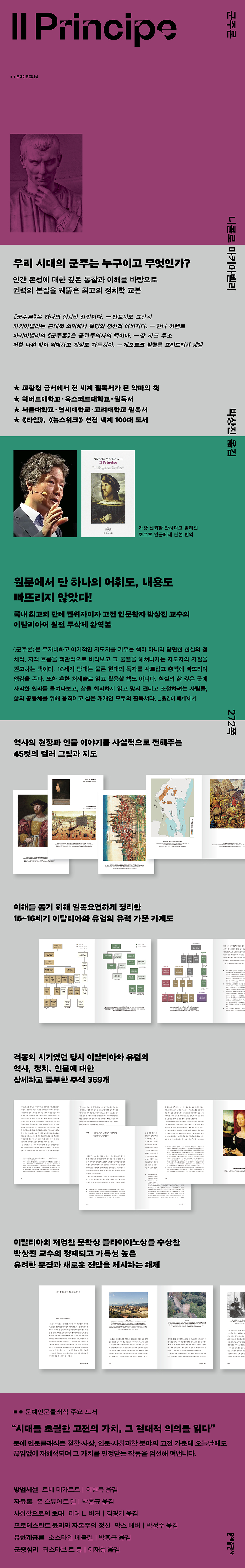 인간 본성에 대한 깊은 통찰과 이해를 바탕으로 권력의 본질을 꿰뚫은 최고의 정치학 교본! 권력의 본질을 이해하는 지침서인가, 폭군을 위한 매뉴얼인가 이탈리아 역사상 가장 격동의 시기에 쓰인 『군주론』의 내용은 충격적이며 동시에 많은 사람이 위험하다고 생각할 정도로 사상, 문학, 정치 전략의 걸작이다. 역사가 페데리코 샤보는 마키아벨리의 『군주론』을 정치학 저서 가운데 가장 널리 읽히고 가장 뜨거운 논쟁을 불러일으킨 책이라고 정의했다. 근대 정치학의 기원인 동시에 서구 사상 발전에 혁혁하게 기여한 책이라는 점을 생각하면 과언이 아니다. 물론 윌리엄 셰익스피어는 ‘마키아벨리’를 사악한 목표를 위해 민중을 즐겨 희생시키는 모략가를 가리키는 용어로 사용했다. 교황청은 오랫동안 『군주론』을 금서로 지정했고 프로테스탄트 개혁자들도 마뜩잖은 책으로 취급했다. 현대에 와서도 히틀러, 무솔리니 같은 독재자가 애독하여 독재자의 교과서라는 비아냥을 들어야 했다. 반면, 루소는 『군주론』을 공화주의자의 책이라고 했고 헤겔은 “더할 나위 없이 위대하고 진실로 가득”하다고 했다. 악마의 책이라 불리며 금서로 지정되었던 책은 500여 년이 지난 지금, 세계 유수 명문대의 필독서가 되었고 정치학 고전을 넘어 리더십 분야의 획기적인 책으로 주목받고 있다. 출간 이후 격렬한 논쟁을 불러일으켰던 이 책은 지금도 여전히 뜨겁다. 45컷의 컬러 그림과 지도, 상세하고 풍부한 해설과 주석, 이탈리아어 원전 완역본 문예출판사의 문예인문클래식 『군주론』은 국내의 대표적인 이탈리아 고전 인문학자이자 단테 권위자인 박상진 교수가 가장 신뢰할 만하다고 알려진 조르조 인글레세 판본을 저본으로 삼아 이탈리아어 원전을 완역했고 풍부하고 상세한 역사, 정치, 인물 설명과 해설을 각주와 해제에 담았다. 박상진 교수는 권모술수, 모략가 등의 이미지로 점철된 마키아벨리에 대한 오해를 씻어내고 공화주의자적 면모와 『군주론』이 가진 현재적 의의 및 우리 시대에 필요한 군주는 누구이고 어떠해야 하는지 등을 해제에 담았다. 또한 45컷의 컬러 그림과 지도, 도표 등 시각 자료를 활용하여 복잡하게 얽힌 15~16세기 이탈리아와 그 주변국의 상황을 설명했다. 당시 15~16세기 이탈리아와 주변국의 정세는 이탈리아 역사상 가장 격동의 시기 중 하나였고, 『군주론』은 당시의 상황에서 어떻게 권력을 잡고 잡은 권력을 유지할지 현실적이고 구체적인 지침을 제공한다. 권력의 본질과 인간 본성에 대한 심오한 통찰 『군주론』은 무자비하고 이기적인 지도자를 키우는 책이 아니라 당면한 현실의 정치적, 지적 흐름을 객관적으로 바라보고 그 물결을 헤쳐나가는 지도자의 자질을 권고하는 책이다. 인간 본성에 대한 깊이 있는 통찰과 이해를 바탕으로 권력의 본질을 파헤치고 있으며, 시대의 요구에 맞춰 재조명되고 그 가치를 인정받고 있다. 복잡하게 얽힌 국내외 정치 지도자는 물론이고 다양한 분야의 리더들에게도 조직을 어떻게 이끌어야 하는지, 리더에게 필요한 전략적 사고는 무엇인지를 제공하며, 위기 속에서 기회를 만들고 불확실성 속에서 길을 열 방법을 제시한다. 갈수록 불확실성이 커지는 현대 사회에서, 위태롭기만 한 국제 정세에서 살아남으려면 우리 모두 『군주론』을 읽어야 한다. 마키아벨리의 현실주의 정치사상 마키아벨리는 천재적인 정치철학자이며 세련된 르네상스인이었다. 당시의 복잡다단한 역사 상황을 예리하게 살피고 정리해 『군주론』에 담았다. 여러 형태의 국가와 정부의 범주를 정의하는 일로 시작하여 풍부한 역사적 사례와 분석을 토대로 권력을 획득하고 유지하는 방법을 조언한다. 그는 『군주론』에서 피할 수 없는 냉엄한 현실을 마주한 정치가로서 군주가 취해야 할 처신의 방향을 적절하게 제시하고, 자기주장을 관철하기 위해 과거의 위대한 역사가 및 철학자들과 논쟁하는 것도 불사한다. 거침없는 언변은 물론이요, 풍부한 논쟁을 불러오는 독특한 생각들이 이 책의 가치이자 매력이다. 특히 마키아벨리는 변화하는 현실 맥락에서 군주를 바라봤다. 추상적이고 형이상학적인 정치 이론이 아니라 변화무쌍한 현실에서 실제로 작동하는 정치 행위에 초점을 맞췄고, 역사의 구체적 현장에서 사례를 구하고 분석의 칼날을 들이댔다. 정치 현장에서는 어떻게 살고 실제로 무엇을 하는가의 현실적 문제가 중요하다고 생각했고 이를 무시하면 군주는 권력을 획득하기도 유지하기도 힘들다. 군주는 선하지 않을 수도 있는 현실 세계의 사람들 앞에서 필요에 따라 자신의 선을 드러내거나 감추고, 사용하거나 사용하지 않는 역량을 발휘해야 한다. 마키아벨리의 『군주론』은 정치 지도자가 어떻게 권력을 효과적으로 획득하고 유지할 수 있는지 실용적이고 냉철하게 접근한다. 모든 것은 민중을 향한다 마키아벨리는 모름지기 군주는 민중의 마음을 얻기 위해 역량을 집중해야 한다고 역설한다. 민중은 지배받지 않으려 할 때 가장 건강하고, 소수 지배층은 민중이 지배받지 않도록 헌신할 때 가장 고결하다. 정치의 목적은 그것이 