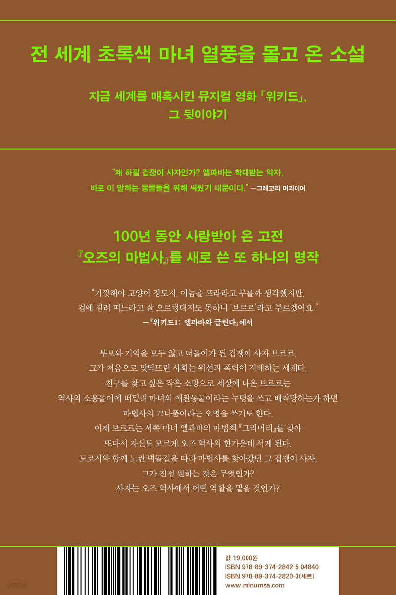 “꿈처럼 초현실적인 이야기에 역사만큼 생생한 현실을 담은 ‘오즈’의 세계는 『반지의 제왕』의 ‘미들어스’처럼 고전의 반열에 오를 것이다.” ―《올버니 타임스 유니언》 부모와 기억을 모두 잃고 떠돌이가 된 겁쟁이 사자 브르르, 그가 처음으로 맞닥뜨린 사회는 위선과 폭력이 지배하는 세계다. 친구를 찾고 싶은 작은 소망으로 세상에 나온 브르르는 역사의 소용돌이에 떠밀려 마녀의 애완동물이라는 누명을 쓰고 배척당하는가 하면 마법사의 끄나풀이라는 오명을 쓰기도 한다. 지금 브르르는 서쪽 마녀 엘파바의 마법책 『그리머리』를 찾아 또다시 자신도 모르게 오즈 역사의 한가운데 서게 된다. 도로시와 함께 노란 벽돌길을 따라 마법사를 찾아갔던 그 겁쟁이 사자, 그가 진정 원하는 것은 무엇인가? 사자는 오즈의 세계에서 어떤 역할을 맡게 될 것인가? “왜 하필 겁쟁이 사자인가? 엘파바는 학대받는 약자, 바로 이 말하는 동물들을 위해 싸웠기 때문이다.” ―그레고리 머과이어 『위키드1: 글린다와 엘파바』에서 시즈 대학교 시절 엘파바는 교실에 잡혀 온 어린 사자 브르르를 실험에서 구해 준 사건이 있다. 그 후 엘파바는 『위키드2: 서쪽 마녀 이야기』에서 서쪽 나라의 마녀가 되는데, 이때 은둔자 엘파바를 찾아온 도로시 일행과 함께 온 바로 그 사자가 브르르였음이 드러난다. 브르르는 어떻게 인간 사회에 나오게 되었으며 또 어떻게 도로시와 안면을 트게 된 것일까? 『위키드3: 리르 이야기』에서 캔들은 리르의 어린 딸을 낳고 사라졌다. 『위키드4: 겁쟁이 사자 이야기』에서는 타임 드래곤과 야클 할멈의 정체가 드러나는데, 그렇다면 오즈의 나라에서 이들의 역할은 무엇일까? 사자 브르르는 엘파바-리르-레인으로 이어지는 트롭 가문의 자손들에게 어떤 연결고리가 되어 줄까? |