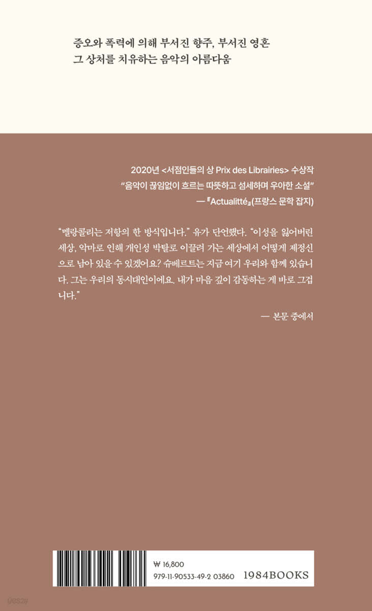 “멜랑콜리는 저항의 한 방식입니다.” 유가 단언했다. “이성을 잃어버린 세상, 악마로 인해 개인성 박탈로 이끌려 가는 세상에서 어떻게 제정신으로 남아 있을 수 있겠어요? 슈베르트는 지금 여기 우리와 함께 있습니다. 그는 우리의 동시대인이에요. 내가 마음 깊이 감동하는 게 바로 그겁니다.”