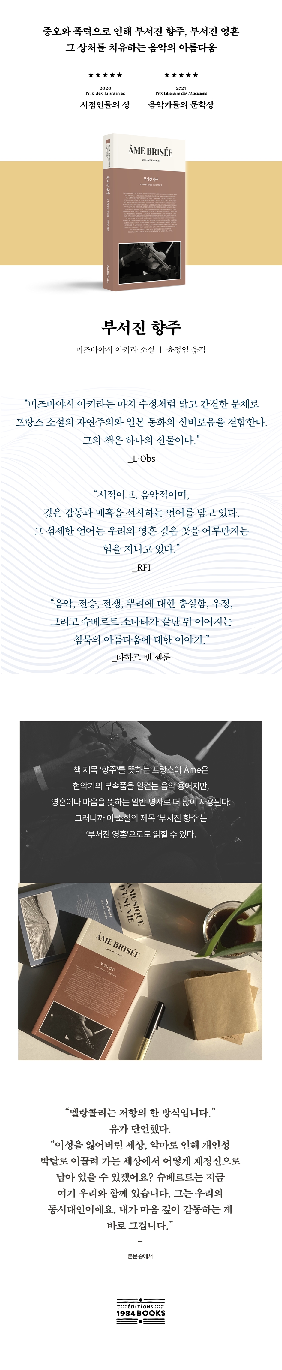 2021년, [음악가들의 문학상 Prix Litteraire des Musiciens] 수상 증오와 폭력에 의해 부서진 향주, 부서진 영혼 그 상처를 치유하는 음악의 아름다움 1938년 도쿄, 서양 클래식 음악에 열정을 가진 네 명의 아마추어 연주자들이 정기적으로 모여 현악 4중주를 연습한다. 일본인 영어 교사인 ‘유’를 중심으로, 중국 유학생인 ‘양펜’, ‘쳉’, ‘강’이 함께하며 음악을 통해 경계를 넘어서는 우정을 쌓는다. 그러나 전쟁의 긴장이 고조되던 어느 날, 일본 군인들의 난입으로 연습은 강제로 중단되고, 유의 바이올린은 산산조각 난다. 네 명의 연주자는 반역 혐의로 체포되고, 유의 아들, 11살 소년 ‘레이’는 옷장에 숨어 이 모든 참혹한 광경을 지켜본다. 아버지의 부재와 부서진 바이올린은 그의 삶에 깊은 상처를 남기고, 이 사건은 그의 생애를 송두리째 바꾸는 전환점이 된다. 소년 레이는 아버지의 부서진 바이올린 조각을 간직한 채 성장하며, 현악기 제작자의 길을 걷는다. 바이올린 복원을 통해 그는 잃어버린 시간과 기억을 복원하고, 음악이 단순한 예술의 영역을 넘어 인간의 상처를 치유하고 사람들을 연결하는 강력한 힘을 지니고 있음을 깨닫는다. 음악은 그에게 아버지와의 단절된 시간을 이어주는 매개체이자, 삶과 죽음을 넘어 새로운 의미를 부여하는 존재가 된다. 『부서진 향주』는 개인적 상처와 시대적 비극을 넘나들며, 기억, 상실, 애도의 문제를 탐구한다. 이 작품은 음악과 문학이라는 두 예술 형태를 통해 시간이 흐르면서도 변하지 않는 삶의 본질과 인간의 회복력을 그려내는데, 이전작 『다른 곳에서 온 언어』에서 다뤘던 문학과 음악의 상호작용이 다시 등장하며, 삶과 죽음을 잇는 예술의 깊이를 한층 심화시킨다. 음악과 문학을 통해 전쟁과 폭력으로 훼손된 세계를 치유하고, 인간의 회복 가능성을 강렬하게 드러내는 『부서진 향주』 속 미즈바야시 아키라의 문체는 섬세하면서도 강렬하며, 독자들에게 한 편의 음악적 서사시를 읽는 듯한 경험을 선사한다. 전쟁과 상실의 비극 속에서도 삶과 예술의 아름다움을 발견하게 만드는 작품으로, 깊은 감동과 여운을 남긴다. |
