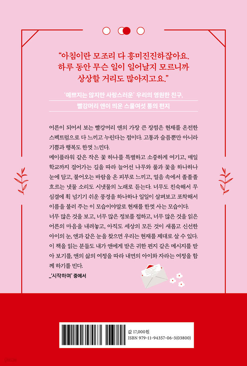 《빨강머리 앤》 시리즈 미리 알기 앤이 보낸 첫 번째 편지: 나는 내 자신이 되기로 결심했어요 - 내 속엔 내가 너무 많아 - 행복을 선택하는 능력 - 기다림은 기쁨의 절반 - 괜찮지 않아도 괜찮다 - 세상을 다르게 감지하는 능력 - 언어로 담아낼 수 없는 것 - 우리를 설레게 한 앤의 문장들 앤이 보낸 두 번째 편지: 때로는 사랑을 받아들일 줄도 알아야 해요 - 《빨강머리 앤》의 진짜 주인공 - 매슈 아저씨의 스며드는 사랑 - 나와 결이 같은 사람 - 끝없이 받아 주는 사랑 - 환상 속 로맨스 - 나를 믿어 주는 단 한 사람 - 누군가를 떠올리는 시간 - 우리를 설레게 한 앤의 문장들 앤이 보낸 세 번째 편지: 인생은 정말 아름다운 모험이에요 - 인생은 한 편의 희비극이다 - 여성으로 사는 일에 대하여 - 아이의 눈으로 바라본 세상 - 앤처럼 생각하고 행동하기 - 나만의 섬을 찾아서 - 기도를 한껏 느껴요 - 우리를 설레게 한 앤의 문장들 앤이 보낸 네 번째 편지: 사실은 앤이 진짜 전하고 싶은 말 - 인생의 빛과 그림자 - 완벽한 가족의 모습 - 전쟁이 남긴 상처 - 읽지 않으면 쓸 수 없다 - [초록지붕집의 앤]이 가장 인기 있는 이유 - 홀대받는 작은 존재 - 그러려고 열심히 공부했나 - 우리를 설레게 한 앤의 문장들 추신 |