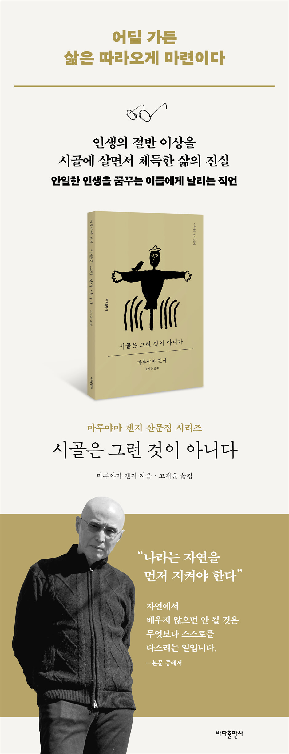 ---pp.24~25 「제2장│경치만 보다간 절벽으로 떨어진다」중에서 당신은 누군가를 돕기 전에 당신 자신을 돕지 않으면 안 됩니다. 그것이 급선무입니다. 그 길은 자신 이외의 다른 사람에게는 절대로 기대지 않는, 단 하나의 방법밖에 없습니다. 당신은 지금껏 오히려 도움을 줘야 할 배우자에게 전적으로 의지하는, 홀로서기와 상반된 길만 걸어온 것입니다. ---p.66 「제6장│고독은 시골에도 따라온다」중에서 농번기에는 이미 마을 전체가 큰 공장으로 바뀐 것처럼 소음으로 뒤덮입니다. 온갖 엔진 소리가 난무하고, 게다가 톤이 일정한 소리 파동 이외에 해로운 새와 짐승들을 쫓아내려고 설치한 폭음기가 내는 소리까지 끊겼다 이어졌다 하면서 더해집니다. 평온함을 바라고 온 당신에게는 짜증 나는 날들이 막을 엽니다. ---p.72 「제7장│시골은 그런 것이 아니다」중에서 시골은 인구가 적어 시골 사람들은 늘 변화와 자극에 굶주려 있습니다. 그들은 지역 주민 모두의 성장 과정부터 최근 움직임에 이르기까지 시시콜콜 다 꿰뚫고 있습니다. 그러고도 무료하기 짝이 없는 일상인데, 마침 당신들이 나타나 순식간에 좋은 표적, 먹잇감이 됩니다. ---pp.115~116 「제9장│심심하던 차에 당신이 등장한 것이다」중에서 오히려 늙었을 때 가능한 한 모든 방법을 써서 건강을 확실히 유지하는 사람의 즐거움이야말로 진정한 삶의 희열입니다. 자신만 알 수 있는, 말로 설명할 수 없는 생명의 충만감을 느낄 수 있습니다. ---p.175 「제12장│시골에 간다고 건강해지는 건 아니다」중에서 |