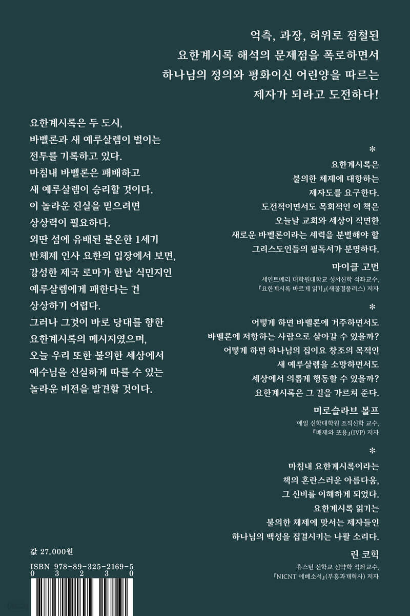 성경에서 가장 당혹스러우면서도 희망이 서려 있는 본문을 다룬 너무나 흥미롭고 흡인력 높은 책이다. 어떻게 하면 바벨론에 거주하면서도 바벨론에 저항하는 사람으로 살아갈 수 있을까? 어떻게 하면 하나님의 집이요 창조의 목적인 새 예루살렘을 소망하면서도 세상에서 의롭게 행동할 수 있을까? 요한계시록은 그 길을 가르쳐 준다. - 미로슬라브 볼프 (예일 신학대학원 조직신학 교수, 예일 신앙과문화연구소 소장, 『배제와 포용』(IVP) 저자)