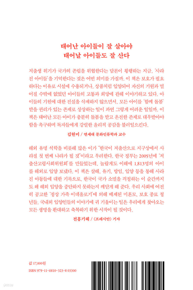 해외 유명 석학을 비롯해 많은 이가 “한국이 저출산으로 지구상에서 사라질 첫 번째 나라가 될 것”이라고 우려한다. 한국 정부는 2006년에 ‘저출산고령사회위원회’를 만들었는데, 놀랍게도 이해에 1,813명의 아이를 해외로 입양 보냈다. 이 책은 살해, 유기, 방임, 입양 등을 통해 사라진 아동들에 대한 기록으로, 한국이 국가 소멸을 걱정하는 이 순간까지도 왜 해외 입양을 중단하지 못하는지 깨닫게 해 준다. 우리 사회에 여전히 공고한 ‘정상 가족 이데올로기’에 의해 배제된 미혼모, 보호 종료 청년들, 국내외 입양인들의 이야기에 귀 기울이는 일은 우리에게 찾아오는 모든 생명을 환대하고 축복하기 위한 시작이 될 것이다. - 전홍기혜 (《프레시안》 기자)