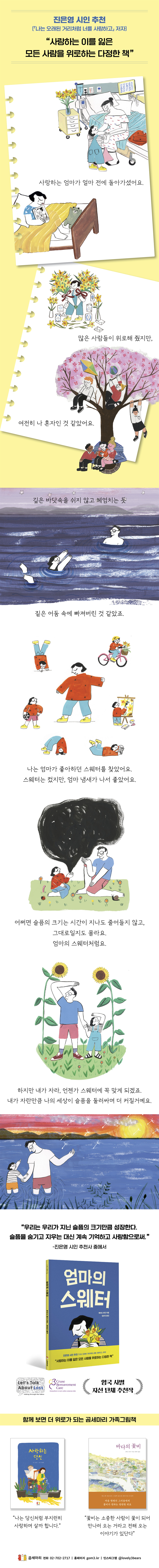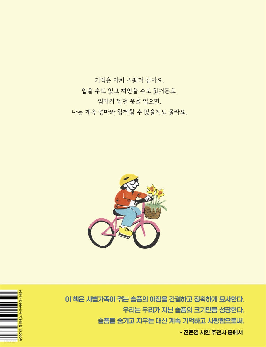 따뜻한 위로가 되어 줄 아이의 일기 『나는 오래된 거리처럼 너를 사랑하고』 진은영 시인 추천작, 영국 사별 자선 단체 2곳 추천작 사랑하는 이를 잃은 모든 사람을 위로하는 다정한 책. 이 그림책은 사별가족이 겪는 슬픔이 여정을 간결하고 정확하게 묘사한다. 우리는 우리가 지닌 슬픔의 크기만큼 성장한다. 슬픔을 숨기고 지우는 대신 계속 기억하고 사랑함으로써. ― 시인 진은영 엄마를 떠나보낸 아이의 깊은 슬픔, 상실을 겪어본 모두가 공감할 이야기 사랑하는 사람을 떠나보낸 적이 있나요? 가족, 친구, 애인, 혹은 사람이 아니라 반려동물일 수도 있겠죠. 나라는 사람을 구성하던 존재가 이 세상에서 사라져 버린다는 것은, 마치 내 몸의 일부가 떨어져나간 것만 같은 아픔일 거예요. 이 그림책의 주인공 아이도 비슷한 슬픔에 빠져 있습니다. 사랑하는 엄마를 떠나보낸 뒤, 많은 사람들의 위로 속에서도 아이는 감정을 갈무리하지 못한 채 이리저리 떠다닙니다. 이 상황이 진짜 같지 않고, 그저 춥고, 피곤하고, 시간이 어떻게 지나갔는지 흐릿하고, 얼마나 슬픈지 대답하기조차 어렵습니다. 마치 깊은 바다에 빠져서 쉬지 않고 수영하고 있는 것 같은 슬픔. 아무 잘못이 없는 친구들을 보면서 느끼는 분노. 이 고통에서 어떻게 빠져나가야 할지 알 수 없는 혼란. 상실을 겪어본 사람이라면 모두가 공감할 감정입니다. 중요한 건 슬픔의 소멸이 아닌 나의 성장 언젠가 스웨터에 꼭 맞게 자랄 나 자신 이런 고통 속에서 아이가 찾은 것은 엄마가 좋아하던 스웨터입니다. 첫 장면에서는 환자복을 입고 있는 엄마의 옆에 가지런히 놓여 있었던 스웨터. 엄마가 참 좋아했고, 그래서 엄마 냄새가 나는 빨간 스웨터를 아이는 입고 다니기 시작합니다. 옷에서 나던 엄마 냄새는 아이의 냄새로 대체되기 시작하고, 결국은 아빠가 스웨터를 빨아야 했죠. 어떤 사람들은 시간이 지나면 슬픔의 크기도 줄어든다고 해요. 하지만 아빠는 그렇게 단순하지 않다고 했어요. 아빠는 슬픔이 엄마의 스웨터 같은 거라고 했어요. 스웨터의 크기는 그대로지만, 나는 거기에 맞게 점점 자랄 거라고요. ― 『엄마의 스웨터』 중에서 슬픔의 크기는 줄어들 수 있을까요? 어쩌면 그럴 수도 있겠죠. 하지만 중요한 건 슬픔의 크기가 아닌 나의 크기입니다. 아이는 점점 자랄 것입니다. 아직은 헐렁한 엄마의 스웨터는 곧 아이의 몸에 꼭 맞게 될 거예요. 스웨터가 작아지기 때문이 아닙니다. 아이가 점점 성장하기 때문이고, 슬픔 속에서도 기쁨을 찾아낼 수 있는 능력을 갖게 되기 때문이지요. 아이는 결국 스스로 깨닫습니다. 스웨터를 꼭 매일 입을 필요는 없다는 것을요. 옷장에 넣어 두면, 스웨터는 없어지지 않고 그 자리에 계속 존재할 것입니다. 그리고 이 세상을 떠난 엄마도 마찬가지입니다. 엄마는 아이의 곁에 그대로 있을 거예요. 하루가 다르게 성장하며 슬픔을 이겨내는 아이를 지켜보면서 말이에요. 타인의 위로가 와닿지 않을 때, 나만의 스웨터를 찾아 보는 건 어떨까요? 하나 기억할 것이 있습니다. 아이 옆에는 아빠가 있었죠. 아빠는 아마도 아이에게 유효한 위로를 줄 수 있는 유일한 사람이었을 것입니다. 아이가 엄마를 잃었듯, 아빠도 소중한 아내를 잃고 깊은 슬픔에 빠져 있었으니까요. 아이가 수영하던 깊은 바다에는 아빠가 함께 있었고, 아이가 그 바다에서 빠져나올 때도 역시 아빠가 함께였습니다. 그러나 상실의 아픔을 같이 견뎌낼 사람 없이 오롯이 혼자 버텨야 하는 사람도 있을 거예요. 그런 이들에게 이 책이 아이의 아빠와 같은 존재가 될 수 있길 바랍니다. 당장 슬픔에서 빠져나오지 않아도 괜찮아요. 잘못 없는 주변인들을 탓하는 감정이 들더라도, 잠깐은 괜찮습니다. 자신만의 스웨터를 찾아보는 것은 어떨까요? 언젠가는 더 단단히 성장할 나 자신을 기대하면서요. |