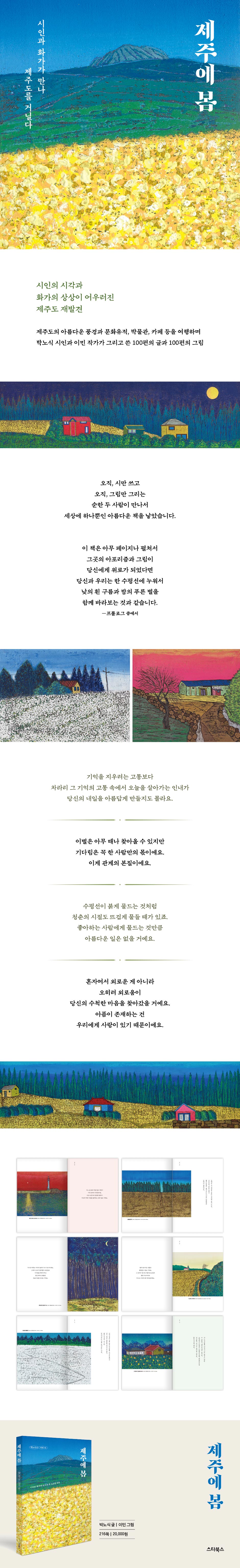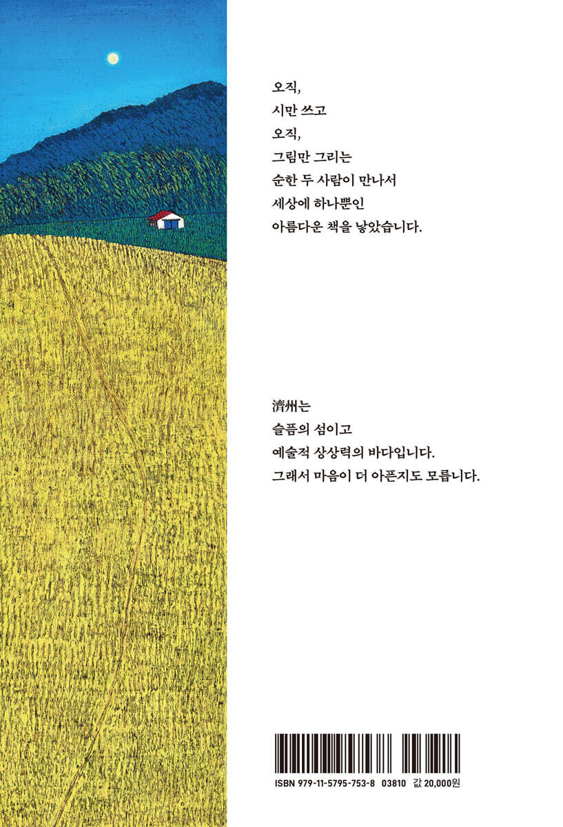시인과 작가가 그린 억겁의 비밀을 간직한 제주도 박노식 시인은 어느 봄날, 꿈속의 그에게 불현듯 나타난 또 다른 그가 했던 말 “한 권 시집도 없이 위로 올라오지 마라!” 그는 이 현몽을 얻고 생업을 접었다. 그리고 독한 마음으로 화순군 한천면 가천마을에 둥지를 틀고 오직 시만 썼다. 《유심》에 「화순장을 다녀와서」 외 4편으로 신인상을 받으며 열정적으로 문단 활동을 시작했다. 고교 시절 5명의 벗들과 동인 〈청년〉을 결성하고 동인지 《사랑》을 발간하기도 한 박노식 시인은 화가인 이민 작가를 만나 의기투합하여 이 책을 함께 기획했다. 이민 화가는 조선대학교 미대 회화과와 일본 동경 다미미술대학 판화과 석사학위 취득 후에 국립현대미술관 아카데미와 국내 여러 대학에서 겸임교수로 재직하였다. 작가는 자신만의 《판타블로 : 판(판화)+타블로(서양화)》라는 특수한 기법을 고안하여 90회가 넘는 개인전을 열었으며 국립현대미술관과 삼성 리움미술관 등 여러 미술관에 작품이 소장되어있다. 저서로는 새로운 목판화기법(공저). 양림동 판타블로. 제주도 랩소디(공저) 등이 있으며 현재 ‘사랑의 열매’ 아너소사이어티 회원이다. 2021-2022. 제주도 이중섭 레지던시 기간 동안 제주 풍경에 몰두하면서 지금까지 서울과 제주를 오가며 왕성한 창작 활동을 하고 있으며 제주도 그림만 1,000점을 목표로 하고 있는 제주를 위한 작가라 할 수 있다. 앞으로 제주도가 어떤 모습으로 그려질지 기대하게 된다. 이민의 그림은 원하는 사람들이 많아 작가가 소장하고 있는 그림이 없어서 실물 보기가 어렵다는 것이 흠이라면 흠이다. |