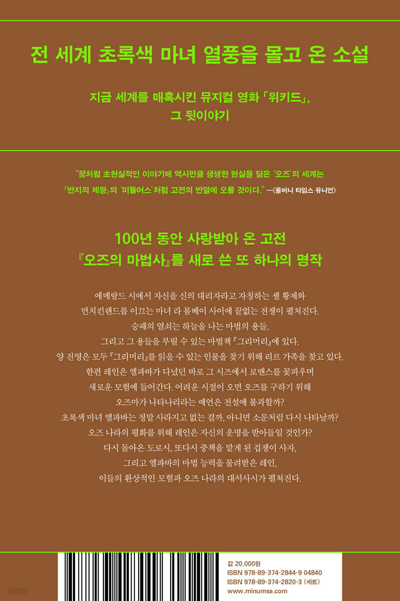 한편 글린다 부인은 에메랄드 시의 분주한 도시 상류사회를 떠나 죽은 남편의 별장이었던 목베거홀에서 한적한 시간을 보내고 있었다. 하지만 오즈 충성령 군대와 먼치킨랜드인 사이에 전쟁이 일어날지도 모르는 시점에서 그곳은 접경 지역이었다. 에메랄드 시는 글린다 부인에게 그곳을 떠날 것을 요청했지만 글린다는 어쩐 일인지 목베거홀을 떠나지 못한다. 그러자 체리스톤 장군이 부대를 이끌고 와서 목베거홀을 점령하고 글린다 부인을 감시하기 시작했다. 엘파바에 대한 존경과 우정을 소중히 간직하고 있는 글린다 부인, 그녀는 『그리머리』의 행방과 어떤 관계가 있을까? 이 와중에 찾아온 타임드래곤 일행은 한바탕 인형극으로 불길한 예언을 보여 주는 바람에 체리스톤의 군인들은 한바탕 술렁인다. 체리스톤 장군의 의도는 무엇이며 그들의 운명은 어떻게 될까? 『위키드』 이야기에서 가장 중요한 키워드는 『그리머리』라는 마법책이다. 이 마법책으로 말할 것 같으면 사람들을 조종하여 스스로 자신을 지켜 나가는 인격체라고 할 수 있다. 이 『그리머리』가 지금 체리스톤 장군의 감시 아래 있게 된 글린다의 손에 들어오게 된다. 글린다가 마법책을 어찌해야 할지 안절부절못하고 있을 때 『그리머리』는 스스로 글린다가 봐야 할 부분을 펼쳐 보인다. “은폐에 관하여”라는 부분이다. 그리하여 마법에는 도통 소질이 없던 글린다가 마법책에 코를 박고 시간을 보내게 된다. 글린다는 자기가 외우면서도 내심 도무지 될 것 같지 않다고 생각하고 있었지만 책은 그런 줄 전혀 눈치채지 못한 듯했다. 글린다가 마지막 음절을 발음하기에 이르자, 책은 돌연 부르르 떨더니 팍 튀어 올랐다. 마치 누군가가 탁자에서 바닥으로 차 버리기라도 한 것 같았다. 글린다는 놀라서 외마디소리를 지르지 않기 위하여 손마디를 이 사이에 깨물었다. 성공이다! 아니, 반항인가? 아무튼 뭔가 됐다. 무슨 일인가가 일어나고 있었다. 『그리머리』는 모습이 바뀌기 시작했다. 글린다가 어떻게 바뀌라고는 말했을 리가 없다. 책은 크기가 줄어들면서 동시에 점점 커졌다. 그리고 발삼나무 잎 색깔이었던 책등이 불타오르는 듯했다. ―『위키드 5: 레인 이야기』에서 글린다의 팔뚝만 한 크기에 살아 있는 생물처럼 움찔거렸던 녹색의 마법책은 그렇게 자신의 모습을 변화시키더니 여느 평범한 책으로 둔갑하는 것이다. 『위키드 4: 겁쟁이 사자 이야기』에서 『그리머리』는 피예로가 왜 죽음을 맞이하게 되었는지를 비롯하여 여러 가지 비밀들을 폭로한 바 있다. 자신을 신이라고 사칭하는 독재자 황제 셸이 그토록 찾고 있는 마법책은 이제 누구의 손에 들어갈 것인가? 학교생활에서 성장통을 겪는 레인, 로맨스를 꽃피우며 사랑에 눈뜨다 에메랄드 시에서 자신을 신의 대리자라고 자칭하는 셸 황제와 먼치킨랜드를 이끄는 마녀 라 몸베이 사이에 끝없는 전쟁이 펼쳐진다. 승패의 열쇠는 하늘을 나는 마법의 용들, 그리고 그 용들을 부릴 수 있는 마법책 『그리머리』에 있다. 양 진영은 모두 『그리머리』를 읽을 수 있는 인물을 찾기 위해 리르 가족을 쫓고 있다. 한편 레인은 엘파바가 다녔던 바로 그 시즈에서 로맨스를 꽃피우며 새로운 모험에 들어간다. 1권에서 초록색 피부의 괴짜 엘파바는 시즈에서 금발머리 글린다와 그녀를 짝사랑하는 보크 사이에서 우정과 짝사랑을 느끼며 성장했다. 『위키드 6: 오즈마 이야기』에서는 엘파바의 손녀인 레인이 바로 그 학교에서 또 한 차례 성장통을 겪게 된다. 어릴 적 엄마 아빠가 누구인지 모른 채 글린다 마님 집에서 하녀처럼 자라나 뒤늦게 부모 품에 안겼지만, 쫓기는 신세인 리르는 전쟁통에 딸이 신분을 숨기고 안전하게 지낼 곳으로 학교 기숙사를 골랐다. 이렇게 레인은 다시 가족과 떨어져 나오지만, 여기서 소년을 만나 우정을 나누며 사랑을 배우면서 사춘기를 겪게 된다. 엘파바의 초록색 피부를 타고난 레인의 본 모습은 언제 드러날 것인가? 레인의 사랑은 결실을 맺을 것인가? "응, 달라지겠지." 레인이 말했다. 레인은 팁에게 자기가 누구인지 말하고, 지금 키아모코로 가는 거라고 했다. 자기 부모님이 아직 살아 있는지 알아보러 간다. 왜냐하면 『그리머리』를 마지막까지 갖고 있었던 게 그들이니까. 그런 다음에, 팁도 자기 못지않게 과거의 비밀을 내놓고 말하기가 싫은 게 분명했기 때문에 레인은 그의 입에 입을 맞추고 잠시 동안 더는 무슨 말이 나오지 않게 하였다. 레인은 입맞춤들을 하나씩 하나씩 하나씩 수집했으나 수를 헤아리지는 않았다. ―그레고리 머과이어, 『위키드 6: 오즈마 이야기』에서 어려운 시절이 오면 오즈를 구하기 위해 오즈마가 나타나리라는 예언은 전설에 불과할까? 초록색 마녀 엘파바는 정말 사라지고 없는 걸까, 아니면 소문처럼 다시 나타날까? 오즈 나라의 평화를 위해 레인은 자신의 운명을 받아들일 것인가? 다시 돌아온 도로시, 말하는 동물로서 중책을 맡게 된 겁쟁이 사자, 그리고 엘파바의 마법 능력을 물려받은 레인, 이들의 환상적인 모험과 오즈 나라의 대서사시가 펼쳐진다. 겁쟁이 사자의 아픈 이별, 리르 부부의