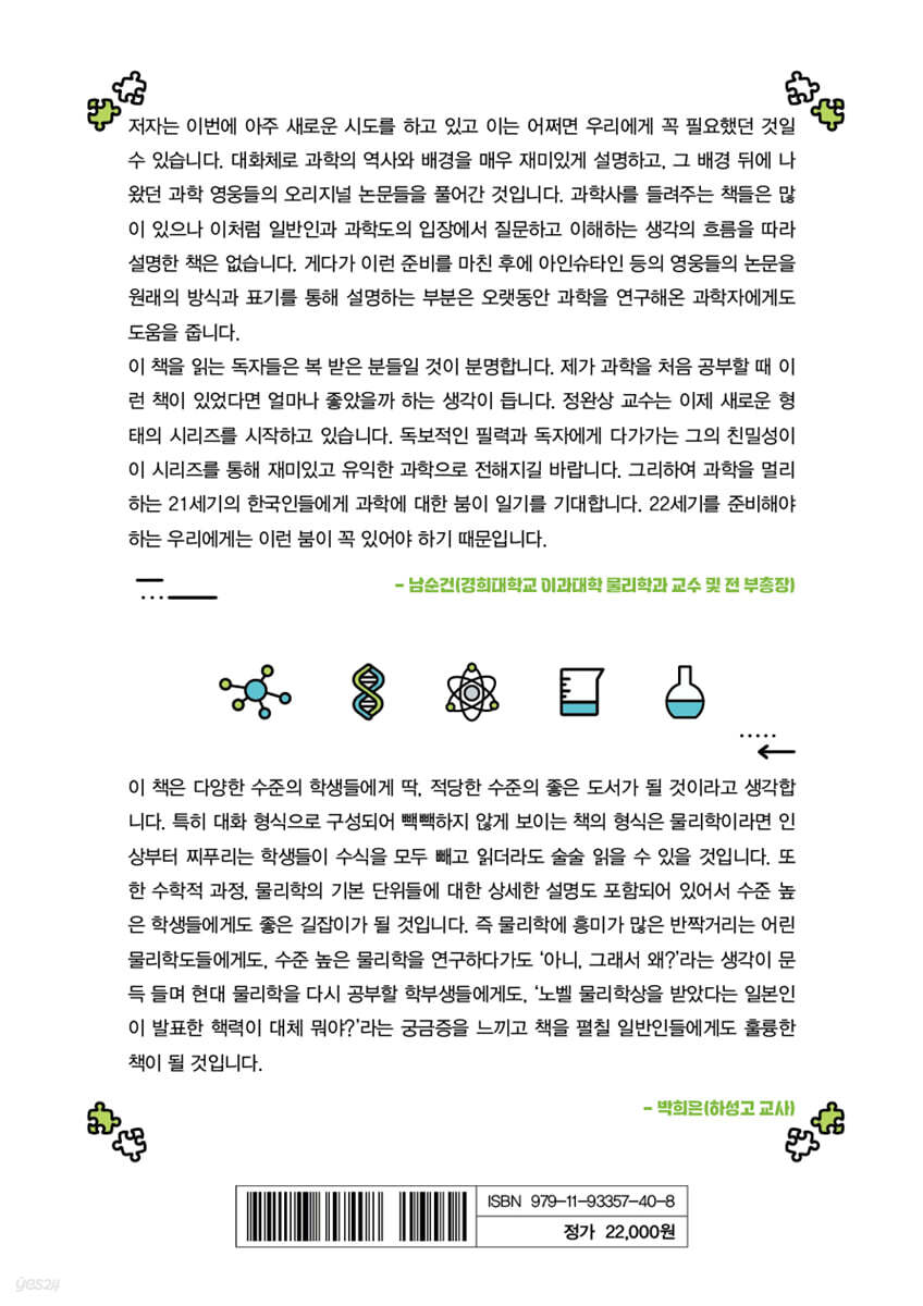 저자는 이번에 아주 새로운 시도를 하고 있고 이는 어쩌면 우리에게 꼭 필요했던 것일 수 있습니다. 대화체로 과학의 역사와 배경을 매우 재미있게 설명하고, 그 배경 뒤에 나왔던 과학의 영웅들의 오리지널 논문들을 풀어간 것입니다. 과학사를 들려주는 책들은 많이 있으나 이처럼 일반인과 과학도의 입장에서 질문하고 이해하는 생각의 흐름을 따라 설명한 책은 없습니다. 게다가 이런 준비를 마친 후에 아인슈타인 등 영웅들의 논문을 원래의 방식과 표기를 통해 설명하는 부분은 오랫동안 과학을 연구해온 과학자에게도 도움을 줍니다. 이 책을 읽는 독자들은 복 받은 분들일 것이 분명합니다. 제가 과학을 처음 공부할 때 이런 책이 있었다면 얼마나 좋았을까 하는 생각이 듭니다. 정완상 교수는 이제 새로운 형태의 시리즈를 시작하고 있습니다. 독보적인 필력과 독자에게 다가가는 그의 친밀성이 이 시리즈를 통해 재미있고 유익한 과학으로 전해지길 바랍니다. 그리하여 과학을 멀리하는 21세기의 한국인들에게 과학에 대한 붐이 일기를 기대합니다. 22세기를 준비해야 하는 우리에게는 이런 붐이 꼭 있어야 하기 때문입니다. - 남순건 (경희대학교 이과대학 물리학과 교수 및 전 부총장)