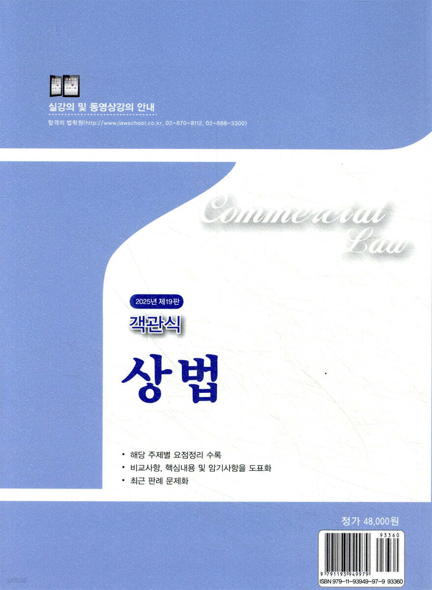 「객관식 상법」 제19판(2025년판)을 출간하게 되었습니다. 이번에도 이전 판들을 작업할 때처럼 역시 수험생들의 합격에 도움이 되는 교재를 만들겠다는 마음으로 개정 작업에 정성을 기울였습니다. 개정판(제19판)은 개정상법[법률 제20436호, 2024.9.20., 일부개정, 2025.1.31. 시행]의 내용을 반영하고, 조문ㆍ판례정리 부분에 2024년도에 시행된 법무사시험을 포함한 각종 시험에 출제된 판례를 추가하고 그리고 핵심문제 부분에 2024년도 시행 법무사시험의 기출문제를 추가 수록하였습니다. 이번 『2025년판(제19판) 객관식 상법』을 작업하면서 중점을 둔 부분은 다음과 같습니다. 1.개정 상법 반영 상법이 법률 제20436호, 2024. 9. 20., 일부개정되어 2025. 1. 31.부터 시행하게 되었습니다. 상법 개정 내용은 현재는 회사의 본점 등기부와 별도로 지점 등기부를 두고 있어 신청인이 지점의 소재지에서 추가로 등기신청을 하여야 하는 부담이 있고 각 등기부가 서로 일치하지 않는 문제가 발생할 수 있으므로, 앞으로는 회사의 지점 등기부를 폐지하고 회사의 본점 소재지에서만 등기하도록 하여 등기의 불일치를 방지하고 등기신청인의 시간적ㆍ경제적 부담을 완화하는 한편, 회사가 본점을 이전한 경우에는 종전 소재지 또는 새 소재지에서 새 소재지와 이전 연월일을 등기하도록 하고, 지점을 이전한 경우에는 본점의 소재지에서 새 소재지와 이전 연월일을 등기하도록 하여 등기절차를 간소화하며, 외국회사가 대한민국에 영업소를 설치하는 경우 등기할 사항을 명확히 규정하고, 전문용어나 잘 쓰지 않는 한자어 등 현행 법률 속 어려운 용어와 일본식 용어를 쉽고 자연스러운 우리말로 대체하는 등 현행 제도의 운영상 나타난 일부 미비점을 개선ㆍ보완하기 위함입니다. 개정판은 상법 개정을 반영하여 정리 부분과 기출문제를 수정하였습니다. 이에 따라 일부 기출문제가 복수정답으로 변경되는 부분이 발생하였습니다. 2.2024년도 시행 법무사시험 기출문제 추가, 개정 상법과 변경된 판례에 따른 기존 기출문제의 수정 및 새로운 문제 추가, 중복된 내용의 문제 삭제 또한 2024년도 법무사시험 기출문제를 추가하였습니다. 또한 기존의 기출문제 중 개정 상법과 대법원 판례(대법원 2021.2.18., 선고, 2015다45451, 전원합의체 판결 등)의 변경으로 정답이 달라지게 된 부분을 수정하였습니다. 3.도표의 수정ㆍ보완 등 그리고 도표를 수정 또는 보완하고, 핵심정리(조문ㆍ판례 정리) 중 부족한 부분을 보충하였습니다. 문제풀이 전에 핵심정리를 먼저 정독하고, 문제를 풀어보는 것이 효율적인 문제풀이 방법이라고 생각합니다. 이 책으로 공부하시는 모든 분들께 도움이 될 수 있기를 간절한 마음으로 바라며, 이 책의 출간을 위하여 고생하신 법학사 이재철 사장님께 감사드립니다. 2024년 12월 2일 편저자 문승진 올림 |