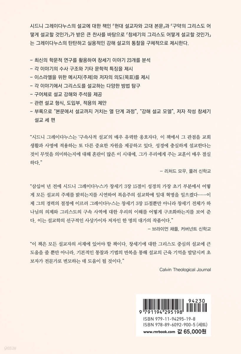 “삼십여 년 전에 시드니 그레이다누스가 창세기 3장 15절이 성경의 가장 초기 부분에서 어떻게 모든 설교의 주제를 밝히는지를 시연하여 복음주의 설교학에 일대 혁명을 일으켰다……이제 그의 경력의 절정에 이르러 그레이다누스는 창세기 3장 15절뿐만 아니라 창세기 전체가 하나님의 의제와 그리스도의 구속 사역에 대한 우리의 이해를 어떻게 구조화하는지를 보여 준다. 이는 설교학의 선구적인 사상가이자 저자인 한 명의 대가의 작품이다.” - 브라이언 채플 (커버넌트 신학교)