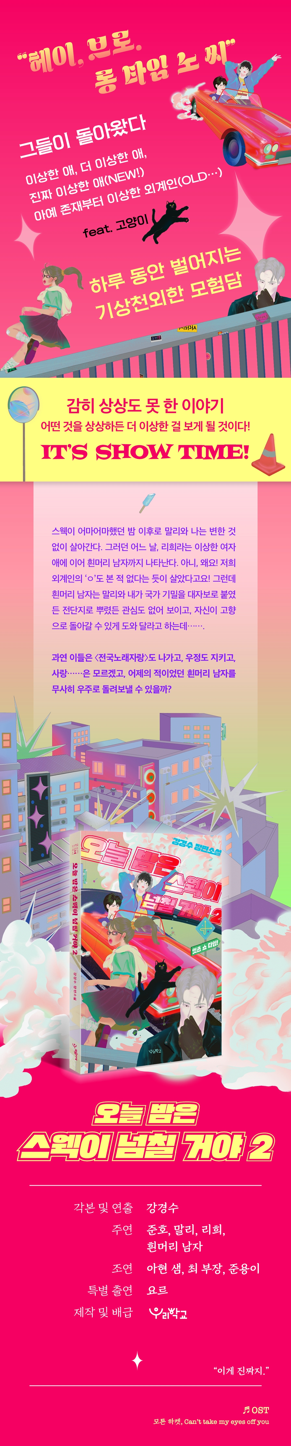 그들이 돌아왔다! “너…… 외계인이야?” 이상한 애, 더 이상한 애, 진짜 이상한 애(NEW!) 별종 셋이 모이면 지구도 지킨……다?! TRACK 0. 되감기, 재생 헤이, 브로. 이 책을 보게 된 걸 축하해. 이 책에는 행운이 베리 머치 깃들어 있어서 사는 사람들에게 행운을 주고 있지. 행운이 필요한 친구에게 한 다섯 권 정도 보내 주면 어때? 컴온 요, 조크였어. 뭐? 1권을 안 읽었다고? 1권 안 읽었어도 오케이, 오케이. 내가 누구인지만 알면 돼. MC 말리, 바로 이 몸이 주인공이니까. 표지에서도 봐, 제일 눈에 띄게 브이를 하고 있잖아? 내 옆에 앉아 있는 준호 쟤는 영화감독 되겠다고 시나리오 작법서를 사 놓고서는 베개로 쓰고 있지. 나? 나는 세계적인 힙합 뮤지션이 되기 위한 첫발을 이미 뗐다고. 어마어마한 경쟁률을 뚫고 〈전국노래자랑〉 본선에 진출해서 블링블링 샤이니한 리희와 함께 무대를 누볐지. 채널 고정해 놓고 내 가무 실력을 감상하라고. ‘좋아요’도 잊지 마. 사실 지금 브로가 무사한 건 우리가 1권에서 죽을 고생을 해서 지구를 지켰기 때문이라고. ‘좋아요’ 정도가 아니라 광장 한복판에 우리 동상을 세워서 지나갈 때마다 인사하게 해야 하는 업적인데. 유남생? TRACK 1. 외계인이 지구를 침공하지 못하는 건 중2들 때문이지만, 외계인이 지구를 탈출할 수 있는 건 고2들 때문이기도 하다 왜 너가 주인공이야? 그리고 시나리오 작법서 베개로 안 썼어. 이런 두꺼운 책 베면 목 돌아간다고. 말리가 하는 말은 헛소리니까 무시해. 우리가 지구를 지킨 건 사실인데 주인공은 나라는 말이야. 솔직히 주인공이면 잘생기고 매너가 있어야 하잖아. 그런데 너 리희랑 처음 마주쳤을 때 뭐라고 했어? “얼른 뛰어! 화장실까지 1분!”이라고 소리친 거 기억 안 나? 주인공으로서 잠깐 소개하자면, 리희. 새로운 캐릭터지. 우리랑 동갑인 여자애야. 중요한 점. 코가 크다. 육상선수 출신이라 그런지 허구한 날 뛰어다니는데 멀리서도 코가 먼저 보일 정도로 크다. 다음으로 중요한 건 얘가 말리만큼이나, 아니, 어쩌면 말리보다 더 이상할지도 모른다는 건데……. 하긴, 아무리 이상해 봤자 인간이면 됐지. 적어도 외계인은 아니잖아. 외계인들은 우주선을 몰던 경험 때문인지 과속을 밥 먹듯이 하지를 않나, 인간 가죽을 복제해 놓고서 아무 데나 널어놓지를 않나……. 아무튼. 양아치들에게 쫓기던 어느 날(나는 선량한 시민인데 왜 자꾸 이런 일이 생기는 걸까…….) 흰머리 남자가 나타났어. 도둑도 제 발이 저리는데, 훔친 것 하나 없는 나랑 말리는 공손하게 말했어. “뎀, 우리가 무슨 잘못을 했다고 이러는 거예요.” 그런데 흰머리 남자는 우리가 국가 기밀을 대자보로 붙였든 전단지로 뿌렸든 관심도 없어 보이고, 대뜸 자기를 도와 달라는 거야. 지구를 벗어날 우주선이 필요하다고. 아니, 이 아저씨가 1권에서 우리를 죽일 뻔했던 건 방금 판 코딱지처럼 튕겨 버렸나. “알 파치노한테 부탁하면 되잖아요?”라고 소극적으로 반항해 봤지만(알 파치노도 외계인이거든.) 흰머리 남자는 완강했어. 우주선을 찾는 데 우리가 필요하다고. 이게 우리가 지구인과 외계인 간의 싸움에 휘말린 이유야. 왜 이렇게 이상한 사람들이랑 이상한 일들만 꼬이는 건지, 피곤하구먼. TRACK 2. 인생이 초콜릿 상자와 같다면 초콜릿을 빨리 집어 먹어라 “나는 악당을 좋아한다. 인간적 고뇌를 담은 악당이라면 더욱 좋다. 오늘 밤은 스웩이 넘칠 거야』 2권에서는 흰머리 남자에게서 이런 모습을 끌어내 보고 싶었다.” _작가의 말 그렇다. 『오늘 밤은 스웩이 넘칠 거야 2』는 준호, 말리, 리희 세 사람이 어제의 적이었던 흰머리 남자를 우주로 돌려보내기 위해 동분서주하는 이야기다. ‘코드네임’ 시리즈에서 입체적인 악당들을 보여 주었던 강경수 작가는 이번에도 숨겨진 이야기가 있는, 매력적인 악당을 만들어 냈다. ‘제임슨 본’처럼 기억을 잃은 흰머리 남자는 제 편인 줄 알았던 이들에게서 배신을 당해 쫓기는 신세다. 1권이 “우리의 이야기는 청춘 영화로 시작해서 스릴러와 공포 영화로 발전했다가 마지막에는 SF가 되었다. 그러나 결과적으로 이것은 사랑 이야기”였다면, 2권에서는 한 가지가 더 추가된다. 바로 우정이다. 준호-말리 콤보의 우정만이 아니라 흰머리 남자와의 우정. 하루가 실은 24시간이 아니라 48시간이었나 싶을 만큼 스펙터클한 모험 끝에 흰머리 남자에게 리희는 호두를 내밀고, 말리는 작별 인사를 하고(“외계인 브로, 굿바이.”), 준호는 행운을 빌어 준다. “평범함이라는 것은 현실 속에서 때로 특별함으로 반짝인다.” _작가의 말 세상에는 두 부류의 사람이 있다. 인생이 초콜릿 상자와 같다면, 할 일을 차근차근 마친 뒤에 초콜릿을 천천히 먹는 사람. 혹은 초콜릿 상자를 뜯자마자 일단 하나 집어 먹고 보는 사람. 사람들은 대부분 초콜릿을 느긋이 먹기 위해 하기 싫은 일들을 먼저 한다. 고등학생일 때는 대학교에 가면, 대학생일 때는 취직을 하면…… 같은 식으로. 많은 청소년 소설은 바로 이 딜레마, 초콜릿을 지금 당장 먹고 싶은 마음과 나중에 먹어야 한다는 마음 사이의 갈등을 다룬다. 등장인물들은 입