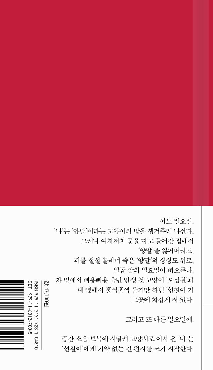 일요일에 우리는 지하철을 타고 고양이에게 밥을 주러 길을 나섰다. 고양이의 이름은 ‘양말’. 나는 그때까지 양말이라는 이름의 고양이에게 밥을 준 적이 없다. 내가 착각하는 게 아니라면, 양말이라는 이름의 고양이를 본 적도 없다.