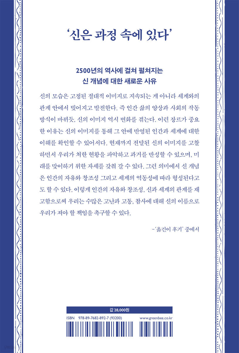 23명의 사상가를 통해 펼쳐내는 2500년의 신 개념 역사 신은 어떻게 인식 되어 왔는가? 신 개념의 역사라는 장르에 대하여 이 책은 신 개념의 역사라는 독특한 장르에 속한다. 이 장르는 시대와 변화를 초월해 존재하는 형언할 수 없는 신의 실재에 대한 역사가 아닌, 아브라함 시대부터 오늘날에 이르기까지 사람들이 신을 어떻게 인식해 왔는가의 역사이다. 사실상 신을 표현하는 여러 용어는 신 자체를 가리킨다기보다, 시대마다 특정 집단이 그들의 열망에 따라 형성해 온 개념이다. 신의 모습은 고정된 절대적 이미지로 지속되는 게 아니라, 세계와의 관계 안에서 빚어지고 발전한다. 즉 인간 삶의 양상과 사회의 작동 방식이 바뀌듯, 신의 이미지 역시 변화를 겪는다. 신 개념의 역사가 중요한 이유는 신의 이미지를 통해 그 안에 반영된 인간과 세계를 확인할 수 있어서이다. 신 개념의 역사를 통해, 현재까지 전달된 신의 이미지를 고찰하면서 우리가 처한 현황을 파악하고 과거를 반성할 수 있으며, 열린 미래를 맞이하는 데 필요한 자세를 갖춰갈 수 있다. 그런 의미에서 신 개념은 인간의 독창성과 창조성, 그리고 세계의 역동성을 따라 형성된다고도 할 수 있다. 과정 철학의 관점에서 신 개념의 역사를 구성하다 저자 대니얼 A. 돔브로스키는 20권이 넘는 저서와 200편이 넘는 논문을 남기며 활발하게 활동해 온 미국의 철학자이다. 과정철학자 찰스 하츠혼, 정치철학자 존 롤스, 고대 그리스의 철학 개념에 오랜 시간 천착하며, 여러 관점과 쟁점이 교차하는 지점을 섬세하게 연구해 왔다. 특히 하츠혼과 관련해 “가장 중요하고 많은 작품을 남긴 연구자”라고 불릴 만큼 뛰어난 연구 업적을 쌓았다. 그리고 ?신 개념의 역사?는 그의 연구를 한국에 처음 소개하는 번역서이다. 돔브로스키는 이 책에서 과정철학자 찰스 하츠혼에게 기대어 신고전 혹은 과정 유신론의 관점에서 신 개념의 역사를 구성하고, 이 장르의 외연을 넓히고자 한다. 기존 형이상학을 따를 때, 신에게는 언제나 우위 범주를 적용해야 하므로, 신 개념은 단극 성향을 보인다. 그러나 하츠혼은 양극신론을 제안한다. 즉, 범주를 선택적으로 신에게 적용하는 게 아니라, 각 범주에서 최고 탁월한 면모를 신에게 부여하는 것이다. 예를 들어 신은 최고 탁월한 존재인 동시에 최고 탁월한 생성이고, 최고 탁월한 변동성을 거듭해서 지니기에 최고 탁월한 영속성을 갖는다. 이런 양극신론에서는 대비되는 범주 사이에서 우열을 가릴 필요가 없다. 하츠혼은 기존 존재론의 범주를 인정하면서도, 범주가 가리키는 의미를 더 풍성하고 깊게 사유할 수 있는 길을 열어주었다. 고전 유신론에서는 신과 연결할 수 없던 속성들, 이를테면 연민이나 공감 같은 수동성, 타자와의 관계와 시간에 의한 변동성 같은 면모도 신에게 부여할 수 있게 되었다. 찰스 하츠혼의 이런 시도는 신학 안에서 과정철학을 사유하는 데도 크게 일조했다. 특히 남성 중심적이고 인간 중심적인 단극 신 개념이 전개되는 동안 가장자리로 밀려난 비남성 인간과 비인간 동물의 자리를 다시 확보할 수 있게 된 것이다. 고전 유신론을 넘어 신고전 유신론으로 신 개념의 전환과 확장의 역사를 살펴 보다 돔브로스키는 전통적인 신 개념을 고수하는 고전 유신론의 문제, 특히 시간 바깥에 머무는 영원성, 전능과 전지의 속성 때문에 생겨난 소통 없는 무감각한 신, 독재적이고 폭력적인 신의 모습을 지적하고, 신고전 혹은 과정 유신론의 견해를 옹호한다. 이어 찰스 하츠혼의 관점을 통해 아브라함 종교(유대교, 그리스도교, 이슬람교)에서 신 개념이 빚어져 온 오랜 역사를 설명한다. 여기서 특히 흥미로운 점은 존재론적 논증 자체를 비판하는 대신, 안셀무스, 토마스 아퀴나스 등이 가정하는 고전 유신론의 개념을 비판한다는 것이다. 돔브로스키는 이어 고전 유신론의 개념이 기인한 고대 그리스 철학의 발전을 살핀다. 그에 따르면 플라톤의 대화들에 나타나는 신관은 시기별로 조금씩 다르게 전개되며, 후기 저술들에서는 신고전 유신론에 가까울 정도로 발전된다. 하지만 플라톤 이후 고대 그리스 철학자들은 플라톤의 풍성한 생각을 다양하게 이어가지 못했다. 그렇기에 돔브로스키는 우리가 고전 유신론의 테두리를 벗어나, 플라톤의 풍성한 사유에 직접 접촉하고 플라톤이 염두에 두었던 역동적인 신, 시간 안에서 세계와 소통하며 함께 진보하는 신을 다시 만나기를 촉구한다. 존재 자체가 힘이라는 이해 아래, 전능과 전지한 신 대신 여러 힘 사이에서 균형과 조화를 이루는 선한 세계를 상상하기를 제안한다. 역설적이게도 우리가 새로 빚어야 할 신 개념은 고대의 이야기 속 상상에 닿아 있고, 고전 유신론의 오랜 사유 방식을 폐기한다기보다 전환하고 확장해 나가야 한다는 점에서 신고전 유신론이라고 할 수 있다. 따라서 그는 근대 초기부터 20세기 중반까지 전통적인 신의 속성에 갇히지 않고 신을 이야기해 온 과감한 사유들을 살핀다. 여기에는 뉴턴의 기계론적 자연관을 극복하려 애쓴 프리드리히 폰 셸링, 기호논리학의 선구자 찰스 샌더스 퍼스, 인간의 창조성을 다시 발견한 