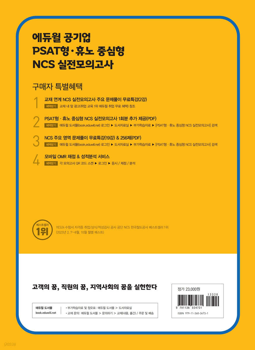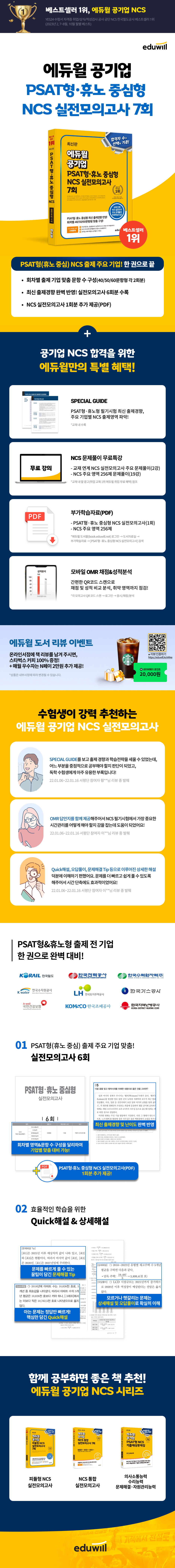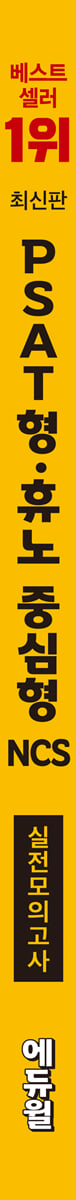 주요 기업별 NCS 출제유형과 PSAT형, 휴노 중심형 출제 주요 기업별 출제영역 및 영역별 세부 출제유형 정보를 정리하여 출제경향을 한번에 파악할 수 있도록 하였다. (1) PSAT형, 휴노 중심형 NCS 실전모의고사 1회 의사소통능력, 수리능력, 문제해결능력 3개 영역의 총 40문항/50분으로 구성하였다. 한국철도공사 등 출제 주요 기업을 대비할 수 있도록 하였다. (2) PSAT형, 휴노 중심형 NCS 실전모의고사 2회 의사소통능력, 수리능력, 문제해결능력, 자원관리능력 4개 영역의 총 40문항/50분으로 구성하였다. 한국수자원공사 등 출제 주요 기업을 대비할 수 있도록 하였다. (3) PSAT형, 휴노 중심형 NCS 실전모의고사 3회 의사소통능력, 수리능력, 문제해결능력, 자원관리능력 4개 영역의 총 50문항/60분으로 구성하였다. 한국토지주택공사 등 출제 주요 기업을 대비할 수 있도록 하였다. (4) PSAT형, 휴노 중심형 NCS 실전모의고사 4회 의사소통능력, 수리능력, 문제해결능력, 자원관리능력, 정보능력 5개 영역의 50문항/70분으로 구성하였다. 한국전력공사, 한국가스공사 등 출제 주요 기업을 대비할 수 있도록 하였다. (5) PSAT형, 휴노 중심형 NCS 실전모의고사 5회 의사소통능력, 수리능력, 문제해결능력 3개 영역의 60문항/60분으로 구성하였다. 국민건강보험공단 등 출제 주요 기업을 대비할 수 있도록 하였다. (6) PSAT형, 휴노 중심형 NCS 실전모의고사 6회 의사소통능력, 수리능력, 문제해결능력, 자원관리능력, 조직이해능력 5개 영역의 60문항/70분으로 구성하였다. 한국수력원자력 등 출제 주요 기업을 대비할 수 있도록 하였다. [별책] 정답과 해설 아는 문제는 Quick해설을 통해 빠르게 정답만 확인하고 넘어가고, 모르거나 헷갈리는 문제는 상세해설 및 오답풀이를 통해 확실하게 이해하도록 했다. 자신의 실력에 따라 맞춤 학습이 가능하도록 하였고, 추가로 일부 문항에 해설 외에 빠르게 해결할 수 있는 방법을 제공한 문제 풀이 TIP을 제공한다.. [구매자 특별혜택] (구매혜택1) 교재 연계 NCS 실전모의고사 주요 문제풀이 무료특강(2강) PSAT형, 휴노 중심형 NCS 실전모의고사 1~6회 중 주요 문제를 선별하여 상세하게 풀이해주는 교재 연계 무료특강을 2강 제공한다. NCS 전문 교수님의 문제풀이 강의를 통해 교재 학습만으로는 알기 어려운 문제풀이, 시간단축 전략 등을 터득할 수 있다. : 교재 내 앞 광고(취업 교육 1위 에듀윌 취업 무료 혜택) 참조 (구매혜택2) PSAT형, 휴노 중심형 NCS 실전모의고사 1회분 추가 제공(PDF) 본 실전모의고사를 학습한 후 학습 수준을 확인할 수 있는 부가학습자료로서 NCS 4개 영역(의사소통능력/수리능력/문제해결능력/자원관리능력)을 학습할 수 있는 맞춤형 NCS 실전모의고사 1회분을 PDF로 추가 제공한다. : 에듀윌 도서몰(book.eduwill.net) 로그인 〉 도서자료실 〉 부가학습자료 〉 [최신판 PSAT형, 휴노 중심형 NCS 실전모의고사] 검색 (구매혜택3) NCS 주요 영역 256제 문제풀이 무료특강(19강) & 256제(PDF) NCS 주요 영역을 학습할 수 있는 256제 PDF와 해당 문제를 상세하게 풀이해주는 무료특강을 19강 제공한다. NCS 전문 교수님의 문제풀이 강의를 통해 교재 학습만으로는 알기 어려운 문제풀이, 시간단축 전략 등을 터득할 수 있다. : 에듀윌 도서몰(book.eduwill.net) 로그인 〉 도서자료실 〉 부가학습자료 〉 [최신판 PSAT형, 휴노 중심형 NCS 실전모의고사] 검색 (구매혜택4) 모바일 OMR 채점 & 성적분석 서비스 최신판 PSAT형, 휴노 중심형 NCS 실전모의고사 1~6회에 각각 수록된 QR코드를 통해 OMR 채점 및 성적분석 서비스를 제공한다. 해당 서비스를 통해 본인의 성적과 학습자 간 비교 데이터, 취약 영역을 점검할 수 있다. : 각 모의고사 QR 코드 스캔 〉 로그인 〉 응시/채점/분석 |
