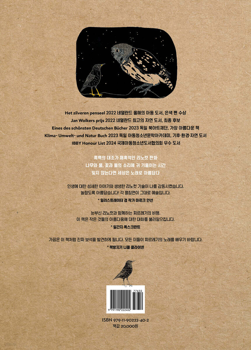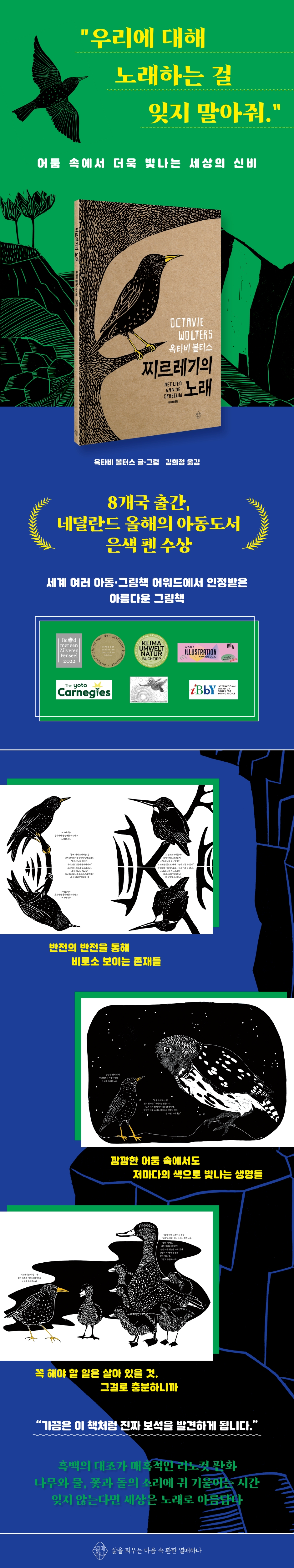 세계적 호평을 받은 리노컷 그림책 책의 펼침 면은 검은색 선과 면으로 가득 차 있고 주인공인 찌르레기의 부리와 다리만이 노란색으로 빛난다. 이렇게 책에 사용된 색상은 단 두 가지. 그러나 사실 하나가 더 있다. 바로 바탕을 이루는 흰색이다. 음각과 양각, 흑과 백의 대비로 판화 작품만의 강렬함이 돋보인다. 판화 그림에서는 원하는 결과물과 반대의 화면을 구상하는 반전의 상상력이 필요하다. 이 작품의 특징은 찌르레기와 물총새의 노래에서 절정을 이룬다. 마주한 두 새가 물에 비춰져 마치 거울처럼 반전되어 드러난 모습. 물 그 자체는 투명하여 보이지 않지만, 가만히 바라보는 이에게 조금 다른 시선으로 자신을 볼 수 있도록 해준다. 이 책이 출간과 함께 8개 이상의 언어로 번역 및 출판되고, 네덜란드를 넘어 여러 국제 아동·그림책 어워드에서 우수도서로 선정되거나 수상의 영광을 얻을 수 있었던 매력은 무엇일까. 흑백의 강렬하고도 분명한 그림과 울림이 깊은 문장 속에 나와 우리, 동물과 자연, 생명과 지구에 대한 아름다움과 사랑이 담겨 있기 때문일 것이다. 어두운 밤에도 모든 색은 빛나기에 살아 있을 것, 그것으로 충분하다 전 세계를 뒤덮은 코로나-19 바이러스는 많은 이들에게 깊은 상실감과 우울함을 남겼다. 문학을 전공한 저자는 소설 작가로 출발했지만, 2020년 코로나 시대의 우울과 삶에 대한 고민을 글과 그림으로 풀어내며, 자신의 예술적 표현 방식을 더 확장하기에 이른다. 출판사의 제안으로 그림책 작업을 시작한 옥타비 볼터스는 곧 리노컷 판화의 매력에 빠져들어, 사람들의 눈과 마음을 사로잡는 작품들을 연달아 출간한다. 리노컷 작품은 대체로 한두 가지 색을 사용하는 것이 일반적이지만, 여러 색으로 구현될 수도 있다. 그러나 책에서 작가가 검은색을 주로 사용한 이유는 아마도 검은색 안에 이미 모든 색이 포함되었기 때문일 것이다. “깜깜한 어둠 속에서도 저마다의 빛깔이 있지”라고 말하는 부엉이의 표현처럼, 이 책에서 검은색은 단일한 검정(1도 먹)이 아니라 인쇄에 필요한 4가지 색 요소가 모두 결합된 이른바 ‘4도 먹’이다. 자세히, 정말 자세히 들여다보면 독자들도 검은색 안에 얼마나 많은 빛깔이 담겼는지 알 수 있다. 자연의 소리에 귀를 기울이면 그 전에는 알 수 없던 새들의 노래가 들리듯, 캄캄한 어둠 속에서도 희망을 놓지 않는다면 그 속에서 빛나는 것들을 발견할 수 있다. 책장을 넘길 때마다 이 빛나는 어둠 속에서 독자들은 단순하고도 명징한 삶의 지혜에 다다르게 될 것이다. 우리가 “꼭 해야 할 일은 살아 있을 것. 그걸로 충분하니까.” |