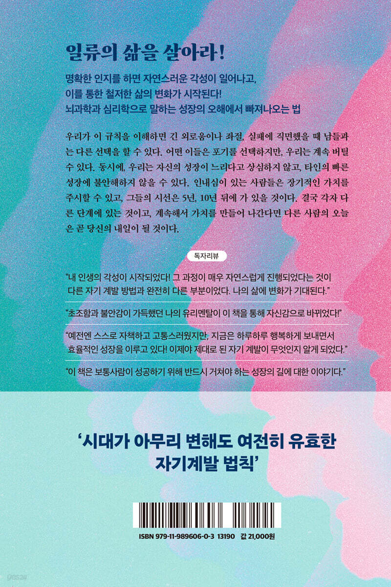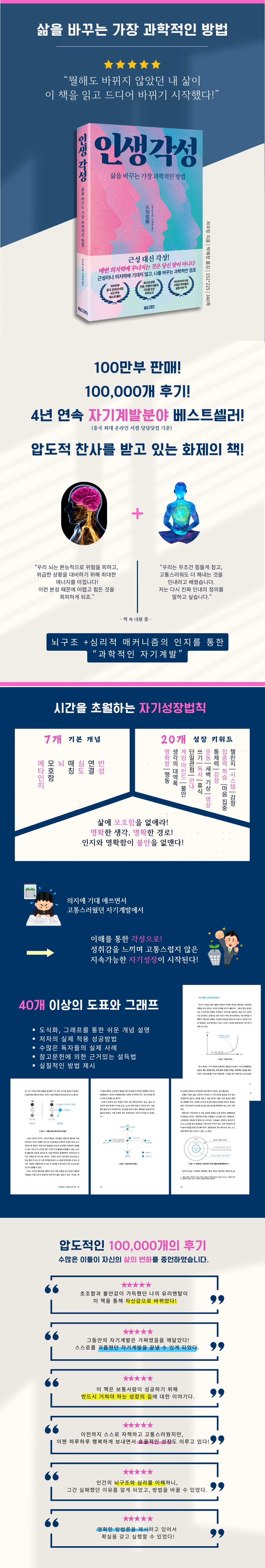 저자는 문득 과거를 떠올렸다가 특별한 내용이 생각나지 않은 것에 충격을 받았다. 자신은 분명 하루하루 열심히 최선을 다해 살아왔다고 생각했지만, 지금 현재 기억에 남는 것도, 또 그렇다할 결과물도 없었다. 그런 생각을 하자, 갑자기 두려움이 몰려왔다고 한다. 우리도 비슷한 두려움이 있을 것이다. ‘이렇게 살아도 될까?’ 지금 삶에 대한 확신도 없고, 다른 사람들은 빨리 가는 것 같은데, 나만 뒤처지는 것 같다는 두려움, 준비되지 않은 미래로 걱정스럽다. 결국 다시 자기계발책을 펴고, 관련 영상을 보고, 돈을 벌 수 있다는 클래스를 수강하지만, 이내 이 길은 내 길이 아닌 것 같다. 의지를 내어 운동도 하고, 새벽기상도 시도해 보지만, 결국 너무 고통스럽고 힘들어서 얼마 못가 포기해 버린다. 그리고 다시 자책을 한다. ‘나는 왜 이렇게 게으르고, 의지가 약할까?’ 책은 인간은 원래 그렇다고 말한다. 원래 게으르고, 의지력이 약하고, 멀리 보지 못하게 태어났다고 말이다. 그리고 이를 받아들이고, 이를 이용하면서 새로운 자기계발 방법을 제시한다. 그 이야기가 매우 위로가 되었고, 나 자신을 이해하는 시발점이 되었다. 정확한 인지를 하게 되니, 자발적인 각성이 시작되었다. 책을 읽는 과정은 이처럼 스스로를 이해하게 해주면서 좋은 방법을 제시해 주어 이를 시도해 보고 싶도록 한다. 그래서 이토록 많은 이들이 실제 성공의 경험을 하는 것이라 생각한다. 결국 이 책은 시대가 바뀌어도 변하지 않는 자기계발 법칙에 대한 이야기이다. 인생의 변화를 꿈꾸고, 새시작을 원하는 모든 이들을 위한 좋은 등대가 될 것이다. 지속가능한 것이 중요하다 그래서 힘들고 고통스러우면 안 된다 저자 저우링은 수많은 사람들이 자기 계발에 많은 노력을 기울이지만 성과가 더디거나 결국 중도에 포기하게 된다는 것을 알게 된다. 성과를 내더라도 이는 굉장한 인내와 고통 속에서 낸 것으로 결국엔 멈추는 순간이 올 수 밖에 없다고 말한다. 자신 역시 처음엔 타인의 방법을 쫓다가 실패했고, 수많은 시행착오 끝에 ‘시대가 변해도 바뀌지 않을 자기계발 법칙’을 깨달았다. 이를 개인 블로그에 글을 올렸고, 반향이 생겼고, 타인의 사례와 질문까지 더한 것이 바로 이 책이다. 그는 자신이 경험하고, 알게 된 지식을 설명하면서 인간이 가장 자연스럽게 지속할 수 있는 자기계발 방법들을 제안하게 되었다. 그가 설명한 이론과 제안한 방법이 워낙 쉽고 실질적이라 현재는 중국에서 가장 신뢰받는 자기계발 전문가가 되었다. “자기계발에 이제야 자신감이 생겼어요!” 실제 경험, 성공담이 끊임없이 나오고 있는 독자들의 극찬 유명 언론사에서 먼저 퍼나를 정도로 유명해진 그의 블로그에는 자기성장을 꿈꾸는 수많은 사람들이 고민을 토로하고, 경험담을 전하는 소통의 공간이기도 하다. 이 책을 읽고, 자신의 삶에 변화를 경험했다는 수많은 독자들의 글이 가득하다. “ 초조함과 불안감이 가득했던 나의 유리멘탈이 이 책을 통해 자신감으로 바뀌었다!” “이 책은 보통사람이 성공하기 위해 반드시 거쳐야 하는 성장의 길에 대한 이야기다.“ “이전까지 스스로 자책하고 고통스러웠지만, 이젠 하루하루 행복하게 보내면서 효율적인 성장도 이루고 있다!” 진짜 자기계발은 결국 삶을 변화시킬 수 있어야 한다 저자는 이론만 설득하는 것에 끝나지 않는다. 결국 진짜 좋은 자기계발은 실제로 삶을 변화시킬 수 있어야 하고, 결과물을 만들어 낼 수 있어야 한다고 말한다. 이 책에는 많은 실질적인 자기계발 도구와 실행할 내용들이 등장한다. 이 책을 제대로 읽는다면 저자가 ‘당신이 이번엔 행동할 때!’라고 했을 때 행동해야 한다. 그리고 명확히 이해가 되었다면 스스로도 행동하고 싶어질 것이다. 저자가 경험했고, 수 많은 독자, 그리고 역자가 경험했다. 이제 당신 차례이다! |