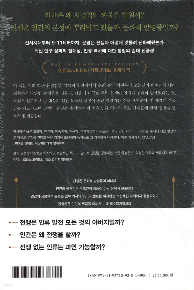 이 책은 야심찬 작업물이다. (…) 사람들은 왜 죽음을 부르는 파괴적인 싸움을 벌일까? 싸움은 인간 본성에 뿌리박고 있을까, 아니면 나중에 나타난 문화적 발명품일까? 사람들은 처음부터 늘 싸움을 해왔을까, 아니면 농업과 국가, 문명이 등장하면서 비로소 싸우기 시작했을까? 인류의 역사에서 농업, 국가, 문명과 이후의 중요한 발전들은 전쟁에서 어떤 영향을 받았으며 역으로 전쟁에 어떤 영향을 미쳤을까? 만약에 전쟁을 없앨 수 있다면, 어떤 조건에서 그런 일이 가능할까, 그리고 전쟁은 현재 감소하고 있을까?