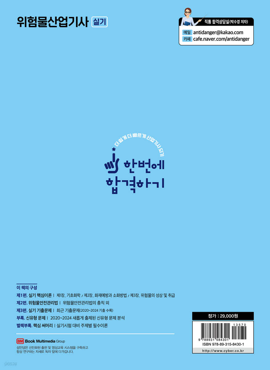 첫 번째, 문제에 대한 해설이 이해하기 쉽게 되어 있는 책 기출문제는 같아도 그 문제에 대한 풀이는 책마다 다를 수밖에 없으며, 해설의 길이가 길고 짧음을 떠나 얼마나 이해하기 쉽고 전달력 있게 풀이하는지가 더 중요하다. 두 번째, 최근 개정된 법령이 반영되어 있는 책 위험물안전관리법은 자주 개정되는 편은 아니지만, 개정 시점에는 꼭 개정된 부분에 대해 출제되는 경향이 있다. 수험생 여러분들이 직접 개정된 법까지 찾아가며 공부하는 것은 힘들기 때문에 믿고 공부할 수 수험서를 선택해야 한다. 본서는 상기 기준을 충실히 반영하여 집필하였으며, 원리부터 비법까지 전략적으로 구성하여 쉽고 빠르게 이해하며 공부할 수 있게 하였다. 가장 최근에 개정된 법령의 세세한 부분까지도 정확하게 반영하였으며, 출간 이후 개정되는 법의 내용은 저자 카페를 통해 즉시 공지한다. #저자 직통 합격상담실(박수경 저자) - 메일: antidanger@kakao.com - 카페: cafe.naver.com/antidanger ▣ 이 책의 주요 특징 1. 위험물 필수 핵심강의 무료 제공! 2. 교재 내용 속 QR코드로 참고 내용 및 사진 제공! 3. 최근 출제경향 & 최신 개정 법령 정확히 반영! 4. 톡톡 튀는 암기법/친절한 TIP/똑똑한 풀이비법 제시! 5. 2020~2024년 3회까지의 모든 기출문제 완벽 해설! 6. 2020~2024년에 새롭게 출제된 신유형 문제 분석 수록! 7. 별책부록(핵심써머리) 수록! 8. 저자 직통 합격상담실 운영! |