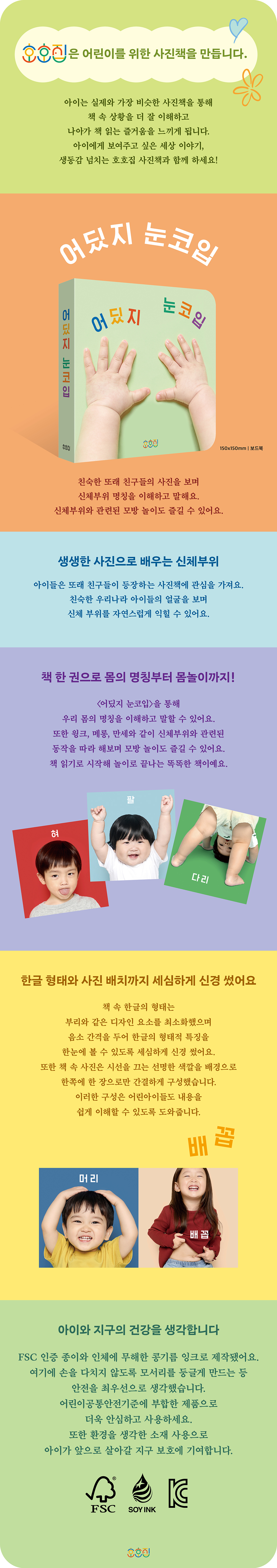 아이들은 또래 친구들이 등장하는 사진책에 관심을 가져요. 친숙한 우리나라 아이들의 얼굴을 보며 신체 부위를 자연스럽게 익힐 수 있어요. 책 한 권으로 몸의 명칭부터 몸놀이까지! 「어딨지 눈코입」을 통해 우리 몸의 명칭을 이해하고 말할 수 있어요. 또한 윙크, 메롱, 만세와 같이 신체부위와 관련된 동작을 따라 해보며 모방 놀이도 즐길 수 있어요. 책 읽기로 시작해 놀이로 끝나는 똑똑한 책이예요. 한글 형태와 사진 배치까지 세심하게 신경 썼어요 책 속 한글의 형태는 부리와 같은 디자인 요소를 최소화했으며 음소 간격을 두어 한글의 형태적 특징을 한눈에 볼 수 있도록 세심하게 신경 썼어요. 또한 책 속 사진은 시선을 끄는 선명한 색깔을 배경으로 한쪽에 한 장으로만 간결하게 구성했습니다. 이러한 구성은 어린아이들도 내용을 쉽게 이해할 수 있도록 도와줍니다. 아이와 지구의 건강을 생각합니다 FSC 인증 종이와 인체에 무해한 콩기름 잉크로 제작됐어요. 여기에 손을 다치지 않도록 모서리를 둥글게 만드는 등 안전을 최우선으로 생각했습니다. 어린이공통안전기준에 부합한 제품으로 더욱 안심하고 사용하세요. 또한 환경을 생각한 소재 사용으로 아이가 앞으로 살아갈 지구 보호에 기여합니다. |