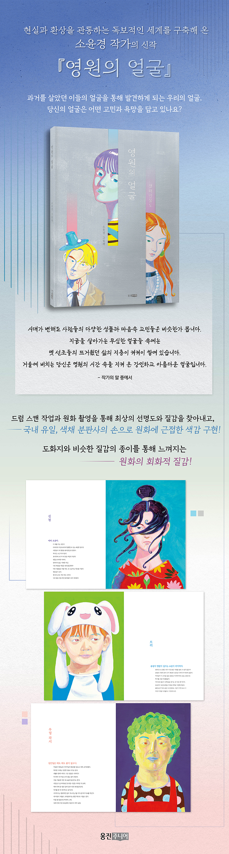 과거와 현재를 관통하는 우리의 이야기 오늘을 살아 가는 다양한 인물의 초상과 그 표정에 어려 있는 욕망들을 각자의 혼잣말로 재해석한 소윤경 작가의 『영원의 얼굴』이 출간되었다. 『영원의 얼굴』의 모태가 된 소재는 전래 이야기이다. 전래 이야기 속 인물들은 각자가 처한 상황에서 갈등하고 번민하고 때로는 순응하며 살아가고, 그들의 화두는 지금 우리가 안고 있는 여러 내외적 고민들과도 맞닿아 있다. 여행자의 시선으로 낯설고도 아름다운 미지의 세계를 펼쳐 보여 주는 『호텔 파라다이스』, 우리와 우리가 먹는 것 사이의 관계에 대한 깨달음에 주목한 『레스토랑 sal』, 인간과 비인간 생명체 간의 연대와 공존을 한껏 표현한 『콤비』에 이어, 작가의 가장 내밀한 기억을 수면 위로 끌어 올린 『수연』까지, 이 작품들은 모두 소윤경 작가가 세상을 향해 던진 각종 물음의 결과물이다. 작가는 삶과 죽음, 자연과 인공의 세계, 남과 여, 인간과 비인간 등 이 세계를 얽고 있는 경계들에 주목하고, 그 사이에서 외줄타기 하듯 감각을 곧추세운 채 침잠한다. 그림을 그리는 것이 곧 작가에게 생존일 수 밖에 없는 이유가 여기에 있다. 루시안 프로이트의 그림이 보편적인 아름다움을 따르지 않듯, 발튀스의 그림이 경계에 선 인간의 감정을 매개로 그만의 노스탤지어를 꿈꾸듯, 『영원의 얼굴』에서 작가는 전래 이야기를 소재로 과거와 현재의 경계를 넘나들며 치열하고 내밀한 탐구와 성찰을 시도한다. 이제, 영원의 시간을 거슬러 온 우리의 얼굴들을 만나 보자. “거울에 비치는 당신은 영원의 시간 속을 지켜 온 강인하고 아름다운 얼굴입니다.” 소윤경 작가가 시간의 역동을 읽어 내는 소재로 삼은 것은 바로 ‘얼굴’이다. 『영원의 얼굴』은 과거로부터 이어져 온 성향과 내적 갈등, 오늘날의 외적인 모습을 그린 그림책이자 인물화첩이다. 소망, 슬픔, 경탄, 공포, 절망, 꿈, 기쁨, 희망……. 세상에 존재하는 모든 감정의 흔적과 현대심리학에서 분류되는 개인의 심리적 성향, 예를 들면 편집성, 자기애성, 회피성, 강박성, 의존성, 연극성 등을 전래 이야기 속 인물에 이입해, 인간을 이해하는 관점의 폭을 넓히고자 했다. 젊음과 미모로 신분상승을 꿈꾸는 춘향, 낙천적이지만 의존적이고 의지박약한 흥부, 부모의 인정을 갈망하는 길동, 묵묵히 소임을 다하고자 한 별주부, 강한 생활력의 표상인 자린고비, 세월이 허망한 노년의 옹고집, 담담하게 최후의 만찬을 준비하는 팥죽 할멈까지, 수많은 삶의 이야기들이 시간을 거슬러 영원의 시간을 지배한다. 거울에 비친 우리의 얼굴은 어떤 번민을 끌어안고 이 시간을 살아 내고 있는가. 『영원의 얼굴』은 우리의 자화상에 대해 원초적이고도 근원적인 질문을 던진다. 매일같이 얼굴의 기록을 새기고 있는 이들에게, 전래 이야기 속 인물들과 그들의 서사에 대해 관심을 가질 아이들에게도 새로운 재미와 환기를 안겨 줄 그림책이 될 것이다. “시대가 변해도 사람들의 다양한 성품과 마음속 고민들은 비슷한가 봅니다. 전래 이야기 속 인물들에게서 오늘날 우리와 다르지 않은 문제들로 번민하는 모습을 보게 됩니다. 지금을 살아가는 무심한 얼굴들 속에는 옛 선조들의 뜨거웠던 삶의 지층이 켜켜이 쌓여 있습니다. 거울에 비치는 당신은 영원의 시간 속을 지켜 온 강인하고 아름다운 얼굴입니다. - 작가의 말 중에서 다채로운 색감과 세밀한 표정으로 이뤄낸 초상 서사의 세계 『영원의 얼굴』 속 인물들은 전통적인 인물화와는 달리, 다채롭고 비비드한 색감으로 표현되었다. 어디서 본 듯한 친숙한 외양이지만, 빨간 머리에 파란 눈, 붉거나 푸른 피부 등으로 사실적인 인물화와는 확연히 다른 화법이다. 이는 제각각 다른 색채를 지닌 현대인들의 개성을 표현하기 위한 작가의 의도가 반영된 부분이다. 그림 속 인물들의 표정은 색감만큼이나 다양한 이야기를 담고 있다. 토끼는 기회를 잡을 요량으로 용왕의 지병에 토끼 간이 특효라는 소문을 퍼트려 놓은 뒤 흘낏흘낏 눈치를 살핀다. 나름 억울한 것 투성이인 팥쥐는 어떻게 하면 콩쥐를 골탕 먹일까 하는 생각에 눈꼬리를 잔뜩 치켜 올린 모습이다. 이제는 해님이 되어 버린 동생과 함께 떡 팔고 돌아오는 엄마를 기다리던 때를 그리는 달님의 얼굴에는 아득한 심정이 묻어나고, 세상이 만들어 놓은 서열에 절대 굴복하지 않겠다는 길동의 표정에는 범접할 수 없는 단호함이 풍긴다. 심청의 모습은 또 어떤가. 아버지를 위해 배에 오른 딸의 어지러운 심경이 휘날리는 머리카락으로 대차게 표현되었다. 뺑덕의 얼굴에서는 30년 거간꾼 노릇에서 얻어진 드센 성미와 뱃사람들에게 청이를 주선한 뒤 밀려온 후회의 소회가 겹겹이 어려 있다. 『영원의 얼굴』이 그려 내는 군상들의 표정과 이야기 속에 투영된 오늘 우리의 초상은 어떤 모습일까? |