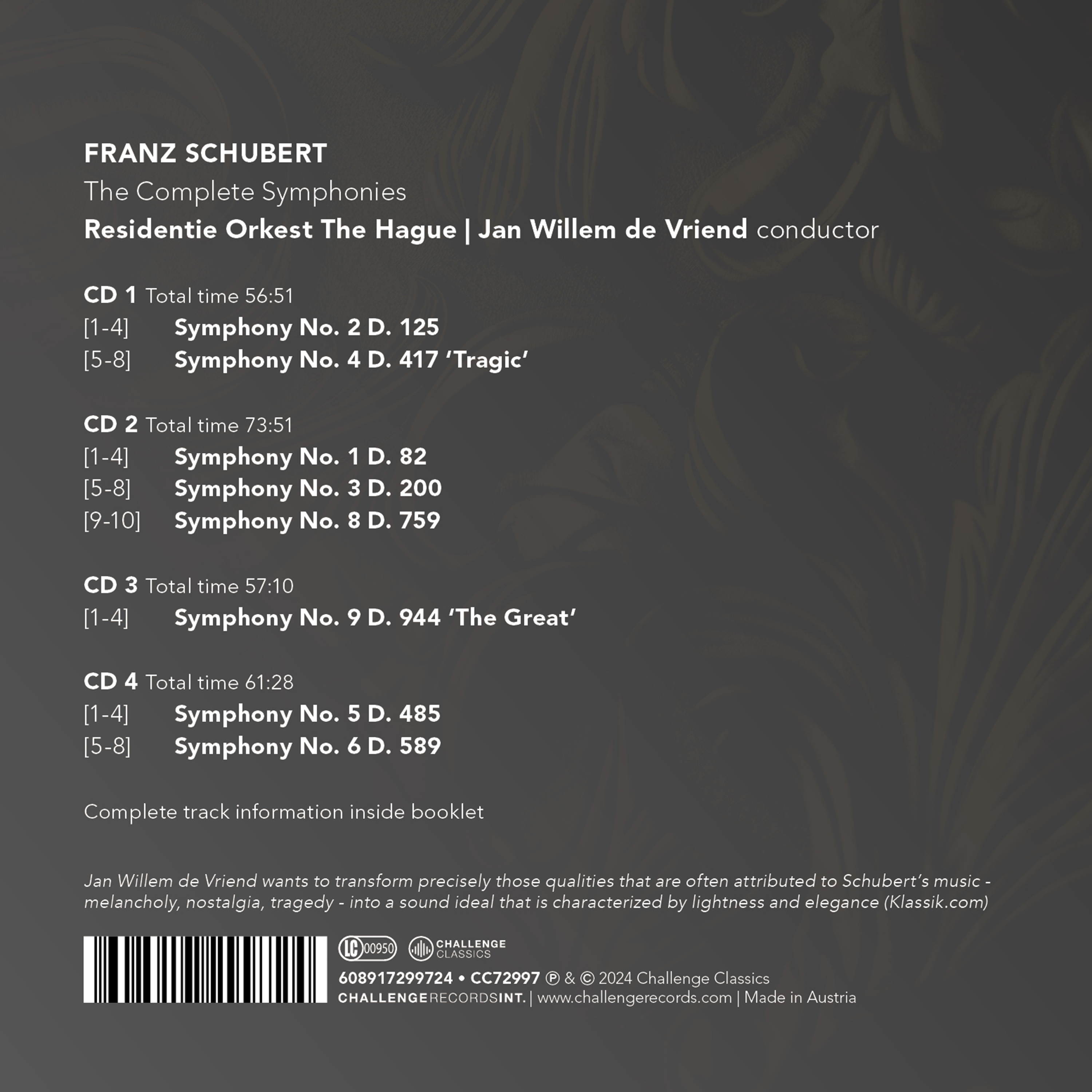 슈베르트는 그 짧은 일생에 수많은 가곡과 기악곡, 교향곡 등을 작곡하였으나, 그의 이름을 유명하게 한 것은 가곡이다. 690곡에 이르는 가곡들이 모두 훌륭하다는 평을 듣지만, 특히 《겨울 여행》이나 《아름다운 물방앗간의 처녀》, 《백조의 노래》 등이 특히 뛰어난 작품이며, 자유로운 표현력을 지니는 멜로디의 아름다움, 그리고 화성의 미묘한 변화 등 낭만주의의 특색을 잘 나타내고 있다. 교향곡에서는 제8번의 《미완성》이 특히 유명하나, 제9번 《대교향곡》의 아름다움도 잊어서는 안된다. 피아노곡에서는 《마왕》, 《방랑자 환상곡》, 《스케르초》, 《악흥(樂興)의 한때》 등이 알려져 있고, 실내악곡에도 《죽음과 소녀》나 《송어》 등 걸작이 많다. 그 밖에 오페라·음악극의 작품도 있으며, 가곡을 비롯하여 교향곡·실내악·피아노곡 등 1,200여 곡의 많은 작품을 남겼다.