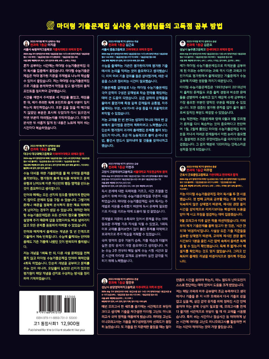 통합사회1 새 교육과정에 맞는 문항 + 2014~2017년 4개년 고1 학력평가 기출문제 중 통합사회1 교육과정에 맞는 우수 문항 + 2018~2020년 3개년 고2 3월 학력평가 기출문제 중 통합사회1 교육과정에 맞는 우수 문항 선별 수록 → 총 391문항 단원별·난이도순 체계적인 문항 배치 ① 개념 확인 문제 ② 핵심 문제 ③ 심화 문제 ④ 서술형 문제 전 단원 개념 설명 + 선별 문항 문제 풀이 동영상 강의 ① 개념 확인을 위한 OX & 빈칸 문제 144제 ② 사고력 향상을 위한 서술형 문제 ③ 시험에 꼭 나오는 단원별 필수 개념 정리 ④ 단원별, 소주제별 기출문제 수록으로 취약 단원·소주제 파악하며 집중 학습 가능 ⑤ 전 문항 상세한 첨삭 해설 수록 ⑥ 실력 확인을 위한 미니모의고사 2회 제공 ⑦ 2028학년도 대학수학능력시험 예시문항 수록 |