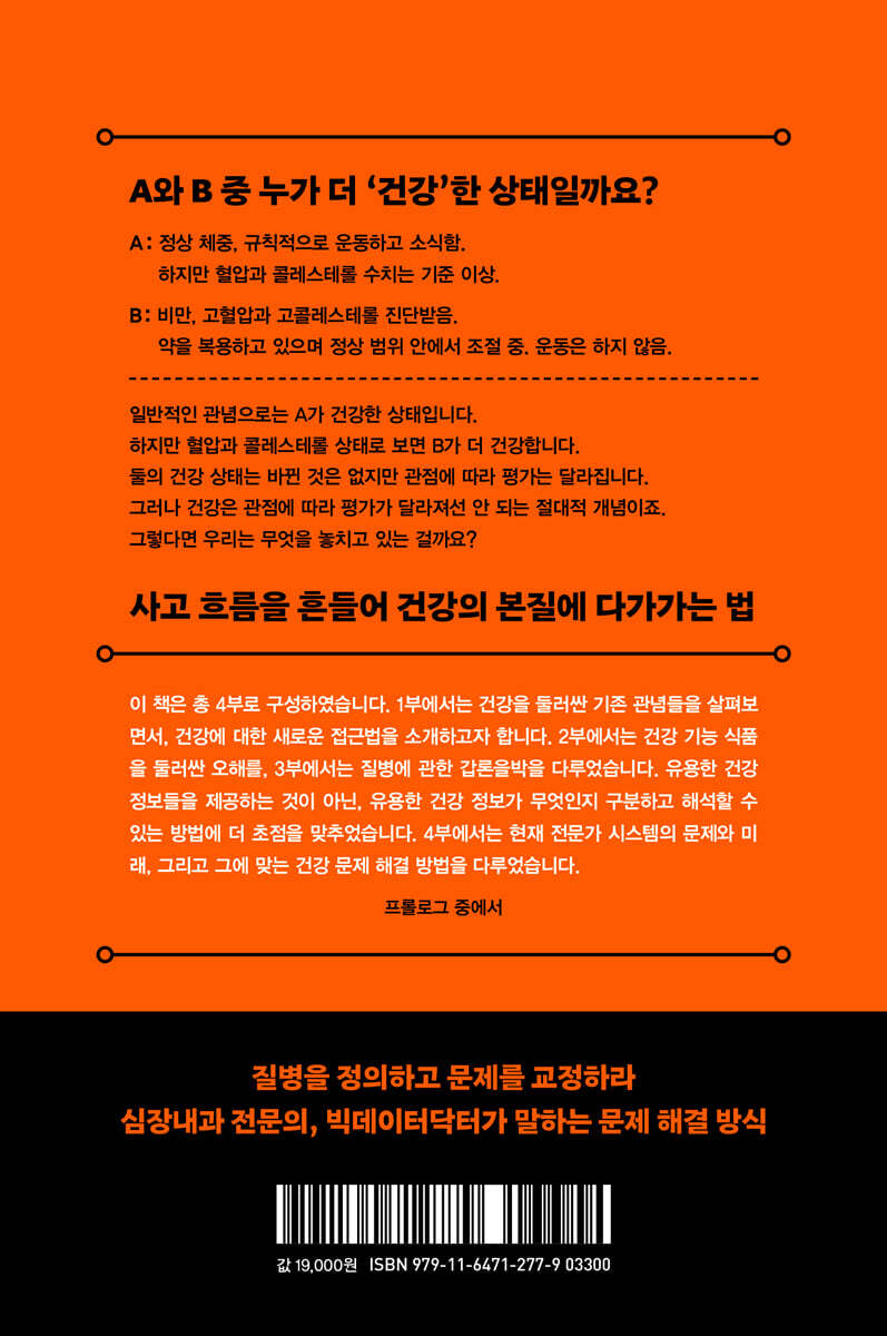 --- 「테슬라에서 발견하는 건강 유지의 비밀」 중에서 여러분, 건강검진을 주기적으로 받나요? 내시경검사는 주기적으로 하나요? 예방접종은 제때 하나요? 지금 여러분의 혈압, 혈당, 콜레스테롤 수치를 정확히 아나요? 적정 체중과 허리둘레를 유지하나요? 이 질문을 재정의한 건강에 맞춰 다시 의미를 부여해보겠습니다. 여러분, 사망 원인 1위와 2위 가능성을 낮추기 위해 노력하나요? --- 「건강으로 가는 알고리즘」 중에서 “채소 좀 많이 먹어. 몸에 좋으니까.” “오메가3 좀 챙겨 먹어. 몸에 좋으니까.” “구체적으로 몸 어디에 좋은데?”라고 물으면 여러분은 명확하게 대답할 수 있나요? 몸에 좋다는 음식에 관한 이야기를 들으면 왜 비판적으로 사고하지 못하고 혹해서 믿어버리는지 알아봅시다. --- 「몸에 좋은 음식에 속는 이유」 중에서 다리가 혈액순환이 잘 안 되는 것 같습니다. 그래서 한 달 전부터 혈전을 녹여주는 식품 A를 사서 먹고 있죠. 어느 날 갑자기 경미한 어지러움이 나타났습니다. 미세한 뇌혈관이 터져서 출혈이 발생한 거예요. 다행히 그 양이 적었고, 혈전이 바로 생겨서 출혈 부위를 땜질해줬습니다. 그런데 여러분은 계속 A를 복용 중이에요. 혈액으로 흡수된 A는 몸을 순환합니다. 당연히 뇌혈관으로도 가죠. 바로 이때 식품 A는 모순적인 상황을 마주합니다. 여러분이 A를 복용한 본래 목적은 다리에 생겼을지도 모르는 불필요한 혈전을 녹이기 위함인데, 터진 뇌혈관을 땜질하는 혈전마저 녹이는 상황이 되기 때문이죠. 그러면 어떻게 될까요? --- 「혈액순환제의 비밀」 중에서 누구나 돈을 계산할 때는 과학자 뺨치는 사고 능력을 발휘하죠. 돈에 따른 이득과 손실이 모든 이에게 명확한 개념이기 때문입니다. (중략) 그런데 신기한 점이 있습니다. 여러분이 건강식품 투자자가 아니라 소비자라고 생각하는 순간, 이 모든 계산적 사고의 흐름이 멈춘다는 점입니다. --- 「지금까지 말씀드린 내용이 어렵다면」 중에서 평생 약을 복용하게 되는 것이 꺼려져서 복용을 거절한다는 말은 다음과 같은 뜻입니다. 계속하기 싫어서 처음부터 실내화를 신지 않은 채 아랫집 사람에게 피해를 주겠다. 계속하기 싫어서 마스크를 끼지 않은 채 전염병에 노출되겠다. 계속하기 싫어서 집 안의 쓰레기를 버리지 않고 쌓아두겠다. 계속하기 싫어서 양치하지 않고 치석이 쌓이게 두겠다. --- 「혈압약·당뇨약·고지혈증약, 한번 먹으면 평생 먹어야 할까요?」 중에서 여러분이 어떤 연유로 절벽에서 떨어집니다. (중략) 누군가가 그 상황에서 벗어날 수 있도록 도와주려고 밧줄을 던져줬습니다. 그런데 여러분은 그동안 “밧줄에서 냄새가 난다”, “밧줄을 잡으면 감기에 걸린다”, “밧줄은 몸에 해롭다” 등 좋지 않은 이야기를 너무 많이 들은 거죠. 그래서 밧줄을 거부하는 사태에 이릅니다. 지금 자신이 어떤 상황에 있는지 파악하지 못한 채 말이죠. 그리고 얘기합니다. “여기서 빠져나갈 수 있게 응원과 기도 부탁드립니다. 긍정적인 소리를 자주 들으면 몸에 좋다네요.” --- 「약물은 해로우니 운동과 식사 조절로 해보자」 중에서 문제를 해결하고 싶다면 해결책보다 문제의 본질을 먼저 찾아야 합니다. 본질을 건드렸을 때 문제가 해결되기 때문이죠. 그렇다면 어떻게 해야 문제의 본질을 볼 수 있을까요? 문제를 구체적으로 정의하고, 그와 관련된 정보의 의미를 드러나게 하면 됩니다. 팔란티어의 문제 해결 공식대로 말이죠. 여러분이 어떤 질병을 제대로 예방하고 싶다면 다음 네 가지를 꼭 기억하기 바랍니다. (1) 질병을 구체적으로 정의한다(문제 재정의). (2) 질병을 유발하는 원인을 확인한다(문제와 관련된 정보 찾기). (3) 그 원인이 나에게 있는지 확인한다(정보의 의미 확인). (4) 그 원인을 교정한다(문제 해결). --- 「질병을 진짜로 예방하는 과학적 방법」 중에서 |