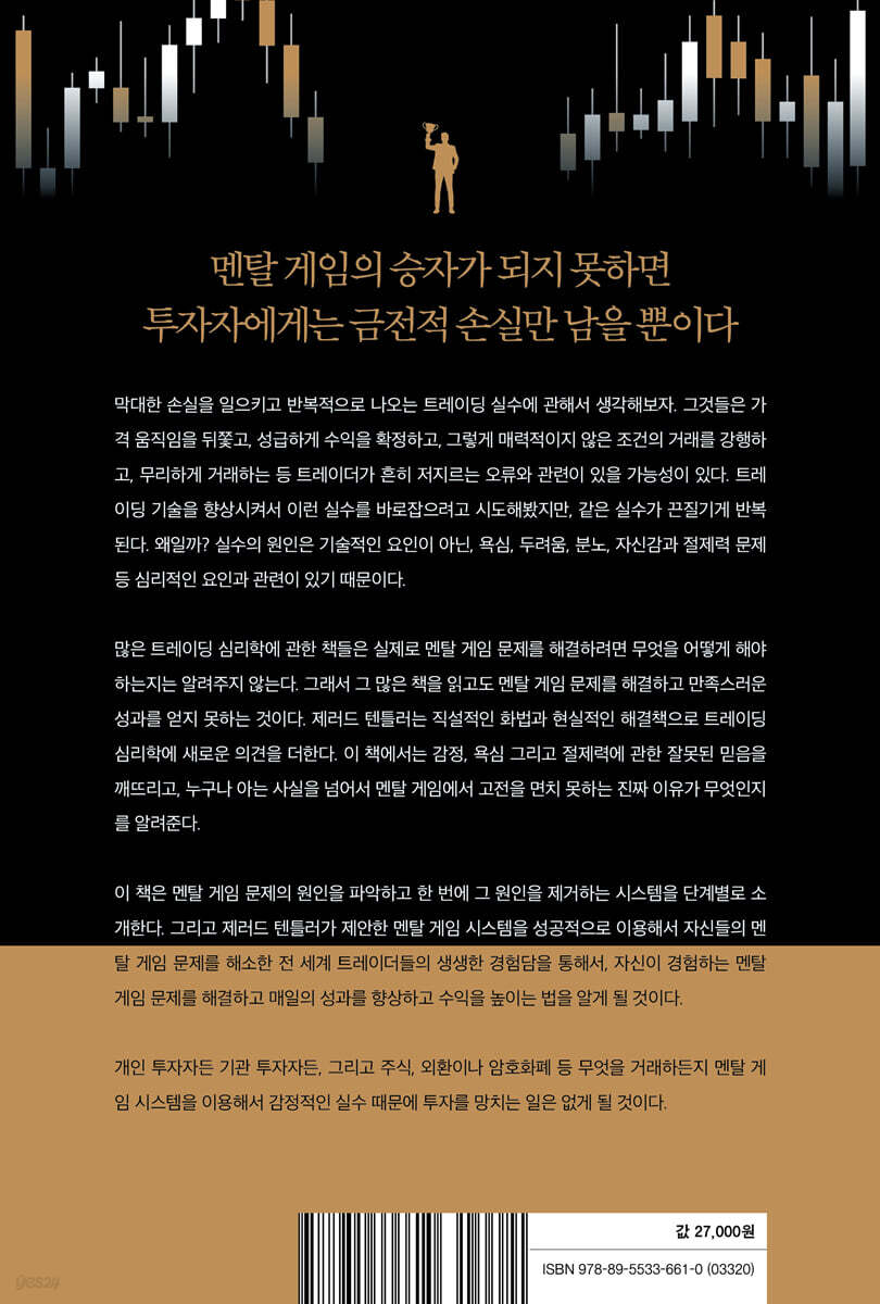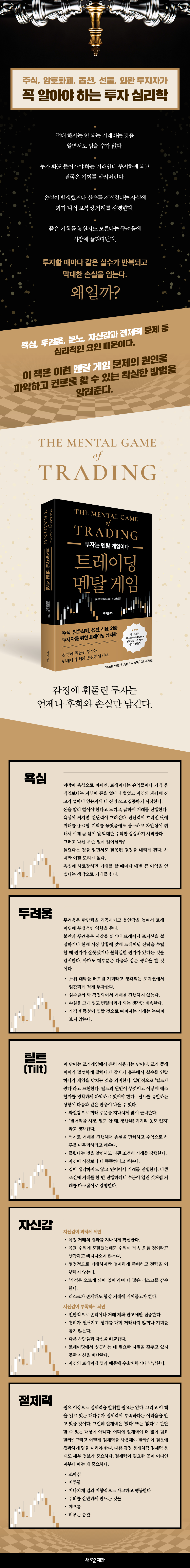 트레이더는 욕심 때문에 많은 혼란을 경험한다. 게다가 욕심을 버리는 방법 때문에 많은 트레이더가 더 혼란스러워한다. 그저 욕심을 덜 부리는 것이 해결책은 아니다. 이것은 마치 야심을 덜 가지라고 말하는 것과 같다. 욕심을 없애는 게 어려운 이유는 사실 욕심이라는 감정에만 해당하는 결함이 없다는 것이다. 그 대신에 욕심의 근원은 두려움, 분노, 과도한 자신감 그리고 자신감 부족을 일으키는 결함, 편견, 환상에 있다는 것을 알게 될 것이다. 일반적으로 욕심의 근원은 과도한 자신감에 있다. 또한 욕심은 두려움과 긴밀히 연계되어 있을 수 있다. 실패할지도 모른다는 두려움, 트레이딩 성과가 저조할지도 모른다는 두려움, 트레이딩을 시작할 때보다 적은 돈으로 하루를 마감할지도 모른다는 두려움 등… 트레이딩은 온갖 두려움과 연관된다. 실제로 트레이더는 거래하는 동안에 두려움을 너무나 자주 경험해서, 이것이 트레이딩 프로세스의 자연스럽고 피할 수 없는 부분이라고 생각하게 된다. 물론 거래하는 동안에 어느 정도 초조함을 느끼는 것은 당연하다. 하지만 거래하는 동안에 트레이더가 과도한 두려움을 느끼게 되는 근본적인 이유를 찾아서 이해하면, 그것이 수익성을 헤치지 않는다고 확신할 수 있게 된다. --- 「욕심에 대하여....」 중에서 두 번째로 다루고 있는 문제는 두려움이다. 두려움은 트레이더 모두에게 너무나 친숙한 감정이다. 그런데 잔뜩 부풀려진 것인지도 모르겠다. 두려움과의 문제를 확실하게 파악하고 해소하려면, 두려움의 종류를 구체적으로 파악하는 것이 중요하다. 손실에 대한 두려움, 실수에 대한 두려움 그리고 실패에 대한 두려움 등 이미 두려움과 관련된 문제를 스스로 진단하고 이름을 붙였는지도 모른다. --- 「두려움에 대하여....」 중에서 불안과 두려움은 시장을 읽거나 트레이딩 포지션을 설정하거나 현재 시장 상황에 맞게 트레이딩 전략을 수립할 때 뭔가가 잘못됐거나 불확실한 뭔가가 있다는 것을 암시한다. 그렇다면, 트레이더는 안정적으로 멘탈 게임을 벌일 수 있게 되고 두려움을 유발하는 결함이나 믿음이나 환상에서 벗어난다는 의미다. 하지만 대다수의 경우는 그렇지 않다. 아마도 대부분은 다음과 같은 생각을 할 것이다. · 트레이딩에서 상당한 손실을 볼까 봐 걱정한다. · 소위 대박을 터트릴 기회라고 생각되는 포지션에서 일관되게 적게 투자한다. · 실수할까 봐 걱정되어서 거래를 진행하지 않는다. · 손실을 크게 입고 빈털터리가 되는 생각만 계속한다. · 가격 변동성이 심할 것으로 여겨지는 거래는 눈여겨보지 않는다. 세 번째로 다루고 있는 문제는 틸트(분노)이다. 틸트는 포커 게임에서 흔히 사용되는 단어다. 포커 플레이어가 멀쩡하게 잘하다 가 갑자기 흥분해서 실수를 연발하다가 게임을 망치는 것을 의미한다. 일반적으로 ‘틸트가 왔다’라고 표현한다. 트레이더 중에서 일부는 이미 분노가 자신의 트레이딩 성과에 영향을 주고 있다는 것을 인지하고 그로 인해 실제로 치러야 하는 대가도 알고 있다. 분노는 트레이딩하는 동안이나 며칠에 걸쳐서 폭발 일보 직전 상황이 될 때까지 서서히 쌓인다. 분노가 서서히 쌓이면, 투기성 거래에 빠지거나, 수익이 나는 거래와 손실이 나는 거래를 너무 오래 붙잡아두거나, 오히려 지나치게 공격적으로 변하기 쉽다. 분노에 휩싸인 트레이더는 손실이 나면 가격을 쫓아서 급하게 결정을 내린다. 그러다가 아무런 경고 없이 분노가 갑자기 폭발한다. --- 「틸트(Tilt) - 분노에 대하여....」 중에서 네 번째로 다루고 있는 문제는 자신감이다. 자신감 부족을 고치고 싶다고 생각하는 것은 자연스러운 반응이다. 하지만 때때로 지나친 자신감이 부족한 자신감보다 훨씬 더 큰 문제를 일으킬 수 있다. 그러므로 이 두 가지 상황을 동시에 자세히 살펴보자. 자신감이 과도하다는 것이 거만하거나 건방지거나 욕심 많은 허풍쟁이처럼 행동한다는 의미는 아니다. 많은 트레이더가 자신감 과잉 때문에 힘들어하지만, 겉으로는 자신감이 지나치지 않는다는 시그널만 보낸다. 특히나 시장 분석을 완전하게 마무리하지도 않고 시장이 어디로 움직일지 확실히 예측할 수 있다고 생각한다면 자신감이 지나친 것이다. 시장을 완벽하게 이해했고 소위 대박을 터트릴 거라고 흥분하는 것도, 자신감 과잉이다. 반면에 자신감이 결여되면 “자신이 없어”라고 말하며 보통 때는 쉽게 들어갔던 거래를 피하게 된다. 아마도 평상시보다 자신감이 덜 느껴지기 시작하고, 시간이 지나면서 이 감정은 서서히 커진다. 그결과로 주저하거나, 불안해하거나, 우울해지는 등 자신감이 없는 사람에게서 나타나는 감정에 빠지게 된다. --- 「자신감에 대하여....」 중에서 다섯 번째로 다루고 있는 문제는 절제력이다. 절제력은 자전거 타기처럼 한 번 배우게 되면 영원히 유지되는 능력이 아니다. 다시 말해서, “난 절제하고 있어”라고 말하고 그것으로 끝낼 수 있는 성격의 능력이 아니다. 누군가는 절제력이 있고, 누군가는 절제력이 없다고 단순하게 판단할 수 없다. 모두가 나름대로 절제하고 있다. 다시 말해서 모두가 각자 