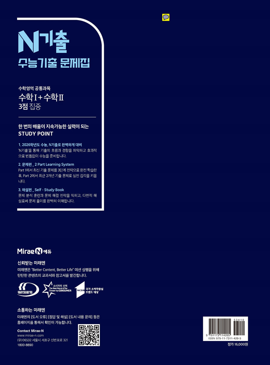 [ 3점 기출 분석 & 유형별 공략법 ] - 최근 수능 기출 문제를 분석하여 과목별로 3점 기출의 출제 경향을 안내하였습니다. - 3점 기출 학습 방법을 꼼꼼히 제시하였습니다. [ 수능잡는 핵심 개념 & 기출 유형 ] - 최근 수능에 출제되었던 3점 기출을 분석하여 수능에 출제된 핵심 개념을 대단원별로 일목요연하게 정리하였습니다. - 수능에서 3점 기출이 어떻게 출제되는지를 개념별, 유형별로 분석하여 자주 출제되는 유형명과 유형을 공략하기 위한 해결 방법을 제시하였습니다. [ 2점 기출 확인하기 ] - 2점 기출을 풀어 수능에 출제된 핵심 개념을 이해하고 있는지 확인할 수 있도록 하였습니다. [ 3점 기출 집중하기 ] - 최근 수능, 평가원 기출 문제를 분석하고 그중에서 3점 기출을 총망라하여 개념별, 유형별로 정리하였습니다. - 3점 기출을 집중적으로 풀어 수능에 대한 감각을 익히고, 수능 실력을 올릴 수 있습니다. [ 3점 같은 4점 기출 도전하기 ] - 4점 기출 중에서 정답률이 높은 4점 기출을 풀어 수능에 대한 자신감을 갖고, 수능 실력을 탄탄하게 완성할 수 있습니다. [ 문제편_Part2 ] 최근 2개년 기출로 실전 감각 100% UP! - Part2에서는 2024, 2025학년도 6월 모평, 9월 모평, 수능 기출 문제를 학습 진도에 맞춰 풀어볼 수 있습니다. - 실제 시험지에서 수학Ⅰ, 수학Ⅱ 2점, 3점에 해당하는 문제 5지선다형 1번~8번, 단답형 16번~19번을 시험지 형태로 구성하였습니다. [ 해설편 ] Self - Study Book - 문제 분석 훈련을 하고, 문제 해결에 따른 사고의 과정에 따라 필요한 개념과 해결 방법을 생각하면서 문제 해결의 포인트를 잡을 수 있습니다. - 문제 해결에 필요한 연관 개념, 실전 적용 Key, 오답 Clear 등을 제시하였습니다. - 혼자서도 쉽게 이해할 수 있도록 자세하고 친절한 풀이를 제시하였습니다. 또, 더 쉽고 빠르게 풀 수 있는 다른 풀이, 빠른 풀이를 다양하게 제시하였습니다. - 문제 풀이와 관련하여 꼭 알아야 할 개념을 제시하여 중요한 개념을 한 번 더 짚고 넘어갈 수 있고, 자주 실수하는 부분에 대해 주의할 수 있도록 하였습니다. - 수학영역 1등급 선배들이 문제 해결의 노하우를 제시하여 선배들의 생생한 조언을 들을 수 있습니다. |