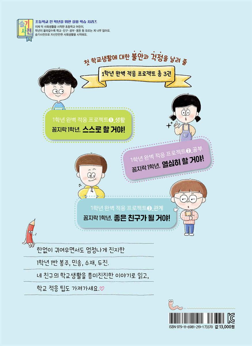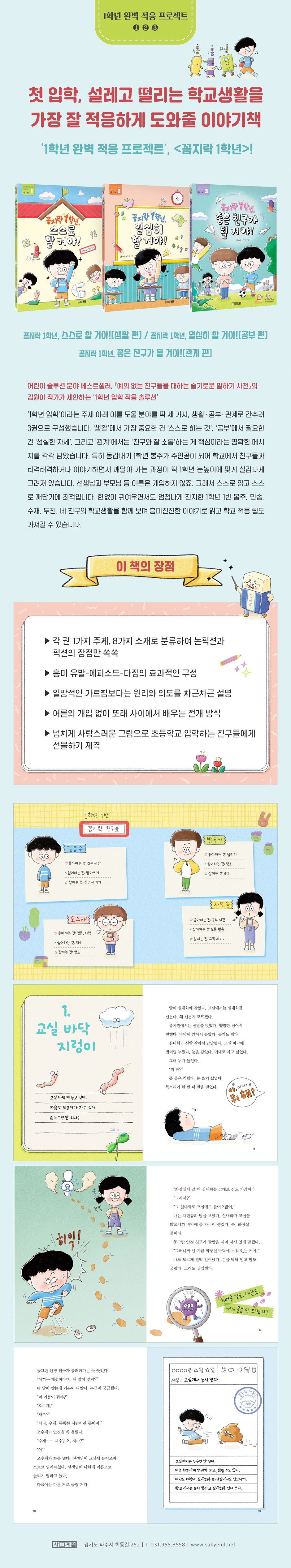 1, 2권 합해 10만 부 가깝게 판매된 베스트셀러, 『예의 없는 친구들을 대하는 슬기로운 말하기 사전』의 김원아 작가는 어린이 도서에 ‘솔루션 분야’를 새롭게 열었다 해도 과언이 아니다. 그 뒤에 아이들 관계와 심리 관련 도서가 폭포처럼 쏟아져 나왔으니 말이다(여전히 나오고 있다). 초등학교 교사로 교육 현장 최전선에서 아이들에 대한 뜨거운 진심을 냉철한 솔루션으로 풀어내는 김원아 작가가 이번에는 1학년 아이들의 ‘학교생활 적응 솔루션’을 제안한다. ▣ 처음 입학하는 학교라는 곳, 당황하지 않는 당찬 첫걸음을 위해 부모가 된 이후 가장 불안한 시기가 출산 직후라면 그다음은 아이가 초등학교에 입학하는 시기이다. 막상 당사자인 아이들은 어떨까? 당장 학교에 발을 내디뎌야 하는 아이들은, 표현이 서툴러 잘 티가 안 날 수도 있지만, 실제로 더 불안하지 않을까? 그렇기에 부모들이 더 불안해져서 입학 설명회도 듣고, 이것저것 찾아보며 걱정하고 준비한다. 그럼 아이들은 뭘 준비하면 좋을까? 그 첫 번째는 준비물도 아니고 스마트폰도 아니며, ‘스스로 할 수 있는 마음가짐’이라고 1학년 담임교사들은 입을 모아 말한다. 그래서 1학년 눈높이에 딱 맞춰, 아이가 스스로 읽고 준비할 수 있는 이야기를 담은 ‘1학년 완벽 적응 프로젝트’ 시리즈를 출간했다. ▣ ‘1학년 완벽 적응 프로젝트’는 무엇이 다를까?: 논픽션과 픽션의 장점만 쏙쏙 뽑아 1학년을 대상으로 하는 논픽션 도서나 이야기책은 이미 많이 나와 있다. 그럼 ‘1학년 완벽 적응 프로젝트’ 시리즈는 무엇이 다를까? 논픽션 도서는 구체적인 방법을 알려줄 수 있지만 마음가짐까지 알려주기는 어려운 지점이 있다. 1학년 대상의 일반 이야기책은 “1학년 학교생활은 이렇구나.” 하는 간접 경험을 줄 수는 있지만 구체적인 지침을 주기는 어렵다. 이런 부분을 보완하여 ‘1학년 완벽 적응 프로젝트’ 시리즈를 출간했다. ‘학교생활 적응’이라는 분명한 정보를 동화 같은 이야기 안에 넣어 아이들이 재미있게 읽으면서도 적절한 정보를 가져갈 수 있게 구성했다. ▣ 슬기사전 시리즈 속 시리즈, 생활?공부?관계 3권으로 정리 ‘1학년 완벽 적응 프로젝트’는 슬기사전의 ‘시리즈 속 시리즈’로 구성했다. 슬기사전에 속하면서도 이 세 권은 따로 또 시리즈이다. 아이돌 그룹의 유닛 팀처럼 말이다. ‘1학년 입학’이라는 주제 아래 이를 도울 분야를 딱 세 가지, 생활·공부·관계로 간추려 정리했다. ‘생활’에서 가장 중요한 건 ‘스스로 하는 것’, ‘공부’에서 필요한 건 ‘성실한 자세’, 그리고 ‘관계’에서는 ‘친구와 잘 소통’하는 게 핵심이라는 명확한 메시지를 각각 담았다. ▣ 동갑내기 1학년의 목소리로 듣는 ‘1학년 적응 백서’ ‘1학년 완벽 적응 프로젝트’는 1학년 봉주의 목소리로 이야기가 전개된다. 처음에 봉주의 질문이나 상황을 통해 포문을 열고, 봉주의 내레이션으로 이야기가 전개되며, 마지막에 봉주가 자신의 다짐을 일기에 적으면서 한 에피소드가 마무리된다. 짧은 에피소드 8개를 한 권에 모았다. 봉주가 학교에서 친구들과 티격태격하거나 이야기하면서 깨달아 가는 과정이 딱 1학년 눈높이에 맞게 실감나게 그려져 있다. 선생님과 부모님, 즉 어른은 개입하지 않는다. 스스로 읽고 스스로 깨닫기에 최적이다. 현장에서 아이들을 직접, 자주, 오래도록 만나는 교사가 아니라면 그릴 수 없는 장면들이 많다. 한없이 귀여우면서도 엄청나게 진지한 1학년 1반 봉주, 민송, 수재, 두진. 네 친구의 학교생활을 함께 보며 흥미진진한 이야기로 읽고 학교 적응 팁도 가져가자. □각권 1가지 주제, 8가지 소재로 분류하여 논픽션과 픽션의 장점만 쏙쏙 3권 『꼼지락 1학년, 좋은 친구가 될 거야!』에서는 1학년 아이의 관계에 도움이 될 8가지 기본 태도를 소개한다. 친구 놀리지 않기/선생님한테 이르기 전에 ‘하지 마’ 먼저 해 보기/장난으로라도 친구 때리지 않기/심하게 경쟁하지 않기/‘고마워’, ‘미안해’라는 말 용기 있게 하기/짜증 내지 말기/서로 다른 것 인정하기. 교사가 엄선한, 1학년 아이들에게 꼭 필요한 관계의 주요 덕목들을 모아 아이들 간의 티격태격, 좌충우돌 생활에 밀착하여 이야기로 구성했다. 아이들이 동화책 읽듯 재미있게 읽으면서도 학교에서 친구들과 어떻게 하면 잘 지낼 수 있는지 자연스럽게 파악할 수 있다. 논픽션과 픽션의 장점을 쏙쏙 뽑아 살렸다. □흥미 유발-에피소드-다짐으로 구성 이야기를 시작하면서 도입 부분에서 주인공 봉주가 의문을 제기하거나 흥미를 유도하고, 1학년 아이들 눈높이에 딱 맞는 짧은 이야기가 펼쳐진 뒤, 마지막에 봉주가 깨닫고 다짐하는 내용을 일기에 쓰면서 마무리한다. 챕터마다 명확한 주제와 그에 따른 흥미로운 에피소드가 적절하게 배치되어 있다. 특히 본문에서도 주요 내용을 한 번 더 짚어 주어 반복을 통해 중요한 생활 방식을 자연스럽게 익힐 수 있다. □일방적인 가르침보다는 원리와 의도를 차근차근 설명하여 여러 가지 지침을 무조건 지켜야 한다고 강요하지 않는다. 그 이유와 의도를 이야기 속에서 충분히 설명하고 있다. 예