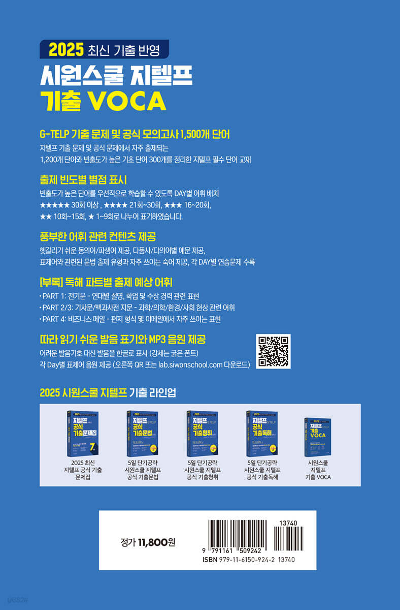 지텔프 기출문제 및 공식문제에서 자주 출제되는 1,200개 단어와 빈출도가 높은 기초 단어 300개를 정리한 지텔프 필수 어휘 교재 2. 출제 빈도별 별점 표시 빈출도가 높은 단어를 우선적으로 학습할 수 있도록 DAY별 어휘 배치 ★ ★ ★ ★ ★ 30회 이상 , ★ ★ ★ ★ 21회~30회, ★ ★ ★ 16~20회 ★ ★ 10회~15회, ★ 1~9회로 나누어 표기 3. 풍부한 어휘 관련 컨텐츠 제공 헷갈리기 쉬운 동의어/파생어 제공, 다품사/다의어별 예문 제공, 표제어와 관련된 문법 출제 유형과 자주 쓰이는 숙어 제공, 각 DAY별 연습문제 수록 4. [부록] 독해 파트별 출제 예상 어휘 ㆍ PART 1: 전기문 - 연대별 설명, 학업 및 수상 경력 관련 표현 ㆍ PART 2/3: 기사문/백과사전 지문 - 과학/의학/환경/사회 현상 관련 어휘 ㆍ PART 4: 비즈니스 메일 - 편지 형식 및 이메일에서 자주 쓰이는 표현 5. 따라 읽기 쉬운 발음 표기와 MP3 음원 제공 어려운 발음기호 대신 발음을 한글로 표시 (강세는 굵은 폰트) 각 Day별 표제어 음원 제공 (교재 내 QR코드 또는 lab.siwonschool.com에서 다운로드) ★ 이 책의 구성과 특징 1. 출제 빈도 지텔프 교재 및 시험에서 출제된 빈도를 다음과 같이 표시하였습니다. ★★★★★ 30회 이상, ★★★★ 21-30회, ★★★ 16-20회, ★★ 10-15회, ★ 1-9회 2. 기출 표제어 지텔프 교재 및 시험에서 출제된 단어들을 총망라한 1,200단어를 선별하였습니다. 3. 단어 의미 및 동의어 출제된 단어의 모든 의미를 정확히 구분하여 제시. 특히 의미별로 동의어를 제시하였으며, 실제 정답으로 출제된 동의어를 포함하였습니다. 4. 자주 쓰이는 숙어 해당 단어를 포함하여 전치사나 부사와 결합하여 자주 쓰이는 숙어, 또는 복합 명사, 빈출 표현을 모아 실제 지문 해석에 도움이 될 수 있도록 구성하였습니다. 5. 출제 확률 UP! 문법 또는 독해 및 어휘 영역에서 출제된 적 있는 출제 포인트를 정리하여 제시하였습니다. 6. 기출 파생어 출제된 적 있는 약 2,000여 개의 파생어를 통해 품사와 어휘 유형을 완벽하게 대비할 수 있습니다. 7. 발음 표시 어려운 발음기호 대신 가장 가까운 우리말로 발음을 표기하였습니다. f, v, r 발음의 경우, p(프), b(비), l(리)과 구분하기 위해 f(쁘), v(뷔), r(뤼)로 표기하였습니다. 8. 재미있는 삽화 기출 단어의 포인트를 쉽게 이해하도록 돕는 동시에 딱딱한 어휘 학습에 재미를 주는 요소로 삽화가 포함되어 있습니다. 9. DAILY PRACTICE 각 DAY 마지막에는 해당 DAY에서 학습한 단어와 그에 맞는 의미를 연결하고, 빈칸에 알맞은 단어를 넣는 연습문제 및 독해의 동의어 문제를 풀이하여 실전 감각을 향상시킬 수 있도록 하였습니다. 10. [부록] BASIC VOCABULARY 300 기초가 부족한 수험생을 위해 난이도가 낮고 빈출도가 높은 기초 영단어를 부록으로 수록하여 지텔프 기출VOCA를 공부하기 전에 지텔프 기초 어휘력을 쌓도록 하였습니다. 11. 독해 PART별 빈출 어휘/표현 독해 PART별 지문 형식/내용을 간략히 소개하고, 해당 PART의 빈출 어휘와 출제 예상 어휘를 정리하였습니다. |