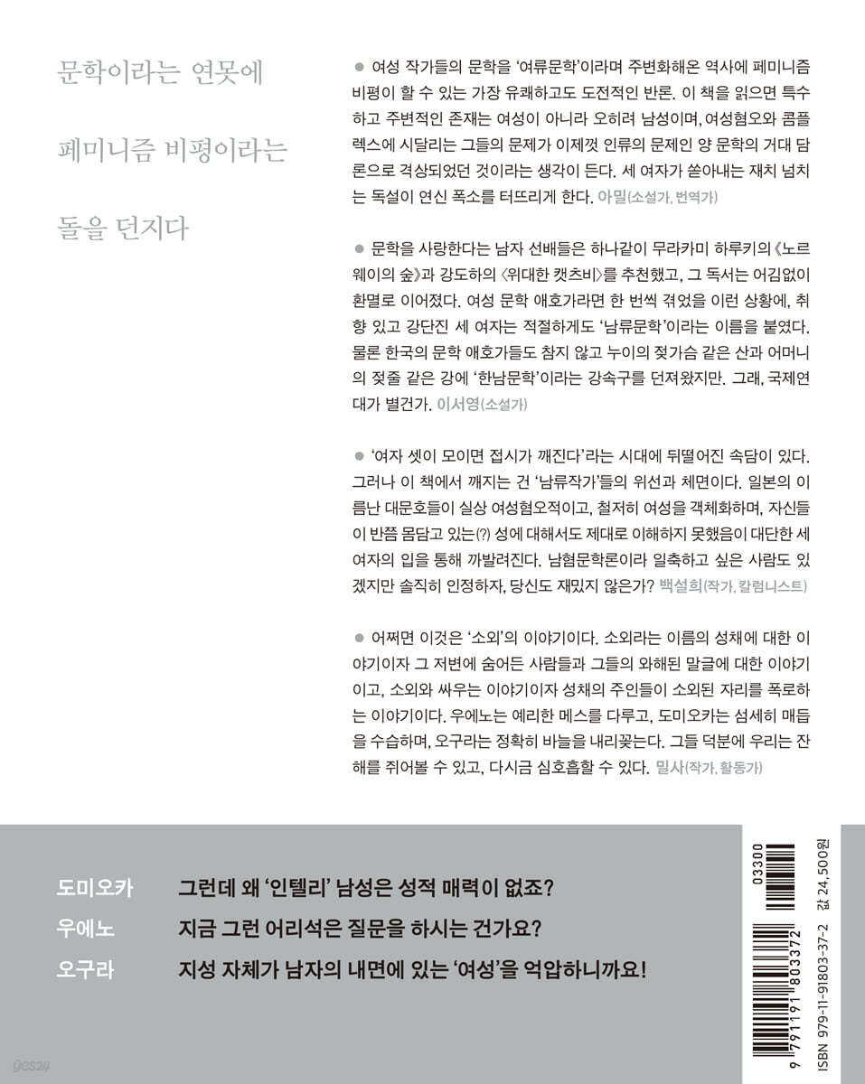 여성 작가들의 문학을 ‘여류문학’이라며 주변화해온 역사에 페미니즘 비평이 할 수 있는 가장 유쾌하고도 도전적인 반론. 이 책을 읽으면 특수하고 주변적인 존재는 여성이 아니라 오히려 남성이며, 여성혐오와 콤플렉스에 시달리는 그들의 문제가 이제껏 인류의 문제인 양 문학의 거대 담론으로 격상되었던 것이라는 생각이 든다. 세 여자가 쏟아내는 재치 넘치는 독설이 연신 폭소를 터뜨리게 한다. - 김지현 (아밀) (소설가, 번역가)
