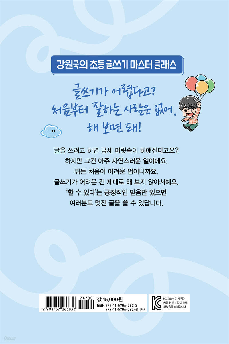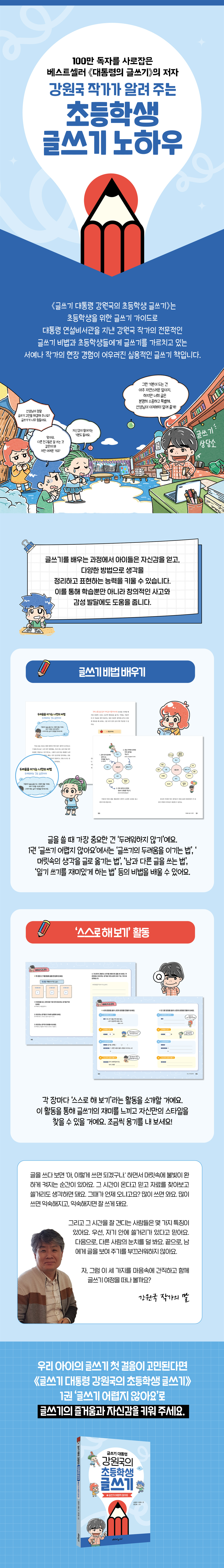 “이제 글쓰기가 어렵지 않아요.” 아이들이 학년이 올라갈수록 부모님에게는 새로운 고민이 하나둘씩 생깁니다. 우리 아이가 학교 공부를 제대로 따라가는지, 친구들과 사이좋게 지내는지, 자신감을 갖고 자기 생각을 잘 표현하는지 염려가 되지요. 이런 고민을 해결할 수 있는 효과적인 방법은 글쓰기를 잘하는 것입니다. 글쓰기는 단순한 기술을 넘어, 자신의 생각을 정리하고 이를 효과적으로 전달하는 중요한 능력입니다. 글쓰기를 배우는 과정에서 아이들은 자신감을 얻고, 다양한 방법으로 생각을 정리하고 표현하는 능력을 키울 수 있습니다. 그러나 아이들은 글쓰기를 어려워합니다. 글쓰기를 할 때 선생님이나 부모님의 눈치를 보는 것은 물론, 구체적으로 어떻게 글쓰기를 시작해야 할지 방법을 몰라서 힘들어 하지요. 《글쓰기 대통령 강원국의 초등학생 글쓰기》는 바로 그런 어린이들을 위해 기획된 실용적인 글쓰기 책입니다. 총 3권으로 구성되어 있습니다. 글쓰기를 처음 시작하는 어린이를 위한 1권 ‘글쓰기 어렵지 않아요’, 글쓰기를 통한 소통의 방법을 배우는 2권 ‘글쓰기로 친구 사이가 좋아졌어요, 설명문과 논설문, 독후감 쓰기까지 다양한 문장을 쓰는 방법을 알려주는 3권 ‘멋진 글을 쓰고 싶어요’입니다. 글을 쓸 때 가장 중요한 건 ‘두려워하지 않는 것’입니다. 《글쓰기 대통령 강원국의 초등학생 글쓰기》 1권 ‘글쓰기 어렵지 않아요’에서는 ‘글쓰기의 두려움을 이기는 법’, ‘머릿속의 생각을 글로 옮기는 법’, ‘남과 다른 글을 쓰는 법’, ‘일기 쓰기를 재미있게 하는 법’ 등의 비법을 배울 수 있습니다. 또 각 장마다 ‘스스로 해 보기’라는 활동을 소개합니다. 이 활동을 통해 글쓰기의 재미를 느끼고 자신만의 스타일을 찾을 수 있게 도와줍니다. 우리 아이의 글쓰기 첫 걸음이 고민된다면 《글쓰기 대통령 강원국의 초등학생 글쓰기》 1권 ‘글쓰기 어렵지 않아요’로 글쓰기의 즐거움과 자신감을 키워주세요. ★ 어린이 책 전문 일러스트레이터가 그린 캐릭터와 삽화 강원국 작가와 아이들의 캐릭터가 등장해 글쓰기 고민을 들려주고 그것을 해결할 수 있는 방법을 흥미롭게 알려줍니다. ★ 설명, 예문, 스스로 해 보기로 구성된 단계별 학습 설명을 듣고 예문을 통해 이해하며 스스로 해 보기를 통해 글쓰기에 대한 두려움을 없애고 업그레이드 할 수 있도록 도와줍니다. |