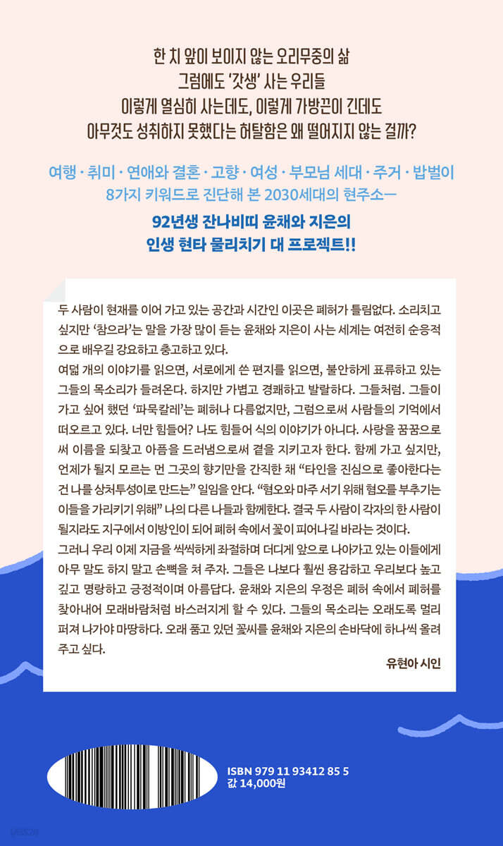 ---pp.9~10 「여행 : 윤채의 이야기」중에서 타인을 진심으로 좋아한다는 건 나를 상처투성이로 만드는 일이다. 하지만, 상처를 받아도 다시 또 웃고 행복해지는 것의 연속이다. 상처와 행복이 공존하면서도 연속되는 이 굴레 속에서, 나는 오늘도 T1 덕질을 한다. 페이커 덕후를 자청한다. 그 이유는… 뭐랄까, 지치고 힘든 일상을 달래 주는 나만의 도파민이랄까. 가끔 아무것도 하고 싶지 않고, 다 놓고 싶을 때가 있는데 페이커를 생각하면 그래, 페이커도 그동안 많은 것을 이겨내 왔고 극복했는데 페이커 팬인 내가 이렇게 주저앉으면 안 되지, 라는 결의가 생긴다. 그리고 다시 으쌰, 하고 일어나게 된다. ---pp.42~43 「취미 : 지은의 이야기」중에서 나는 매년 겨울이 되면 불가항력적으로 우울을 느낀다. 이룬 것이 아무것도 없는데 한 해가 저무는 게 믿기지 않아서 그렇다. 분명 나는 시간을 허투루 쓰지 않는데 왜 나는 나로 인해 고통받지? 나는 과거의 나를 곱씹으며 후회하고 미래의 나를 구상하며 공허해한다. 그렇다고 현재의 내가 미래의 나를 위해 태도를 바꾸진 않는다. 그렇게까지 정열적으로 살고 싶진 않나 보다. 생각도 많고, 공상도 깊으면서 사고(思考)는 뻣뻣한 사람이 바로 나. 이런 내가 책을 쓰며 ‘갓생’을 살고 있다. ---p.50 「취미 : 윤채의 이야기」중에서 그 시기 나는 ‘개오바’라는 말을 입에 달고 살았다(지금도 그렇다). 30시간을 깨어 있다가 딱 하루 쉬고 출근하면서 “개오바”. 돈은 없는데 월급 날까지 한참 남았으면 또 “개오바”. 위염 때문에 병원에 다녀오면서 “개오반데”, 하다가 힘들어서 주변 사람에게 털어놓았다가 버티라는 대답이 돌아오면 “오바임”. 진짜 개오바 같은 포인트는 방송국 생활을 그만둔 지금도 이 개오바 생활이 계속되고 있다는 거다. 다시 문학에 애정을 가지고 돌아온 지금, 나는 뭐라도 닥치는 대로 해야 나중에 밥 먹고 살 수 있다는 생각으로 작은 회사에 일자리를 구했고 대학원에 다니면서 논문과 내 작품을 쓰고, 또 밤을 샜다. 이렇게 열심히 사는데도, 이렇게 가방끈이 긴데도 아무것도 성취하지 못했다는 허탈함은 왜 나에게서 떨어지지 않는 걸까. 이제는 이 감정을 동반자처럼 여기면서 살지 않으면 나의 현실과 미래를 감당할 수 없을 것 같다. ---pp.61~62 「연애와 결혼 : 윤채의 이야기」중에서 단지 연애를 하는 것임에도 불구하고 왜 관계는 한쪽으로 기울어진 시소 같았을까? 나에게서 문제를 찾는다면… 나는 사람을 너무 좋아하니까, 연애를 할 때면 나는 나보다 연인을 더 사랑했으니까. ‘연인’이라는 딱지가 붙은 인간은 내게 프리 패스였으니. 순위를 매기자면 0순위인 거지. ---p.74 「연애와 결혼 : 지은의 이야기」중에서 나는 술자리에서 정치 얘기가 나올 때마다 “정치에 관심 없다”라고 대답하곤 했다. 웃기는 태도였다. 맹목적인 고향 사람들을 한심하게 바라보면서, 아빠에겐 단호하게 진보라 말하겠다 대답했으면서, 정작 많은 사람들 앞에선 회색 지대에 숨어 버리곤 했다. (…중략…) 청소년기 내내 뉴스만 틀면 국회에선 싸움판이 벌어지고 있었다. 말 그대로, 멱살을 잡고 무력을 행사하는 싸움판이었다. 의사봉을 두드리지 못하게 무리를 지어 회의 진행을 막고 있었고, 어떤 이들은 목 놓아 울고 있었다. 무서웠다. 탄핵의 뜻을 몰라서 총알과 핵을 일컫는 말인가 싶었다. ---pp.99~100 「고향 : 윤채의 이야기」중에서 현실과 미래를 향해 바라는 게 참 많은데 누구 하나 들어 줄 어른이 없는 것 같다. 여성 혐오 범죄와 사이버불링(cyberbullying)은 끝이 없고, 처벌도 여전히 미약하다. 이 사실을 언급하는 것도 무섭고……. 그렇다고 회피해 버리기엔 공허해. 직접 부딪히기엔 아프다. 마음 맞는 친구들과 한탄하고 슬퍼하는 수밖에 없어서 인간관계는 좁아져만 가고, 변화를 체념하는 속도는 빨라지기만 한다. 교육받은 대로 가부장적인 삶에 편승하는 건 이제 죽기보다 싫으니, 그냥 망령처럼 떠도는 수밖에. 그렇게라도 내 내면을 지켜야지. ‘원래 그런 삶’을 살지 않기 위해서. ---p.116 「여성 : 윤채의 이야기」중에서 나는 내 스스로를 검열했다. 화가 나고, 수치스럽고, 공포스럽고, 내 잘못이 아님에도 불구하고 애써 외면하고 묻어 뒀다. 이야기를 꺼내면 공감은커녕 내 탓이라는 이야기가 돌아올까 봐. 나를 더럽다고 생각할까 봐. 스스로 피해자라고 생각하면 위축되니까. 내가 나를 피해자라고 칭하면 사람들이 날 큰일을 당한 사람처럼 취급할까 봐. 검열하고 또 검열했다. ---p.128 「여성 : 지은의 이야기」중에서 나도 부모를, 부모도 나를 사랑하지만 그렇다고 해서 내가 상처받았던 게 없던 일이 되지 않는다. 내게 있어 최초의 비수는 부모였다. ---p.136 「부모님 세대 : 지은의 이야기」중에서 2022년, 미친 듯이 금리가 치솟기 시작했다. 한 달에 대출 이자 40만 원을 냈었는데, 금리가 변동되어 60만 원, 80만 원으로 올랐다. 급기야 2023년 5월에는 100만 원을 찍었다. 과장을 보태서 내 월급의 절반이 전세 대출 이자로 나가는 상황이었다. 내 급여는 제자리인데, 금리와 물가가 미친 듯이 치솟으니 한 달 서울살이를 유지하는 데 