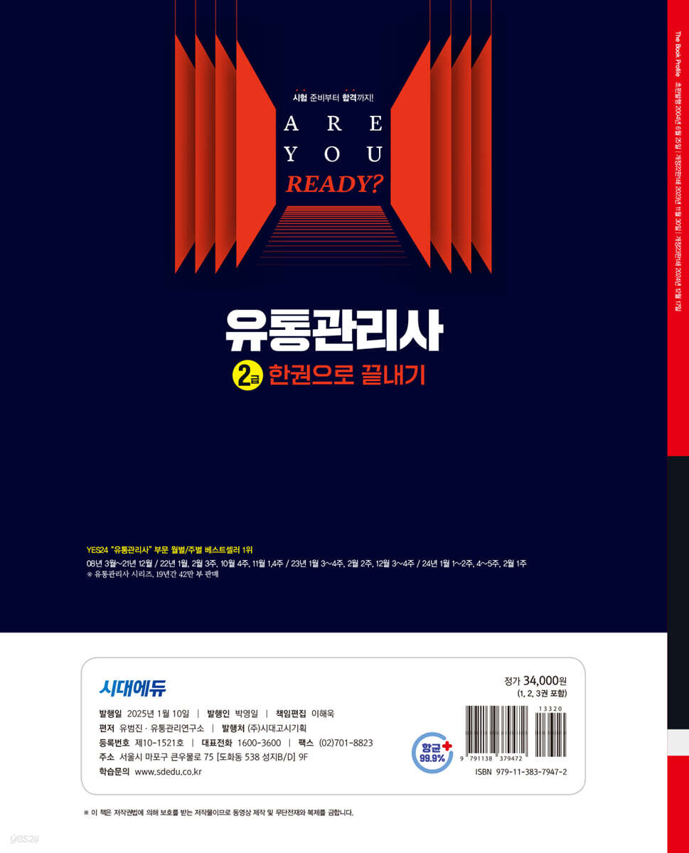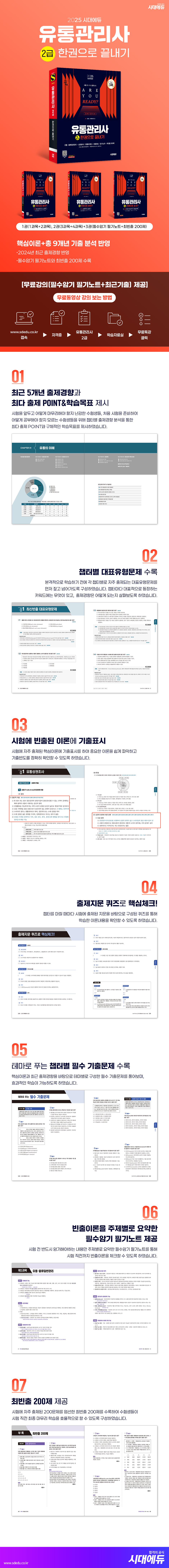도서의 주요 특징은 다음과 같습니다. ① 교재를 1권(1과목+2과목), 2권(3과목+4과목)+3권(필수암기 필기노트+최빈출 200제) 총 3권으로 분권하여 수험생들의 학습효율과 편의를 도모하였습니다. ② 9개년 기출문제 데이터를 분석하여 챕터별로 핵심이론과 필수 기출문제를 선별하여 수록하였습니다. ③ 마지막으로 시험 일주일 전부터 시험 직전까지 빠르게 훑어볼 수 있는 필수암기 필기노트와 최빈출 200제를 부록으로 제공합니다. 2025 도서는 지난 한 해 독자님들이 전해주신 소중한 의견과 질책을 하나하나 새겨듣고 빠짐없이 반영하고자 힘썼습니다. 지난 시간동안 유통관리사를 준비하시는 독자님들 곁을 시대에듀가 함께하였듯이 앞으로도 독자님들의 말 한 마디 한 마디에 귀 기울여 독자님들을 위한 도서를 펴내는 데 힘쓰겠습니다. 진심으로 독자님들의 합격을 기원하겠습니다. |