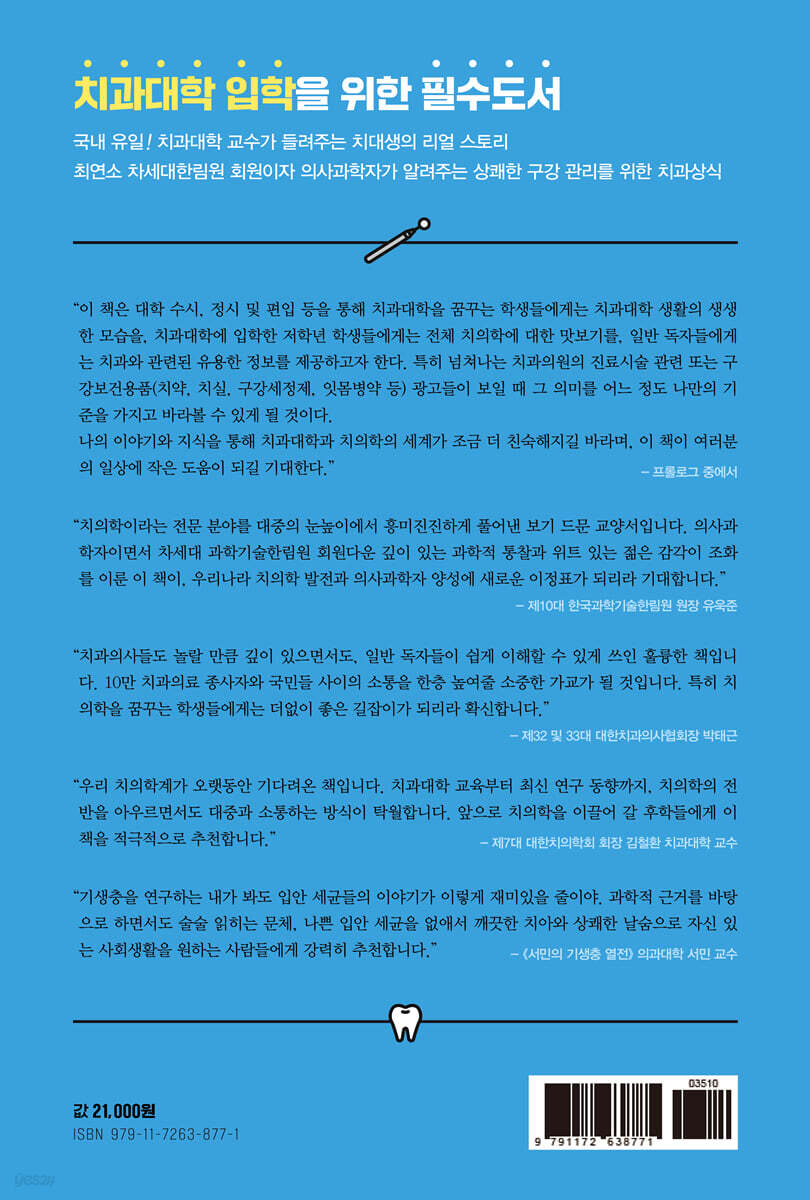 “우리 치의학계가 오랫동안 기다려온 책입니다. 치과대학 교육부터 최신 연구 동향까지, 치의학의 전반을 아우르면서도 대중과 소통하는 방식이 탁월합니다. 앞으로 치의학을 이끌어 갈 후학들에게 이 책을 적극적으로 추천합니다.”