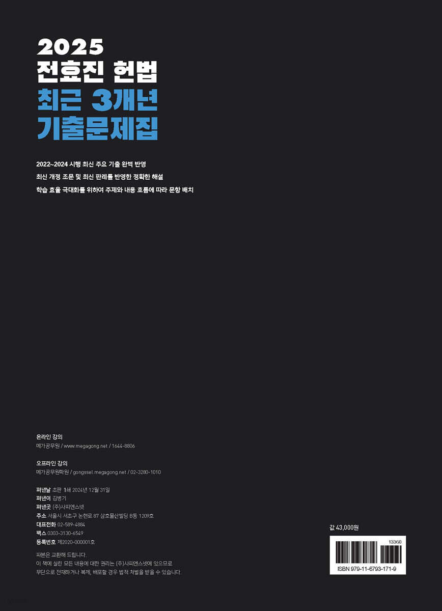 『2025 전효진 헌법 최근 3개년 기출문제집』은 2022~2024년의 최근 3개년 최신 헌법 기출문제를 모두 수록하였습니다. 기본서와 연계하여 기본서의 내용을 샅샅이 털어낼 수 있도록 집필하였으며, 이 점은 본 교재의 가장 확실한 특장점입니다. 기본서로 이론을 끝낸 후에 본 교재로 자세히 공부한다면 기본서가 더 강력한 수험 무기가 될 것입니다.