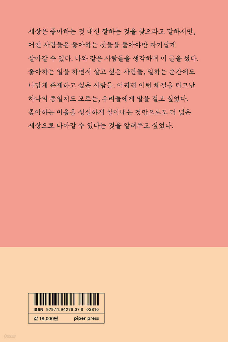 --- 「성실하게 좋아할 때에만 알 수 있는 것」 중에서 진실된 인터뷰를 하려면 인터뷰어와 인터뷰이가 서로를 믿고 내맡기는 관계가 되어야만 한다. 나의 인터뷰는 이러한 교감의 순간들 사이에서 성장해 왔다. 그리고 김사월은 나에게 가장 완벽한 인터뷰이였다. 그와의 대화 속에서 여러 번 감동을 넘어 희열을 느꼈다. --- 「김사월: 인생의 사랑은 나 자신이어야 해요」 중에서 첫 직장에서 나는 정규직이 되지 못했다. 실장님과의 면담이 끝나고 작은 상자 하나에 짐을 넣어 내려와 리셉션에 사원증을 반납하고 뒤를 돌아보았다. 달팽이도 제가 지나온 길에 흔적을 남긴다는데 내가 걸어온 길에는 그 어떤 흔적도 보이지 않는 것 같았다. 노력과 열정이 지나간 자리엔 투명한 슬픔만 남았다. 하지만 이 건물 어디에도 나와 함께 울어줄 사람은 없었다. --- 「이 노력의 끝에는 뭐가 있을까」 중에서 3년 반을 다니던 회사를 그만두기로 결심했던 이유는 재미가 없어서였다. ‘회사를 재미로 다니냐’며 철없는 소리한다고 혀를 차는 분들이 있을 것 같다. 나에게 재미란 일하는 동력이고, 존재하는 이유다. 순간의 즐거움이 아니라, 삶의 철학과 같은 것이다. --- 「좋아하는 것을 살아내기」 중에서 무언가 더 거창한 글을 쓰고 싶었다. 촌철살인의 메시지로 사람들의 뇌리에 남고 싶었다. 나는 여전히 내 글이 가볍다고, 멋이 없다고 생각하곤 한다. 끊임없이 질문하게 된다. 내가 쓴 글은 깊이가 부족한 것 아닐까? --- 「깊이에 관하여」 중에서 고백하자면, 나는 흔히 말하는 ‘무지성’으로 새로움을 찾아 헤맨 적이 많다. 영감을 받기 위해, 잘 풀리지 않는 일과 글을 풀어내기 위해 외부의 자극을 찾아 여기저기를 기웃거렸다. --- 「실리카겔: 우리 자신이 레퍼런스가 되는 거죠」 중에서 나는 기획자이자 평론가로서 언제나 정확하게 음악을 사랑하는 법에 대해 늘 고민하고 자문한다. 나는 이 음악을 정확하게 알고 있는가, 정확한 앎을 바탕으로 사랑하는가. 곡을 만든 아티스트와 같은 답을 내놓지는 못하겠지만, 평론가로서 나는 음악에 대한 나만의 해석을 통해 스스로를 정확하게 이해시킨 뒤 사랑해야 할 의무가 있다. 정확하게 사랑하지 못하면 어떻게 이 음악을 타인에게 알릴 수 있을 것인가. --- 「정확하게 사랑할 의무」 중에서 인터뷰에서 코토네가 했던 말이다. 내가 얻은 용기를 다른 사람들에게 돌려줄 수 있다는 말. 어쩌면 우리가 일을 하고, 직업을 갖는 중요한 이유가 아닐까 생각했다. --- 「트리플에스: 어떤 상황이 닥쳐오더라도, 나 자신을 잃지 말자」 중에서 쉽게 정의 내리고 재단하는 세상에서 단어 하나를 두고 고민하는 사람, 한로로는 한 편의 단편 소설, 에세이 혹은 시를 쓰고 그 속에서 마음에 드는 구절을 뽑아 가사를 만든다고 했다. 음악으로 전하고 싶은 메시지가 분명해야만 좋은 곡이 나온다고 말했다. 자신이 부르는 노래 가사의 단어 하나 하나에 담긴 힘을 잘 알고 있는 사람이었다. --- 「한로로: 우리는 삶의 공동체 안에서 사랑해야 하니까요」 중에서 공연장에서 나는 일종의 성스러움을 느낀다. 공연은 희생의 연속이다. 비용을 지불하고 티켓을 구매한 뒤, 몇 달을 기다려 현장에 가면, 티켓을 교환하고 줄을 서고, 복도를 따라 천천히 입장한다. 길게는 몇 시간을 거쳐 들어간 공연장을 가득 채운, 기다리는 사람들의 모습. 설레는 마음이 절정에 달할 무렵, 조도가 낮아지고, 일순간에 무대가 밝아짐과 동시에 터지는 사람들의 함성. 고행에 가까운 기다림의 끝에 관객들은 소름 돋는 희열을 만난다. --- 「음악의 쓰임」 중에서 나에게 가장 중요한 것은 더 많이 좋아하는 것이다. 더 높은 자리, 더 많은 돈을 원하는 사람들도 있겠지만 내 기준은 그렇다. 내가 추구하는 멋짐은 무언가를 많이 좋아하고 좋아하는 것들과 함께 사는 모습이다. 그렇게 좀 더 멋진 나를 꿈꾸며 좋아하는 것들을 찾아나가다 보니 지금의 자리에 와있다. 출발선에서는 전혀 상상하지 못했던 음악 콘텐츠 기획자이자 평론가라는 직업을 갖고 일한다. 막연히 동경해 온 사람들의 아름다움을 발견하며 살아간다. 어린 시절 단 한 번도 꿈꾼 적 없는 일이다. --- 「에필로그. 순간은 영원하다」 중에서 |