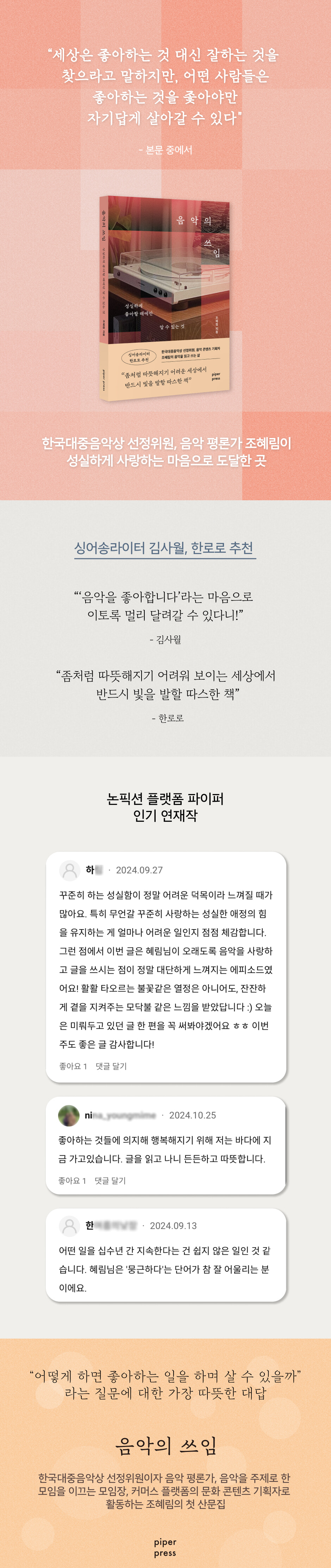 음악을 향한 짙은 애정에서 피어나는 따스한 시선이 가득 담긴 이 책은 좀처럼 따뜻해지기 어려워 보이는 세상에서 반드시 빛을 발할 거예요. - 한로로 (싱어송라이터)