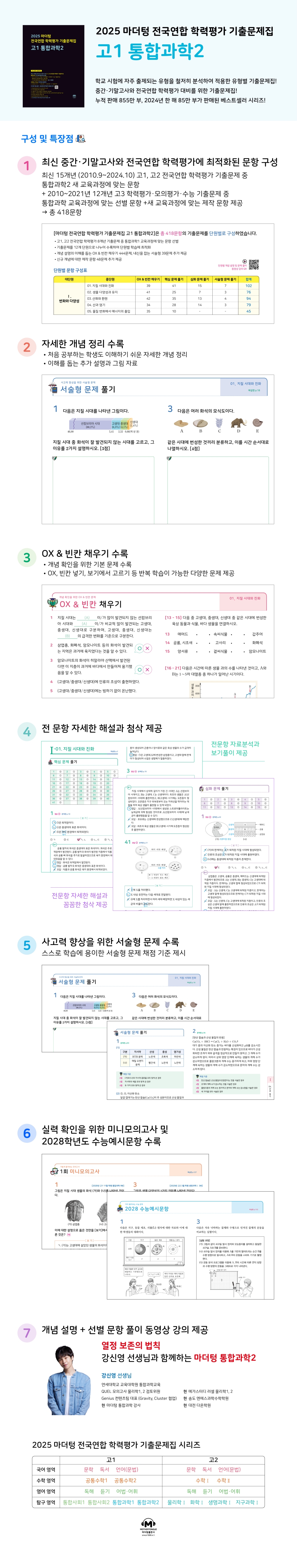 01. 지질 시대와 진화 02. 생물 다양성과 유지 03. 산화와 환원 04. 산과 염기 05. 물질 변화에서 에너지의 출입 Ⅱ. 환경과 에너지 01. 생태계와 환경 02. 지구 환경 변화 03. 태양 에너지의 생성과 전환 04. 전기 에너지의 생산 05. 에너지의 효율과 신재생 에너지 Ⅲ. 과학과 미래 사회 01. 과학 기술의 활용 02. 과학 기술의 발전과 쟁점 미니모의고사 1회 미니모의고사 2회 수능 예시문항 |