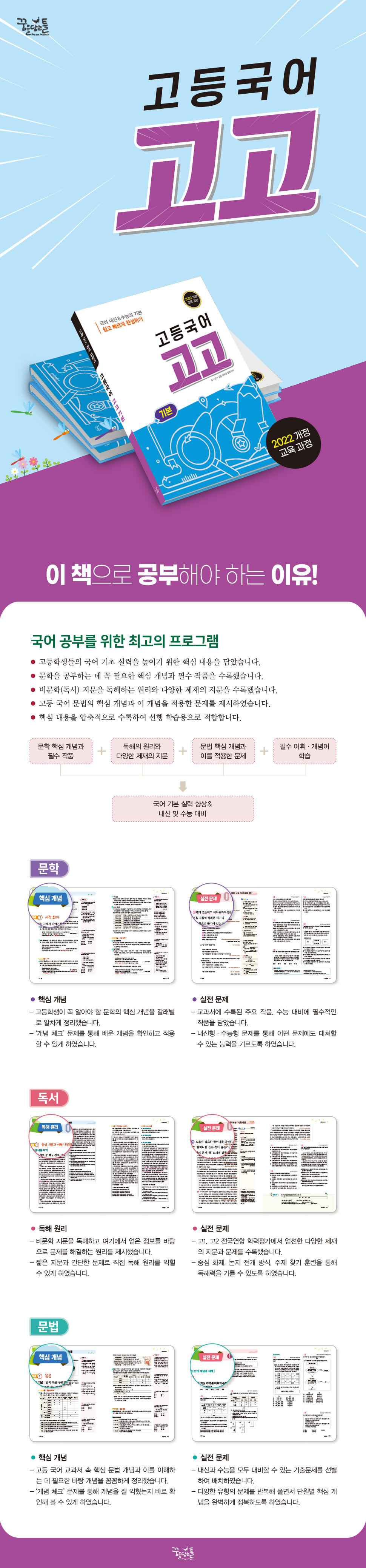 · 핵심 개념 - 고등학생이 꼭 알아야 할 문학의 핵심 개념을 갈래별로 알차게 정리했습니다. - ‘개념 체크’ 문제를 통해 배운 개념을 확인하고 적용할 수 있게 하였습니다. · 실전 문제 - 교과서에 수록된 주요 작품, 수능 대비에 필수적인 작품을 담았습니다. - 내신형·수능형 문제를 통해 어떤 문제에도 대처할 수 있는 능력을 기르도록 하였습니다. [독서] · 독해 원리 - 비문학 지문을 독해하고 여기에서 얻은 정보를 바탕으로 문제를 해결하는 원리를 제시했습니다. - 짧은 지문과 간단한 문제로 직접 독해 원리를 익힐 수 있게 하였습니다. · 실전 문제 - 고1, 고2 전국연합 학력평가에서 엄선한 다양한 제재의 지문과 문제를 수록했습니다. - 중심 화제, 논지 전개 방식, 주제 찾기 훈련을 통해 독해력을 기를 수 있도록 하였습니다. [문법] · 핵심 개념 - 고등 국어 교과서 속 핵심 문법 개념과 이를 이해하는 데 필요한 바탕 개념을 꼼꼼하게 정리했습니다. - ‘개념 체크’ 문제를 통해 개념을 잘 익혔는지 바로 확인해 볼 수 있게 하였습니다. · 실전 문제 - 내신과 수능을 모두 대비할 수 있는 기출문제를 선별하여 배치하였습니다. - 다양한 유형의 문제를 반복해 풀면서 단원별 핵심 개념을 완벽하게 정복하도록 하였습니다. |