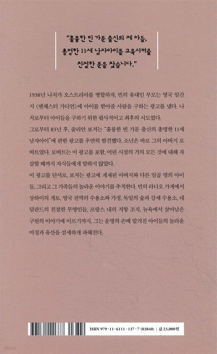 조상 대대로 오스트리아에 살며 그곳을 자신의 조국으로 생각해온 빈의 유대인들에게 나치의 오스트리아 합병은 모든 걸 파괴하는 근원적 파국이었다. 유대인이라는 이유로 하루아침에 이웃으로부터 고발당하고 생존 자체가 위태롭게 되자, 부모들은 어린 자식이라도 해외로 탈출시킬 방안을 다방면으로 모색했다. 본인들의 안위도 위태로웠으나 해외에 연고가 있지 않으면 이주 허가를 받기가 어려웠을 뿐만 아니라 삶의 터전을 정리하고 옮겨가는 게 그리 간단한 일이 아니었기에, 시시각각 다가오는 죽음의 위협으로부터 아이라도 우선 살려야 한다고 판단한 것이다. 아이 먼저 탈출시키고, 뒤따라 자신들도 탈출하여 가족이 재결합하겠다는 것이 그들의 계획이자 당연한 희망이었다. 1938년, 빈의 유대인공동체 조직인 IKG의 기획하에, 빈과 오랫동안 섬유무역으로 유대관계가 있던 영국 맨체스터를 우선 대상지로, 빈의 유대인 부모들은 그곳의 일간지 〈맨체스터 가디언〉에 광고를 게재하기 시작했다. 대개 11~14세인 자신들의 아이를 교육시켜줄 ‘친절한 분’을 찾는다는 광고였다. 명분은 교육이었으나 받아주기만을 간구하는 절실한 기도였다. 그사이 아이들은 서둘러 영어를 배우고, 부모들은 타국에서 구직할 때 도움 될 기술들을 익혔다. 한 달 두 달을 애태우며 기다린 끝에 영국 가정과 연결된 아이는 홀로 무거운 짐가방을 들고 빈을 떠나 기차를 타고 영국 땅으로 건너갔고, 그곳에서 만난 가정에서 짧게는 몇 달부터, 길게는 성인이 될 때까지 성장했다. 부모도 가까스로 탈출하여 가족이 다시 만난 경우는 매우 행운이었지만, 애타게 기다리던 부모가 수용소로 끌려가 죽었다는 소식을 몇 년 후에야 듣게 된 경우가 대부분이었다. 홀로코스트에서 아이 본인들은 그나마 살아남았으니 다행이라고 해야 할까. 하지만 그 아이들의 삶을 들여다보면, 그렇게 말하기가 쉽지 않다. 그 광고는 아이들에게 생명의 연결줄이기도 했지만, 동시에 가족으로부터 떼어내 낯선 세계로 몰고 와 혼자 길을 찾아가라고 떼미는 격류였으니까. 이 책은 광기의 시대인 1938년 여름 〈맨체스터 가디언〉에 “훌륭한 빈 가문 출신의 총명한 11세 남자아이”로 광고된 로베르트 보거를 비롯한 일곱 명의 아이들에 관한 이야기이자, 개인의 잊힌 역사에 관한 생생한 기록이다. 빈의 유대인 아이들이 홀로코스트에서 탈출할 수 있게 해준 광고 1938년 나치가 빈을 병합한 후, 저자의 아버지 보비 보거가 길거리에서 나치 돌격대에 뒤쫓긴 사건이 발생하자 할아버지인 레오는 무슨 수를 써서라도 아들을 빈에서 내보낼 각오를 했다. “훌륭한 빈 가문 출신의 제 아들, 총명한 11세 남자아이를 교육시켜줄” 친절한 분을 찾는다는 할아버지의 호소는 그런 유의 광고가 줄을 잇기 시작한 초기에 〈맨체스터 가디언〉에 게재됐다. 발 빠른 실행 덕분에, 그 광고는 나치 피해자들을 도울 길을 찾고 있던 영국 케어나폰의 빙글리 부부의 눈에 띄었다. 이 부부는 여름휴가 동안 갈 곳 없어진 유대인 선생을 집에 들여 머물게 했고, 뭐든 더 할 수 있기를 간구하던 참이었다. 영국과 오스트리아의 두 가정 사이에 서신 교환이 시작됐고, 양측이 서로를 안심시킬 사진들을 보냈으며, 동시에 빙글리 부부는 곧바로 보비의 비자취득 절차를 진행했고, 레오는 아들의 기차표와 여객선표 비용을 장만했다. 그렇게 영국으로 건너간 보비는 가난하지만 성실한 빙글리 부부의 집에서 성장하며 장학금 수혜자로 명문대학에 입학까지 했으나, 그때부터 감춰졌던 트라우마가 발현되기 시작했다. 결국, 결혼하여 자식을 보고 대학교수도 된 그의 삶은 오십대 중반의 나이에 자살이라는 형태로 끝을 맺었다. 빈을 탈출한 지 사십오 년이 지났을 때였다.나치로부터의 탈출과 성장기의 고난에 대해 거의 듣지 못하고 자랐던 자식들에게 아버지의 죽음은 참으로 이해하기 힘든 일이었다. 평범한 영국 시민으로 살고자 했던 아버지의 삶이 서서히 잊히던 어느 날, 저자는 우연한 기회에 광고 한 토막을 보게 되고, “훌륭한 빈 가문 출신의 제 아들, 총명한 11세 남자아이”가 자신의 아버지를 가리키는 것임을 알게 된다. 그 광고를 계기로, 그는 가족의 기억을 파헤치고 전 세계 여러 지역의 회고록, 웹사이트, 기록 보관소를 조사하기 시작한다. 낯선 이들의 친절, 극복하지 못한 트라우마 이 책에는 보비 버거 외에 일곱 명의 아이들이 더 등장한다. 〈맨체스터 가디언〉의 후신인 〈가디언〉의 기자가 된 저자는 수많은 이메일과 통화와 자료 조사를 통해 이 아이들의 흔적을 찾아내고 그들의 이야기를 탐색했다. 대부분 고인이 되었지만, 생존해있는 목격자와도 연결되어 귀한 얘기를 듣는 행운도 있었다. 신문의 3행짜리 광고 이면에 감추어진 이야기들은 영국에서 이스라엘, 프랑스, 미국, 상하이로 광범위하게 퍼져나갔고, 무수한 인연과 우연으로 얽혀졌다. 14세 소년으로 광고되었던 조지 맨들러는 낯선 곳에서 새 언어를 배우고 새 학교에 적응하는 와중에 부모와 여동생을 빈에서 탈출시켜야 하는 책임도 지고 있었다. 그는 회고록에 “이런 회상의 순간, 나는 