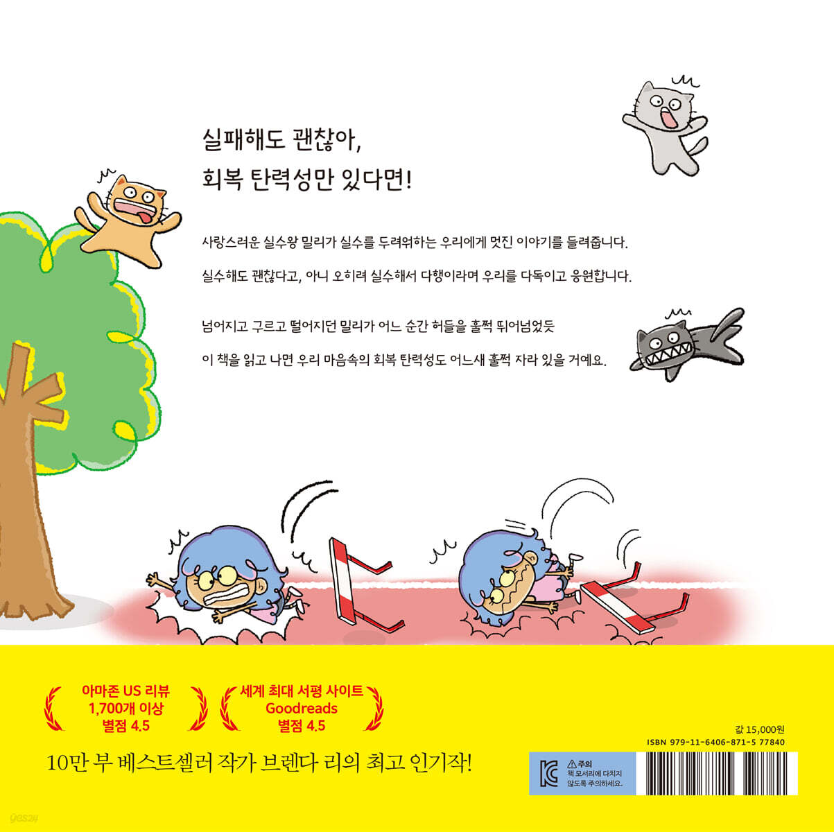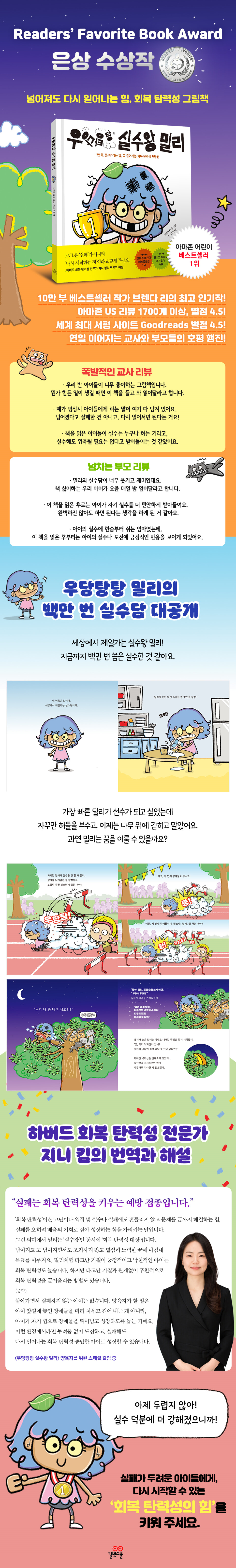 매일 온 집 안에 울려 퍼지는 소리 “안 돼”, “싫어”! 신발이 잘 안 들어간다고 “안 돼!” 잘 모르는 게 나오면 책을 덮어버리며 “싫어!” 한두 번만 실패해도 원하는 대로 되지 않는다고 울고 짜증 내며 그만두는 아이. 무엇이 문제일까요? 어떻게 해 주면 될까요? 우리가 보기에는 쉬워 보이는 일도, 아이들에게는 어렵습니다. 아직 모든 것이 새롭고, 배워나가는 중인 아이들이잖아요. 이때 아이들에게 알려줘야 하는 것이 실패를 ‘잘’ 하는 법입니다. 실패는 누구나 겪습니다. 실패를 안 하는 법이 아니라, 실패를 잘 하는 법을 배운 아이는 앞으로 어떤 힘든 일을 만나도 다시 일어날 수 있습니다. 실패를 ‘잘’ 하는 방법, 바로 ‘회복 탄력성’입니다. 신발이 잘 안 들어가도 “괜찮아, 다시 하면 돼!”를 외치고 다시 시도하는 아이, 잘 모르는 게 나오면 “엄마, 이게 뭐예요? 알려주세요.” 도움을 요청하는 아이. 모두 ‘회복 탄력성’이 강한 아이이기에 할 수 있는 행동들입니다. 일상 속 작은 실패를 통해 ‘회복 탄력성’을 키워 극복하는 연습을 한다면, 앞으로 마주칠 수 있는 큰 실패도 수월하게 넘길 수 있게 됩니다. 공부할 때와 인간관계뿐만 아니라, 인생의 어떤 일에서도 성공할 수 있게 해 주는 비밀 무기, ‘회복 탄력성’을 아이에게 선물해 주세요. ▷ 교육 전문가의 특별 해설 수록! “실패는 회복 탄력성을 키우는 예방접종입니다.” ‘회복 탄력성’이란 고난이나 역경 및 실수나 실패에도 흔들리지 않고 문제를 끝까지 해결하는 힘, 실패를 오히려 배움의 기회로 삼아 성장하는 힘을 가리키는 말입니다. 그런 의미에서 밀리는 ‘실수왕’인 동시에 ‘회복 탄력성 대장’이라 할 수 있어요. 넘어지고 또 넘어지면서도 포기하지 않고 열심히 노력한 끝에 마침내 목표를 이루지요. 저는 평소 실패(FAIL)을 ‘배우기 위한 첫 시도(First Attempt In Learning)’으로 해석하곤 합니다. 밀리의 이야기를 읽으며 실패와 성장은 서로 반대말이 아님을 다시 한번 실감했어요. 밀리처럼 타고난 기질이 긍정적이고 낙천적인 아이는 회복 탄력성도 높습니다. 하지만 선천적 기질과 관계없이 후천적으로 회복 탄력성을 끌어올리는 방법도 있습니다. (중략) 실패하지 않고 살 수 있는 아이는 없습니다. (중략) 아이가 실패할 때마다 위로하고 응원하고 지지해 주세요. 이런 환경에서라면 두려움 없이 도전하고, 실패해도 다시 일어서는 회복 탄력성 충만한 아이로 성장할 수 있습니다. ▷ 미국 교사와 학부모들이 인증한 도서! ▶ 폭발적인 교사 리뷰! 미국에서 교육 자료로 쓰이는 책 - 우리 반 아이들이 너무 좋아하는 그림책입니다. 뭔가 힘든 일이 생길 때면 이 책을 들고 와 읽어달라고 합니다. - 제가 평상시 아이들에게 하는 말이 여기 다 담겨 있어요. 넘어졌다고 실패한 건 아니고, 다시 일어서면 된다는 거요! - 책을 읽은 아이들이 실수는 누구나 하는 거라고, 실수해도 위축될 필요는 없다고 받아들이는 것 같았어요. ▶ 넘치는 부모 리뷰! 미국 학부모들이 인정한 회복 탄력성을 높여주는 책 - 밀리의 실수담이 너무 웃기고 재미있대요. 책 싫어하는 우리 아이가 요즘 매일 밤 읽어달라고 합니다. - 이 책을 읽은 후로는 아이가 자기 실수를 더 편안하게 받아들여요. 완벽하진 않아도 하면 된다는 생각을 하게 된 거 같아요. - 아이의 실수에 한숨부터 쉬는 엄마였는데, 이 책을 읽은 후부터는 아이의 실수나 도전에 긍정적인 반응을 보이게 되었어요. |