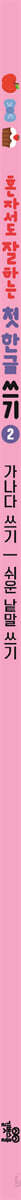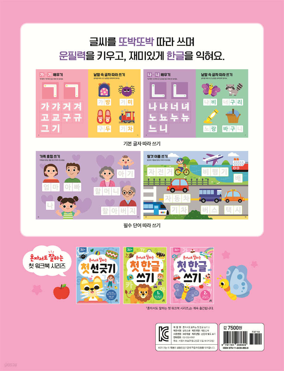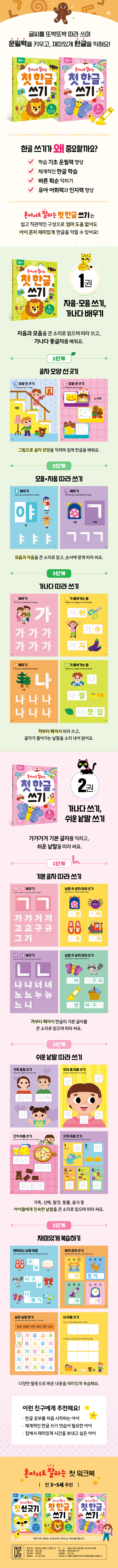 화살표와 회색 선에 맞춰 따라 쓰기만 하면 어느새 한글을 쓸 수 있게 돼요. 가이드가 직관적이고 친절하게 구성되어 있어 엄마 도움 없이도 얼마든지 혼자서 할 수 있어요. 가가거겨 한글의 기본 글자를 익혀요 ‘가~기’부터 ‘하~히’까지 한글의 기본 글자를 큰 소리로 읽으면서 따라 써요. 또 해당 글자가 들어간 낱말을 따라 쓰며 한 번 더 복습하면 확실하게 글자를 익힐 수 있어요. 화려하고 세련된 그림과 함께 쉽고 친숙한 낱말을 따라 써요 가족, 신체, 음식, 동물, 곤충, 내 물건, 색깔, 숫자 등 아이 주변에서 친숙하게 볼 수 있는 낱말들을 따라 쓰다 보면 한글을 재미있게 익힐 수 있고 인지력도 좋아져요. 모든 낱말은 그림으로 표현하여 이해하기 쉽게 했어요. 큼직큼직한 쓰기 칸으로 바른 글씨를 연습해요 어려운 글자는 충분히 써 볼 수 있도록 큼직큼직한 쓰기 칸을 많이 마련했어요. 모든 글자에는 쓰는 순서와 방향을 표시해 바르게 글씨 쓰는 방법도 배울 수 있답니다. 마지막으로 내 이름과 가족의 이름까지 직접 써 보며 뿌듯한 성취감을 느껴 보세요. |
