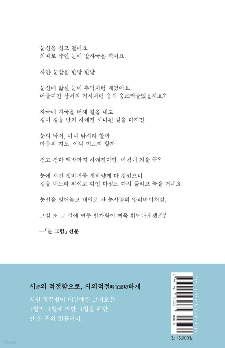 1월 1일 에세이 상자를 여는 마음 … 11 1월 2일 시 우리집에 온 곰 … 17 1월 3일 에세이 별과 벌, 그리고 발 … 21 1월 4일 에세이 옛날이야기 하나를 들려드리겠습니다 … 27 1월 5일 에세이 단짝과 단편들 … 33 1월 6일 에세이 나무의 미라 … 41 1월 7일 시 눈 그림 … 45 1월 8일 에세이 지나가고 지나가는 … 49 1월 9일 시 웅크레주름구릉 … 53 1월 10일 에세이 웅크레주름구릉에 사는 흰센머리쪼글할머니누나 … 57 1월 11일 시 언니야 우리는 … 65 1월 12일 시 강그라 가르추 … 71 1월 13일 에세이 뽀또가 왔다, 그리고 장비가 왔다 … 75 1월 14일 에세이 이제 새를 노래해도 되겠습니까? … 81 1월 15일 에세이 얼음덩어리를 발목에 매단 채 비틀거리며 걷던 두루미를 떠올리며 … 89 1월 16일 에세이 물그림자 … 93 1월 17일 시 누군가는 사랑이라 하고 누군가는 사랑이 아니라고 한다 … 97 1월 18일 시 까치밥은 어디에? … 101 1월 19일 에세이 맑고 멀고 그리하여 쓸쓸한 … 105 1월 20일 에세이 세상에서 제일 낮은 어깨를 닮은 서귀포 돌담 … 117 1월 21일 에세이 전생이 나무였을 것만 같아 … 125 1월 22일 시 함박눈이 그렇게 백색의 점묘화를 그리던 한밤 내 … 131 1월 23일 에세이 내 청춘의 격렬비열도 … 135 1월 24일 에세이 철길이 철길인 것은 … 143 1월 25일 에세이 과골삼천, 휘리릭 … 147 1월 26일 에세이 유리병에 시를 모아 담는 마음으로 … 153 1월 27일 시 고로쇠 한철 … 163 1월 28일 에세이 사랑은 어떻게 오는가 … 167 1월 29일 에세이 우리 마음을 ‘설’게 나누는, 설날! … 173 1월 30일 에세이 괜찮아, 괜, 찮, 아, 괜…찮…아…… … 179 1월 31일 에세이 2월이 오는 소리 … 187 |